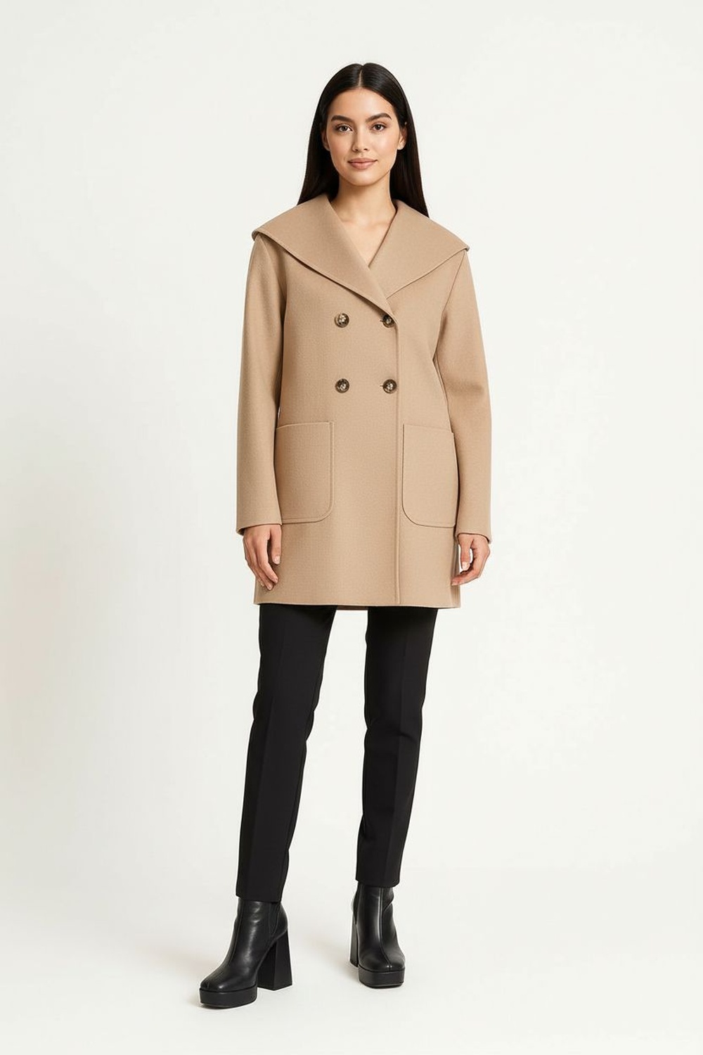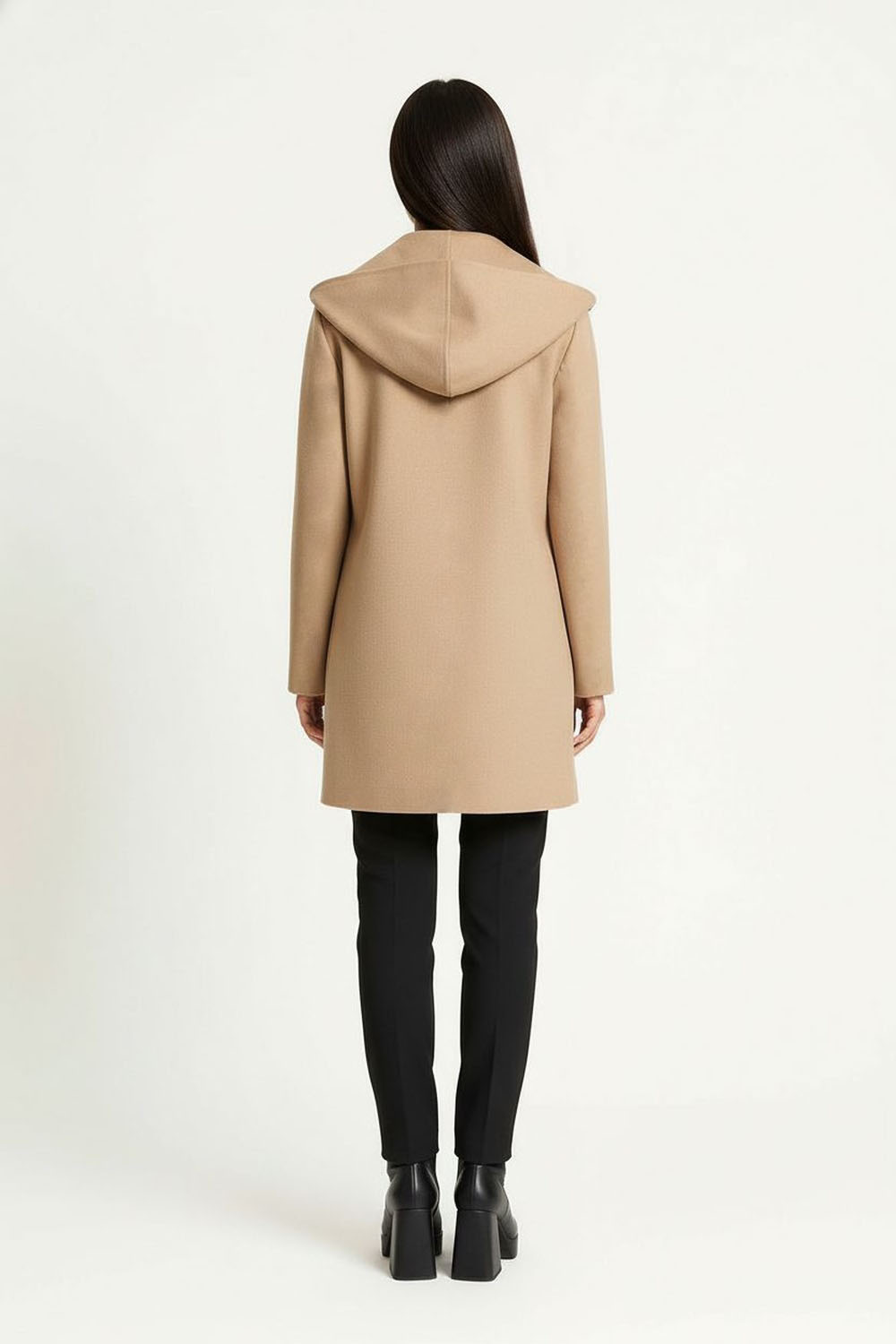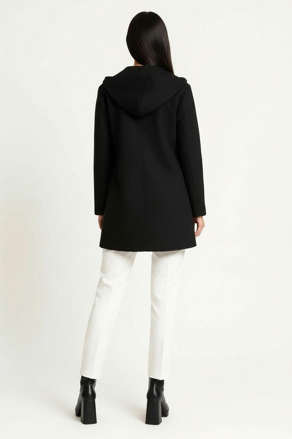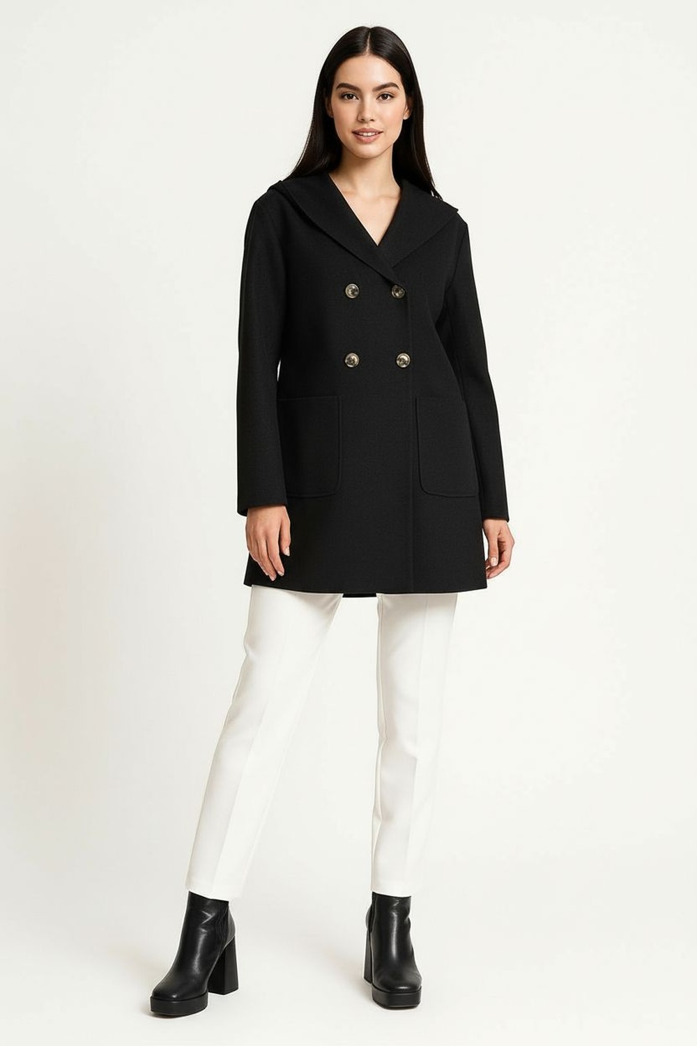 Abrigo cruzado con botones frontales grandes, capucha amplia de caída natural, bolsas delanteras tipo parche, corte recto que aporta comodidad sin perder estructura, confección en tela gruesa que brinda calidez y estilo sofisticado para clima frío