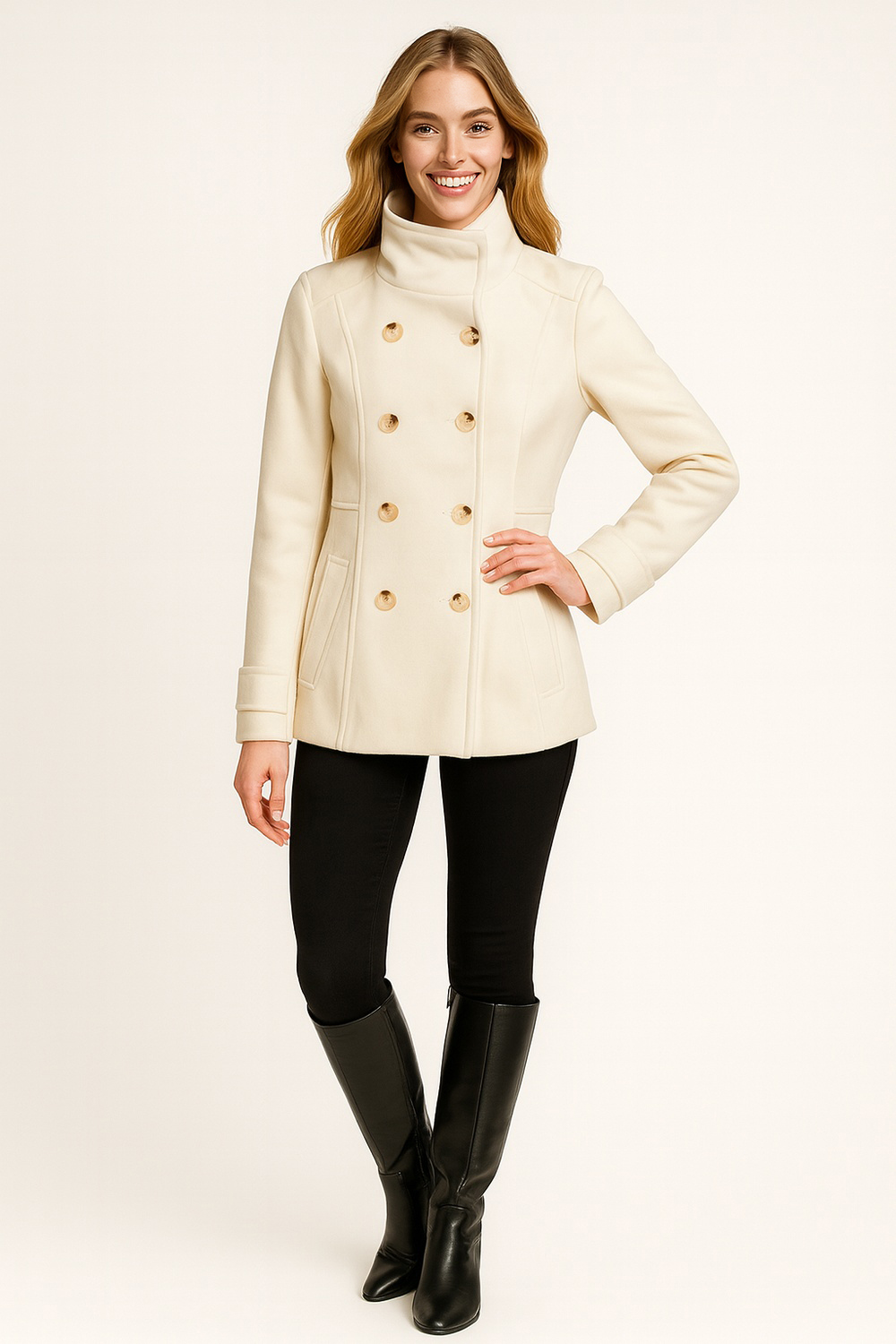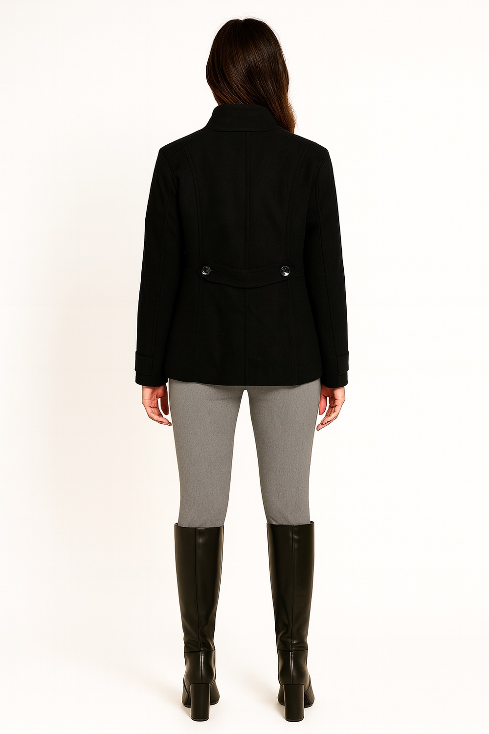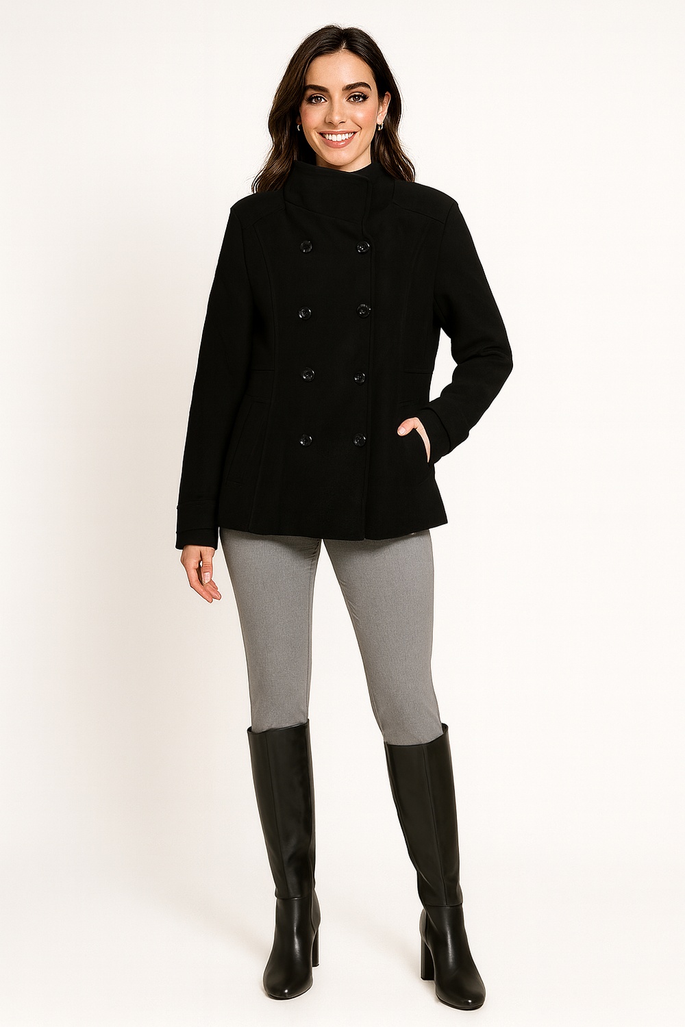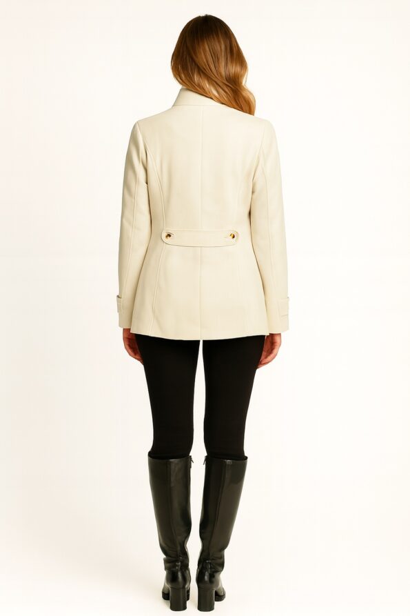 Abrigo de manga larga con diseño cruzado que aporta elegancia y estilo clásico, cuello mao alto que brinda mayor abrigo y sofisticación, botonadura doble al frente que realza el diseño y asegura mejor ajuste, bolsillos laterales funcionales que ofrecen practicidad, confección en tela estructurada que garantiza comodidad y durabilidad