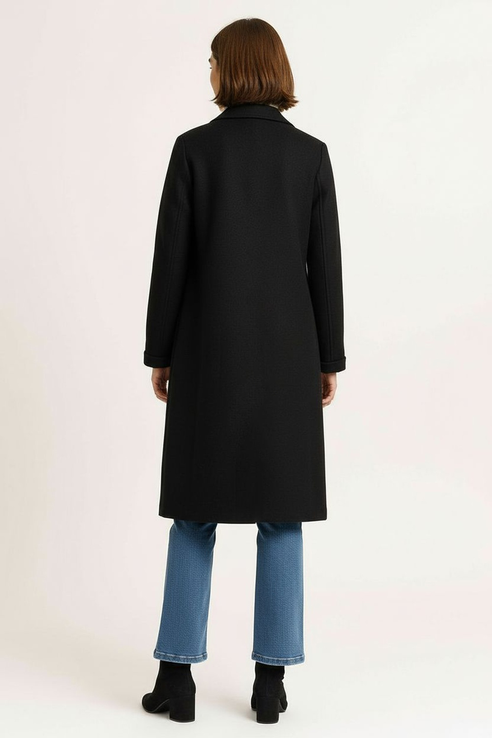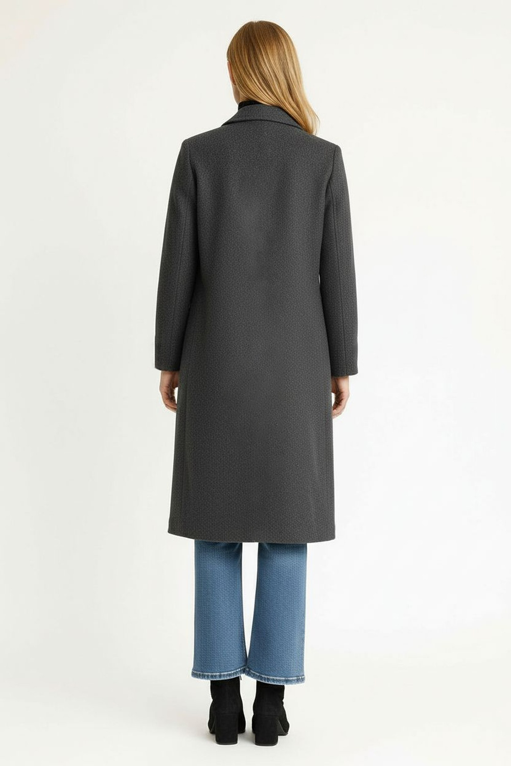 Abrigo largo de corte oversize que ofrece un estilo sofisticado y moderno, solapa amplia con estructura definida que aporta elegancia, cierre frontal con botón que brinda practicidad, bolsas laterales con solapa que añaden funcionalidad, confección en tejido firme que asegura abrigo y confort