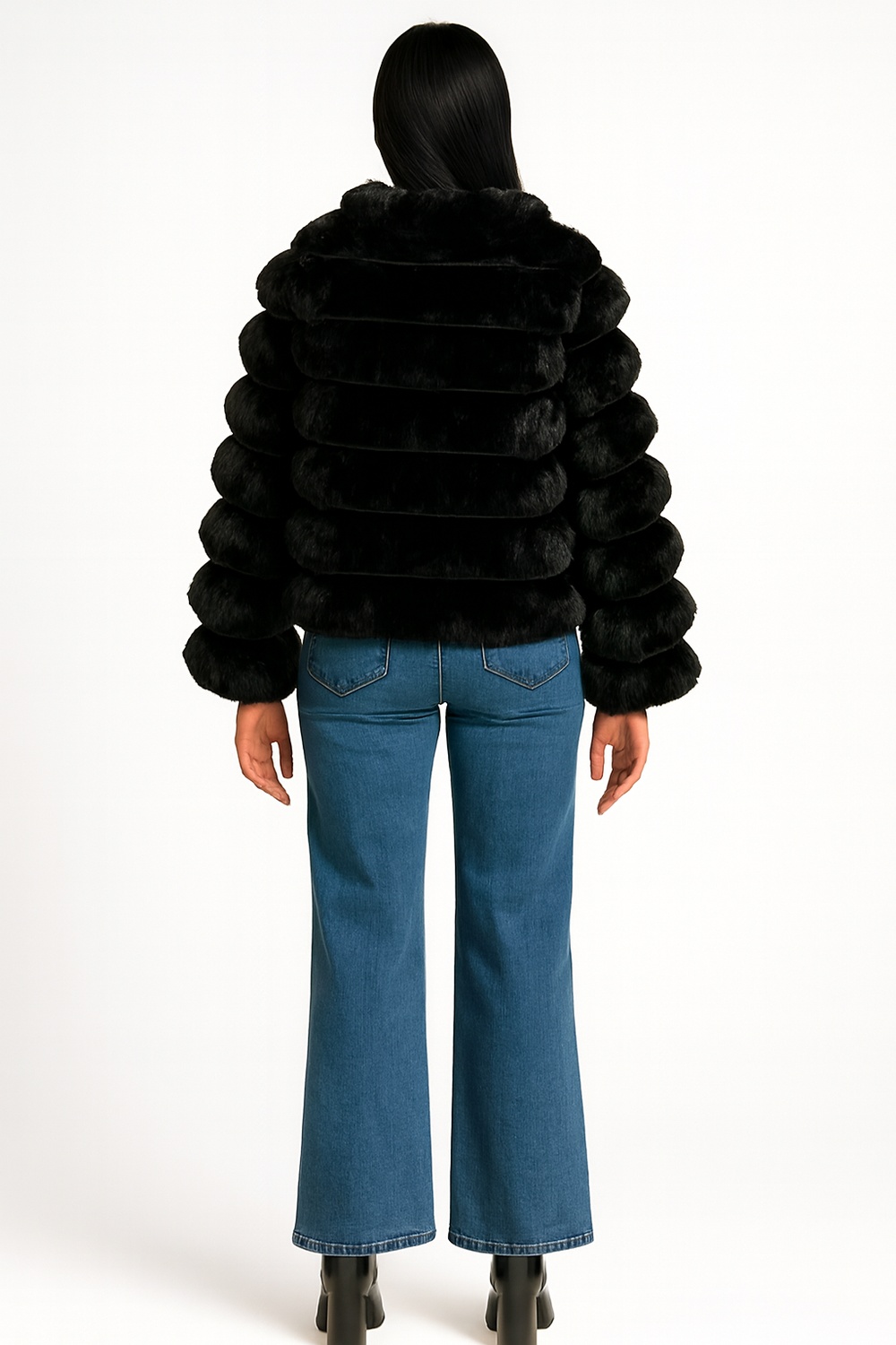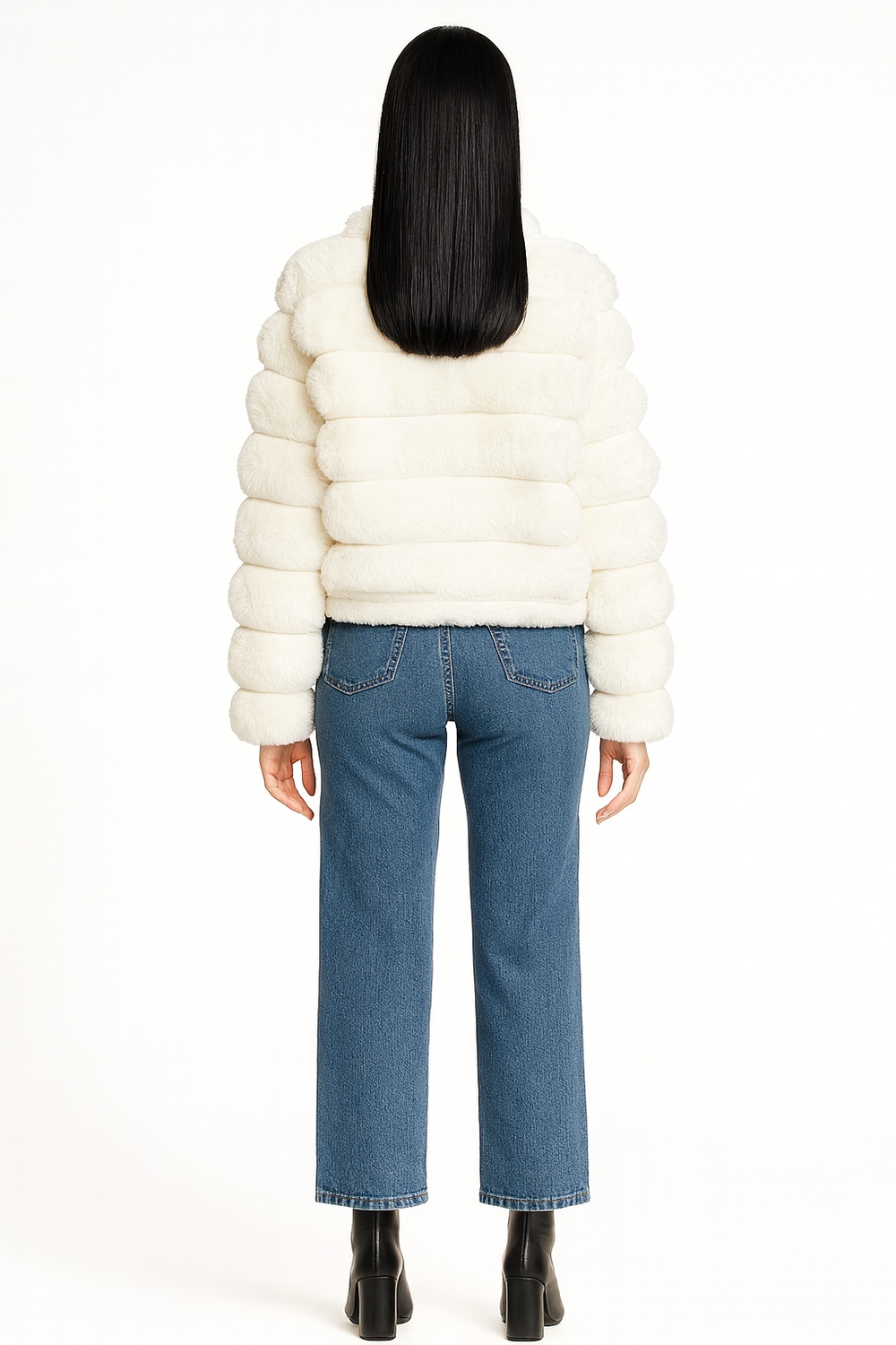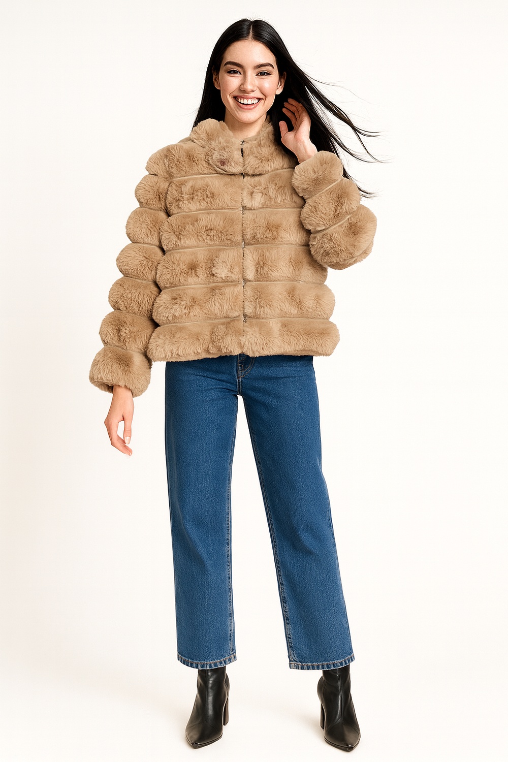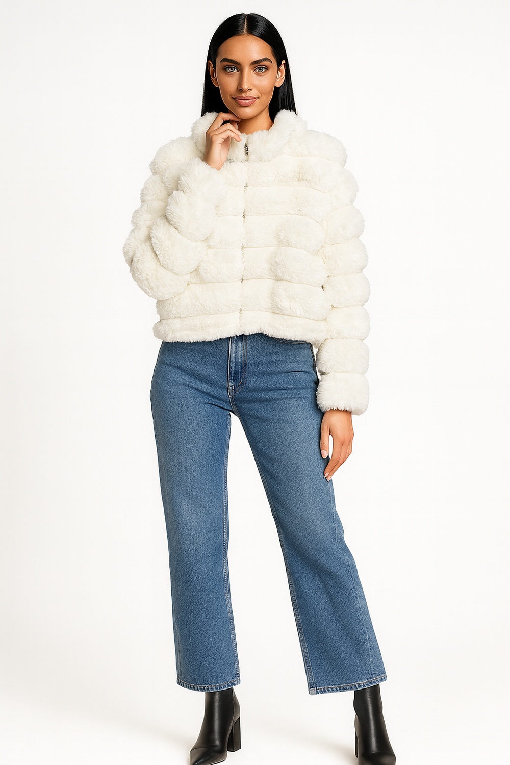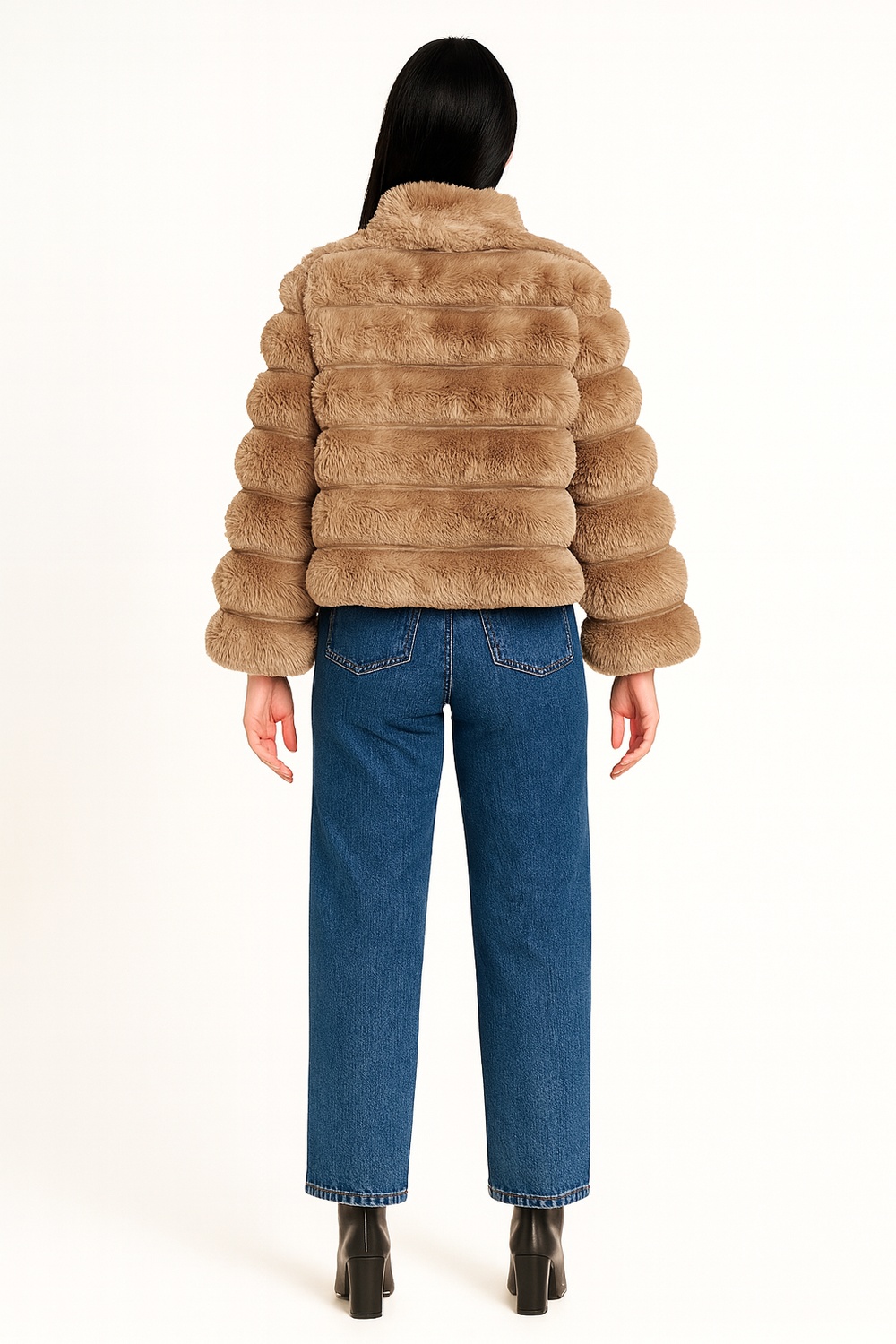 Abrigo corto confeccionado en tejido tipo peluche con textura suave, cuello alto que brinda abrigo, cierre frontal con cremallera metálica, corte amplio que facilita el movimiento y aporta estilo contemporáneo en climas fríos