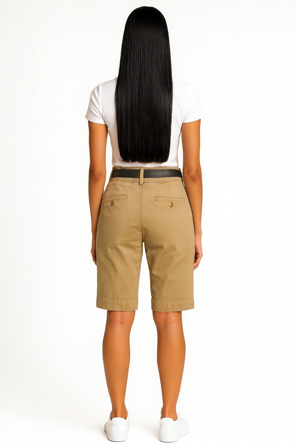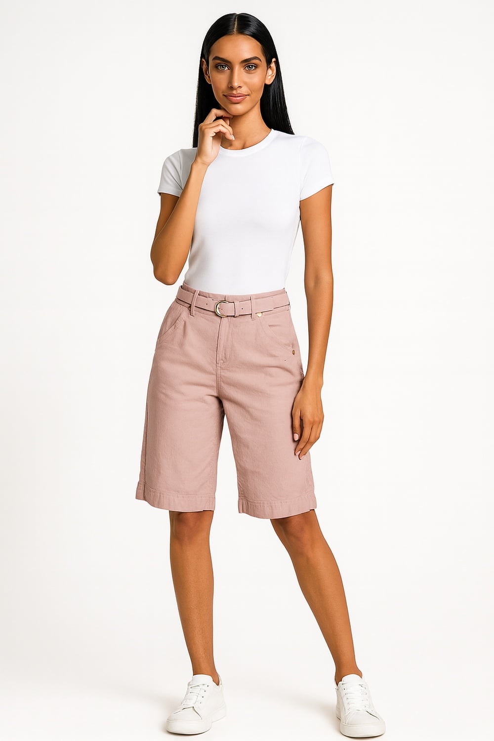Bermuda de tiro medio con cinturón integrado que permite ajuste preciso en cintura, bolsillos diagonales al frente y posteriores funcionales, largo a la rodilla que brinda cobertura equilibrada, cierre frontal con botón y cremallera, confección en tejido firme con estructura ligera para uso continuo
