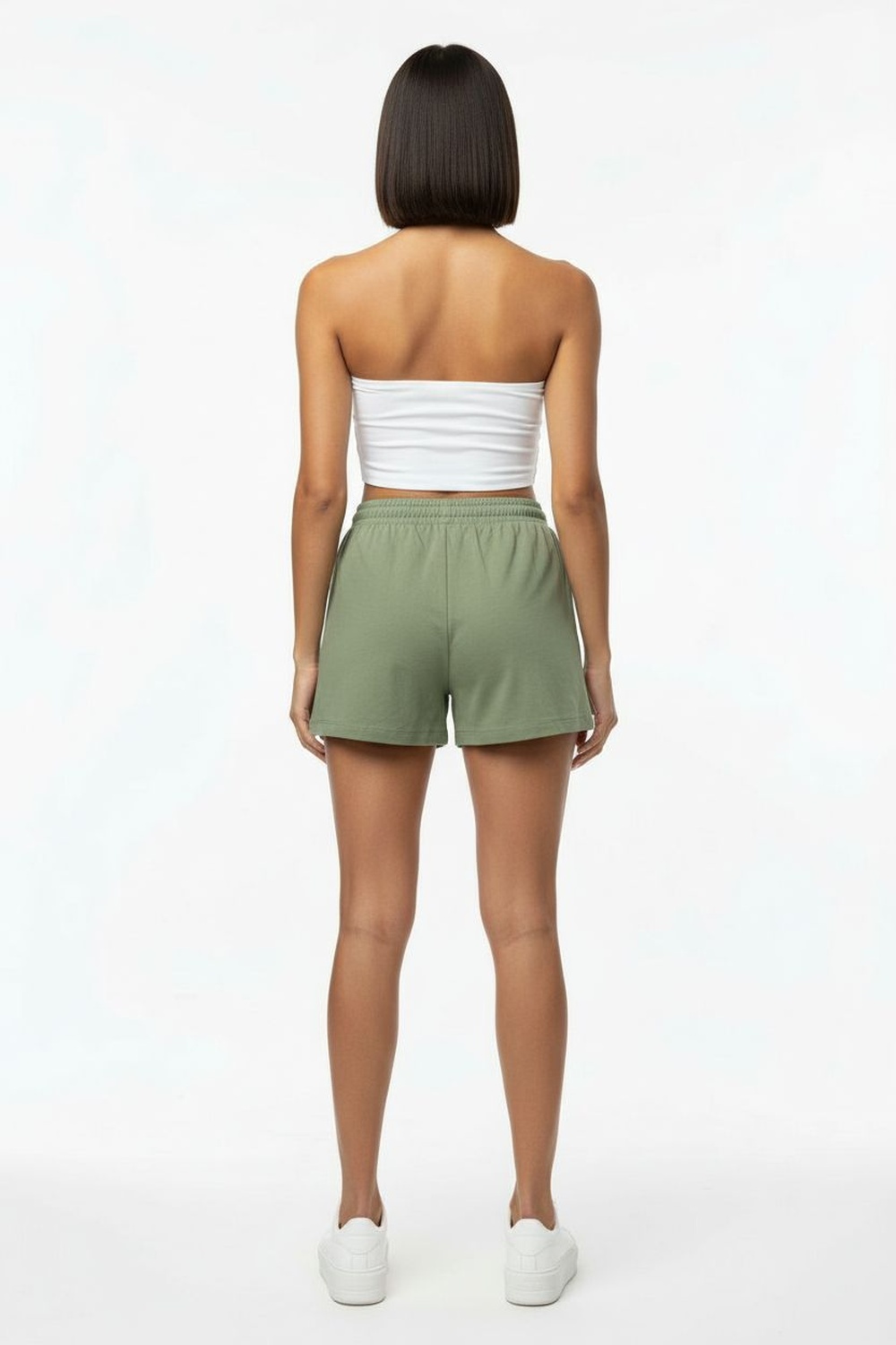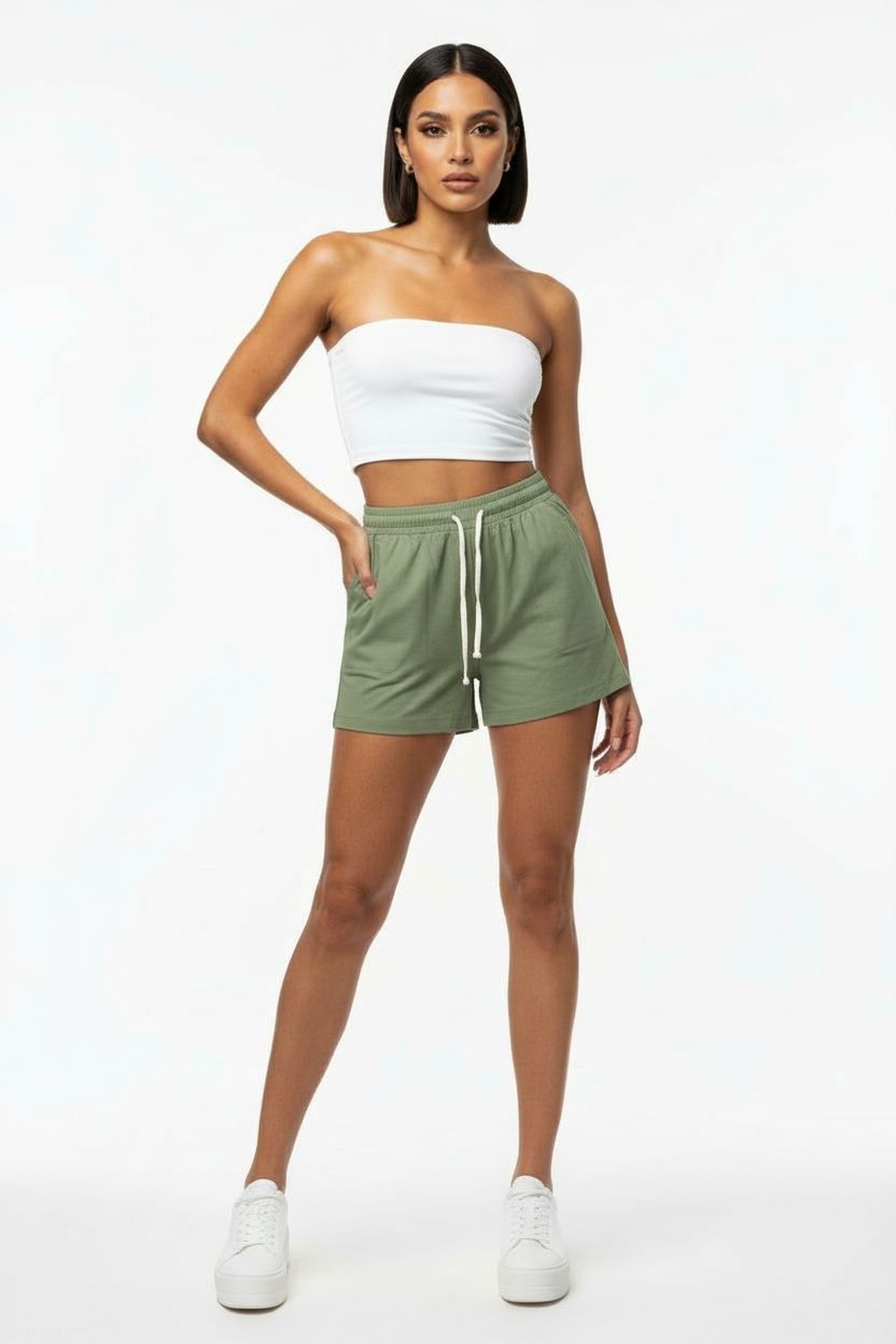 Bermuda con pretina elástica, ajuste con jareta, bolsas laterales funcionales, corte amplio, largo arriba de la rodilla, terminados firmes