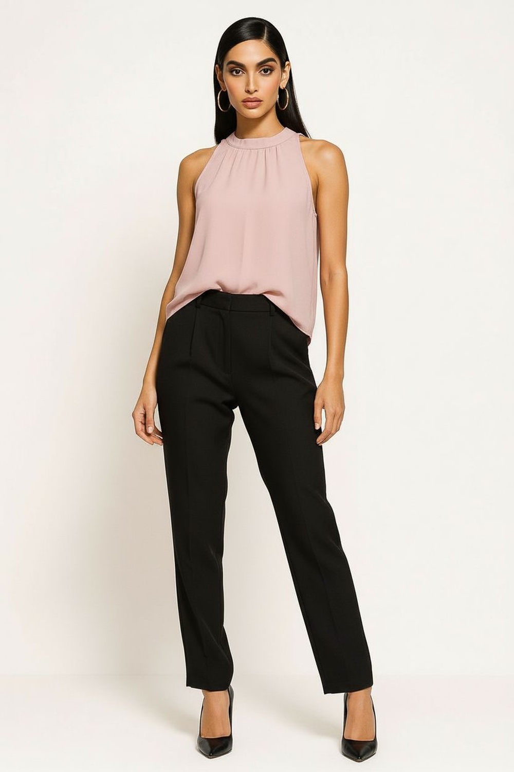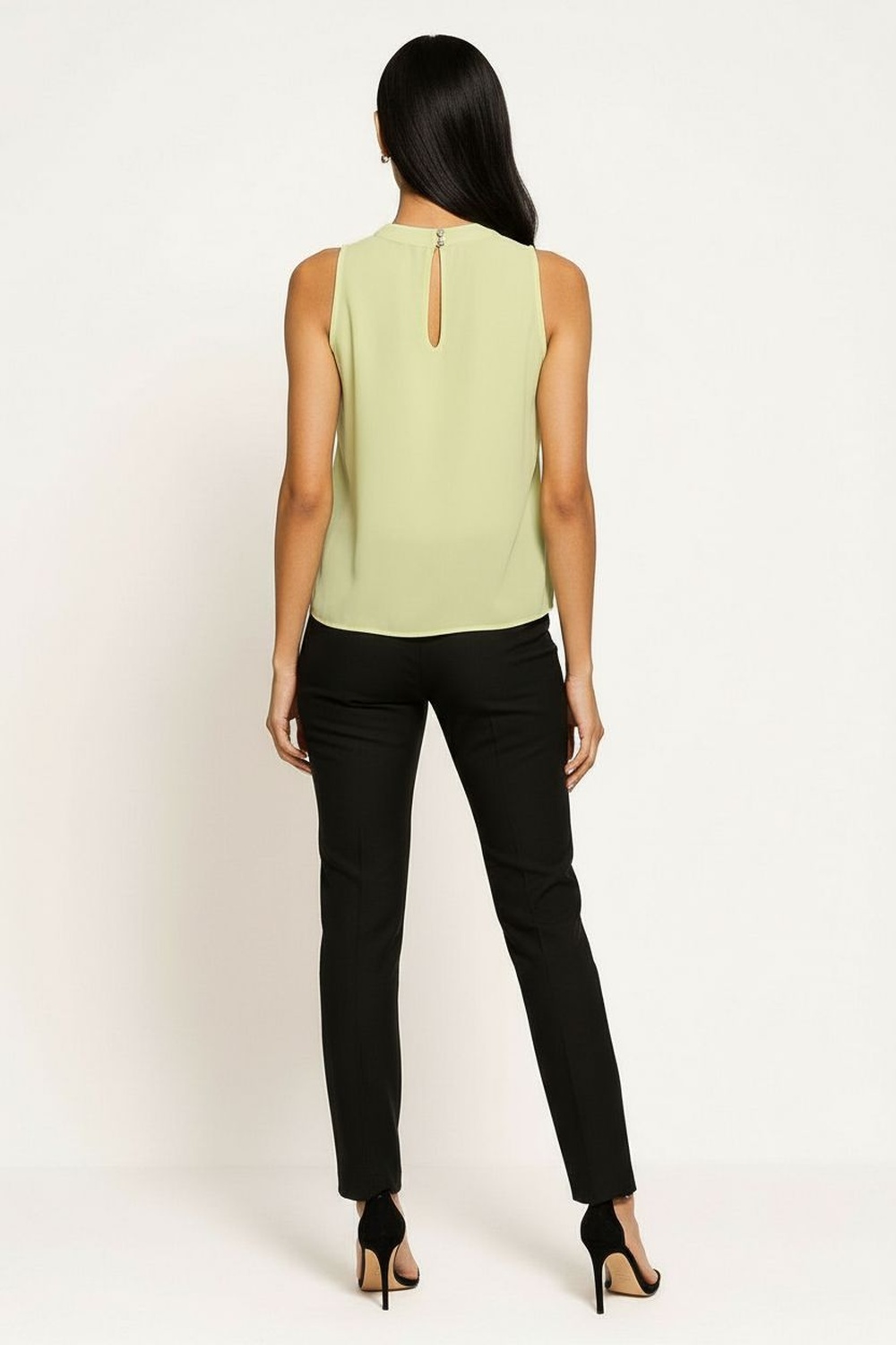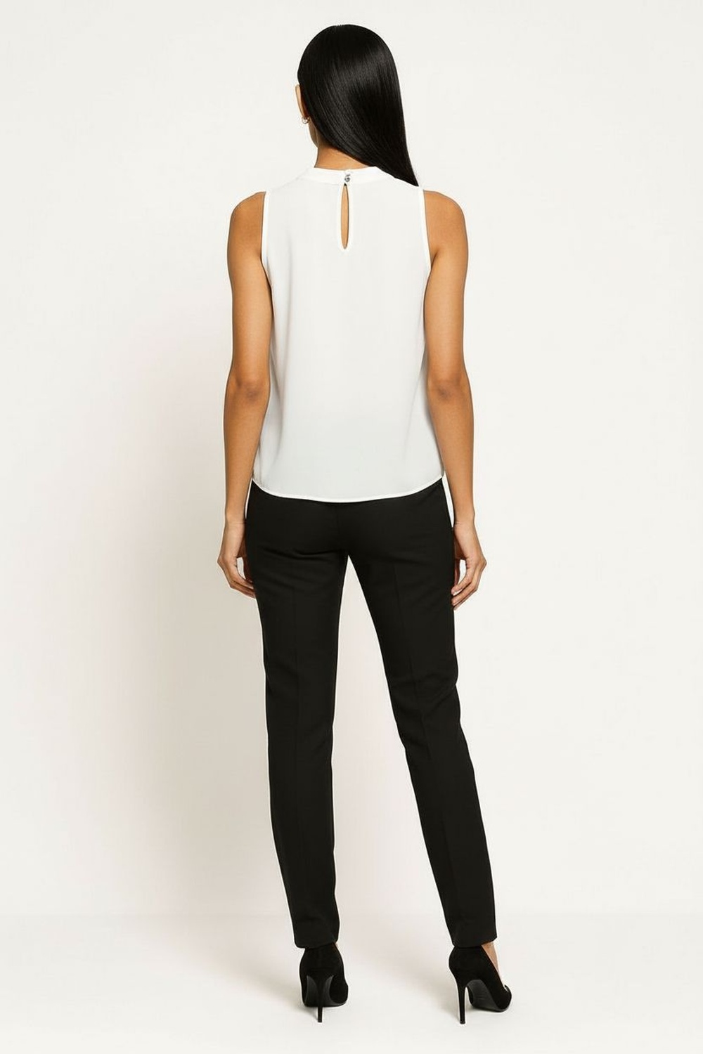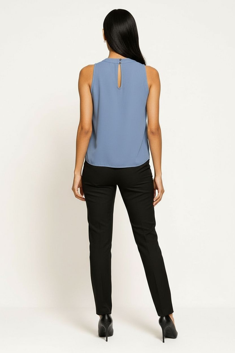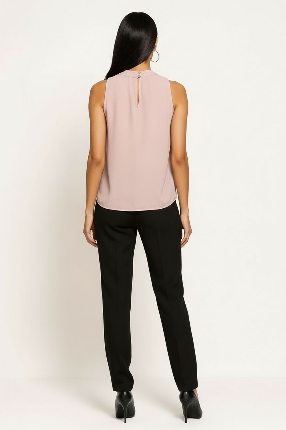 Blusa sin manga de corte recto que ofrece estructura ligera, cuello cerrado con acabado limpio que aporta definición, abertura posterior con botón para fácil colocación, confección en tejido suave que permite uso prolongado, largo a la cadera que mantiene proporción visual
