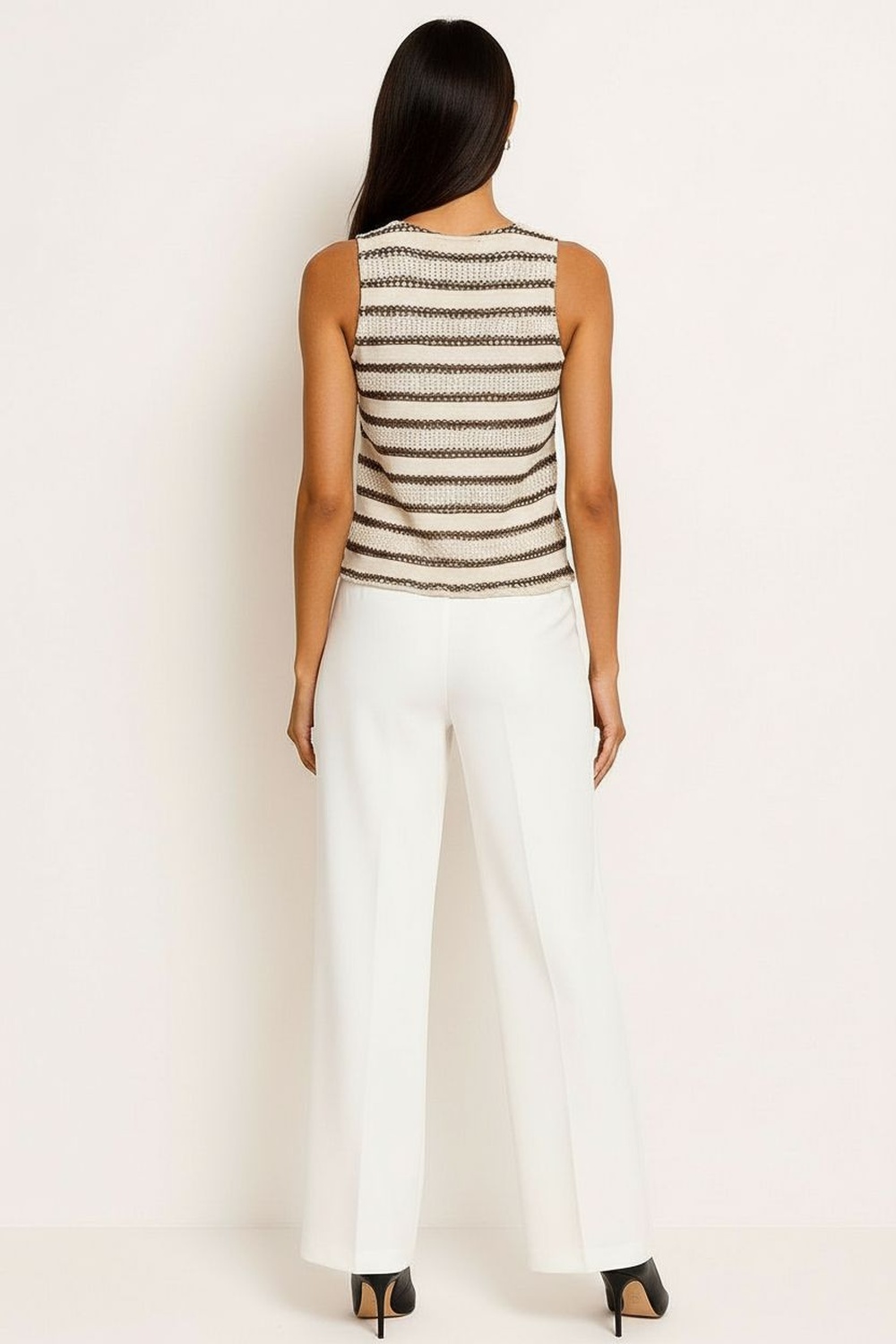 Blusa sin mangas con diseño abierto al frente y jaretas ajustables que permiten regular el ajuste, escote en V profundo que aporta amplitud visual, corte recto con caída ligera sobre el cuerpo, confección en tejido calado de textura suave y fresca para climas cálidos