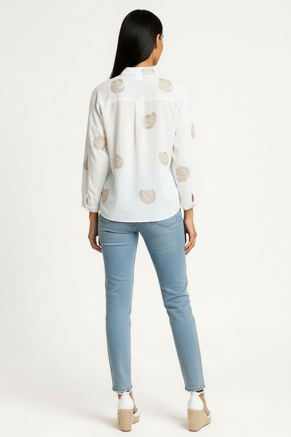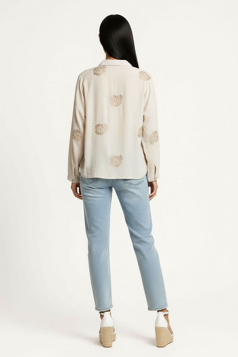 Blusa de manga larga con cuello camisero y botonadura frontal funcional, detalle de amarre en la parte baja que aporta ajuste personalizado, corte recto que brinda comodidad, confección en tejido ligero de tacto suave, acabados cuidados en cuello y puños