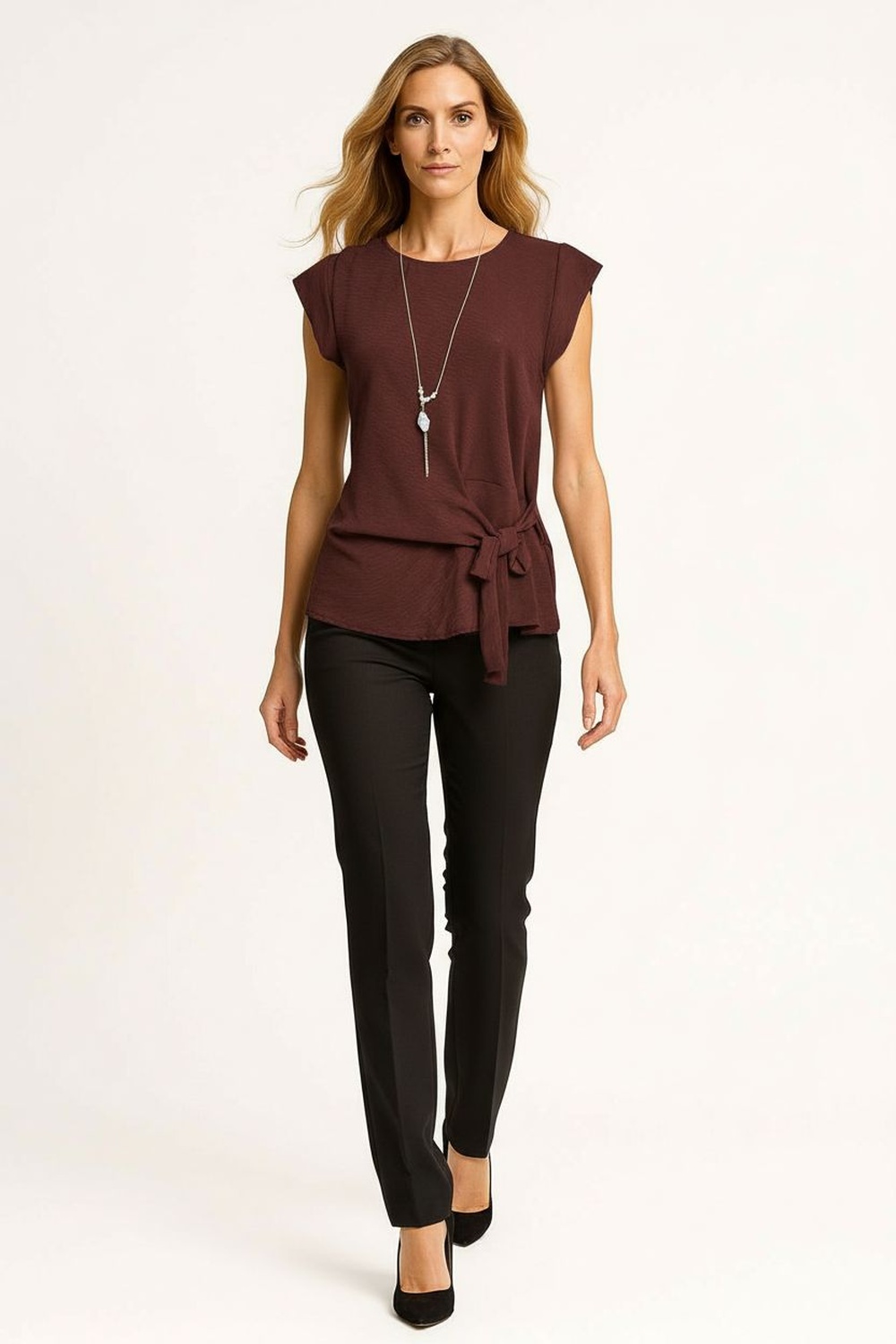 Blusa de manga corta amplia con escote redondo cerrado que equilibra el diseño, detalle de amarre lateral integrado que ajusta y define el frente, largo medio con caída asimétrica que aporta dinamismo visual, confección en tejido con textura ligera y estructura flexible para mayor comodidad, acabado suave con presentación cuidada