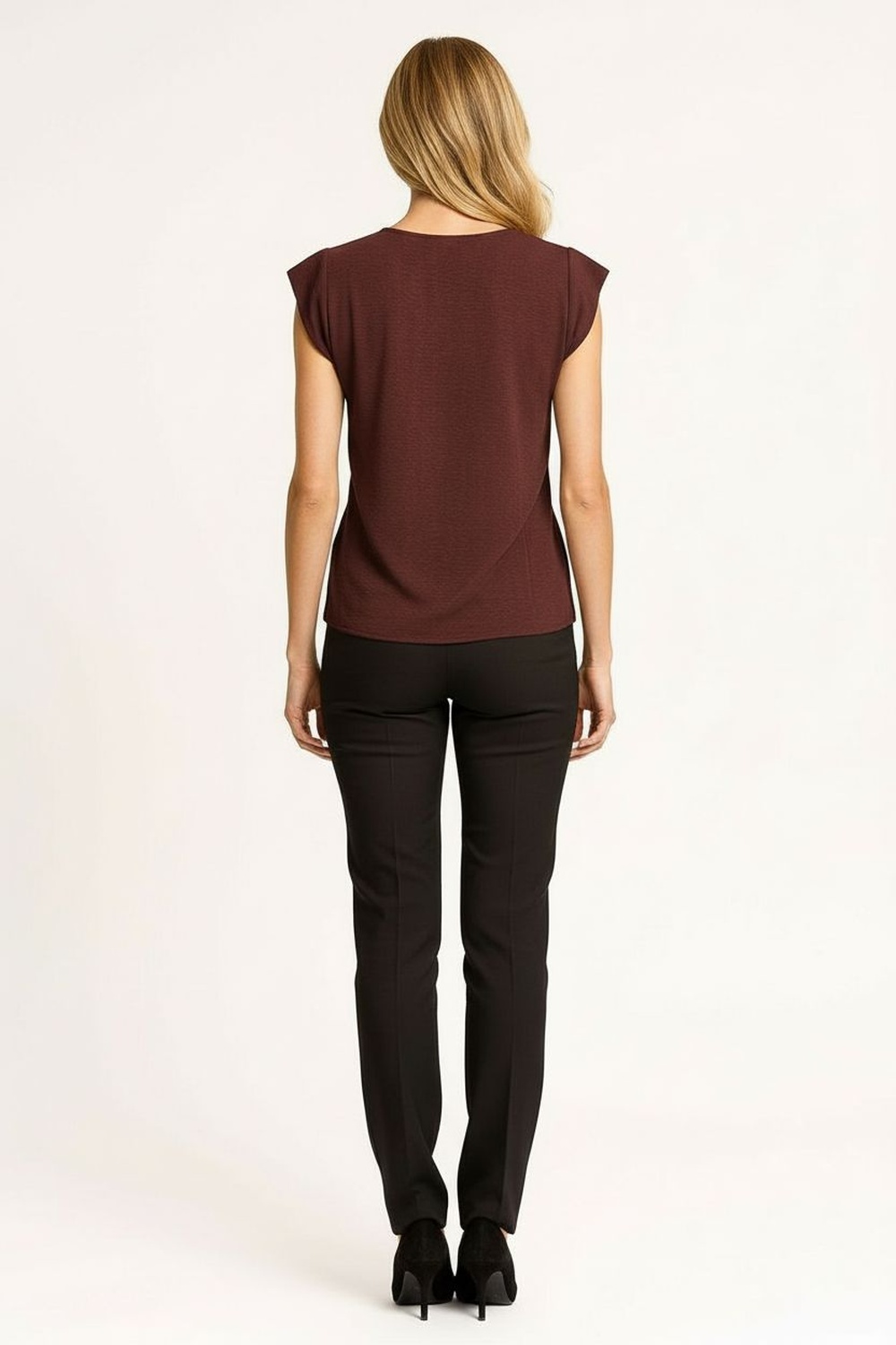 Playera de manga corta con cuello tipo polo y escote discreto, corte ajustado que define la parte superior, confección en tejido crepé con textura ligera y transpirable, largo regular que brinda equilibrio visual, acabado limpio para uso frecuente