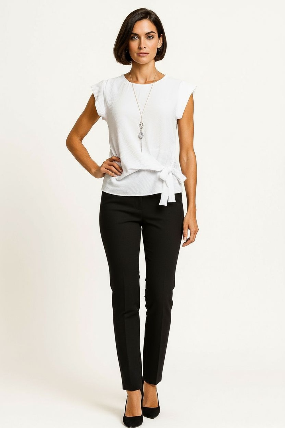 Blusa de manga corta amplia, escote redondeado, diseño cruzado con amarre lateral que ajusta la silueta, corte recto con caída ligera y movimiento cómodo