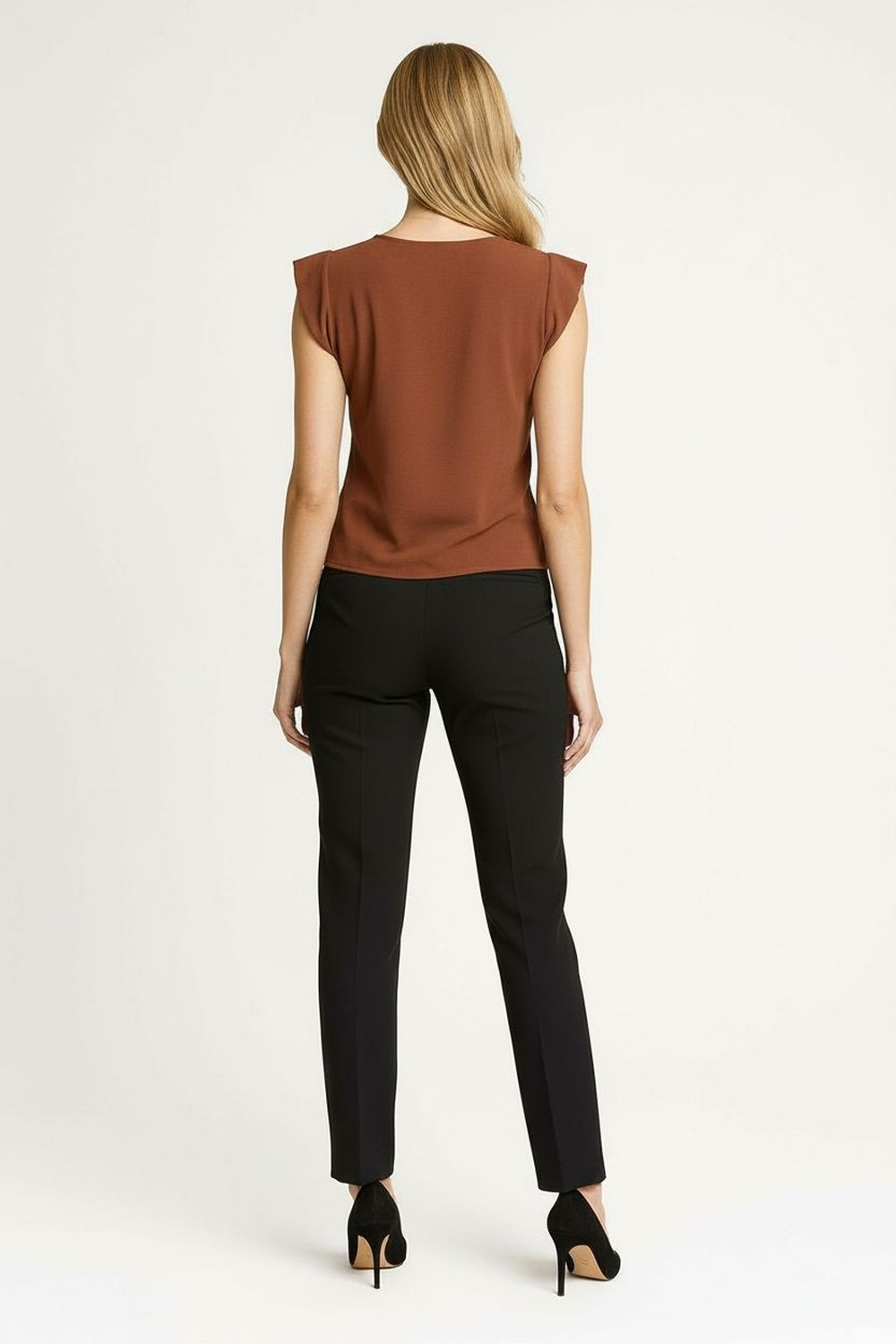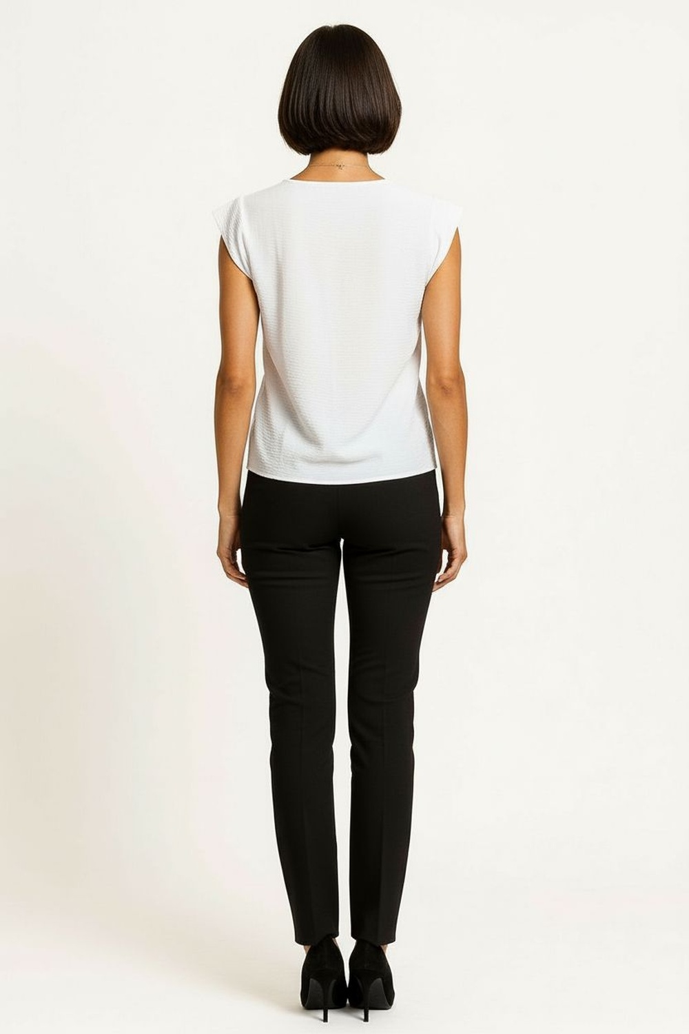 Top sin mangas con cuello redondo al frente y abertura posterior tipo gota, silueta suelta con caída ligera, largo a la cadera que aporta frescura, confección en tejido fluido de tacto suave