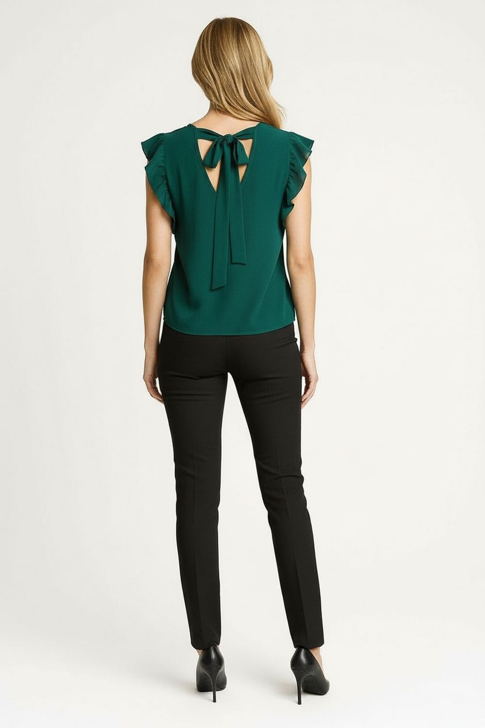 Blusa de corte recto con estructura ligera que aporta caída uniforme, escote en V al frente con terminado limpio, mangas cortas con ligero vuelo que añaden volumen sutil, espalda con abertura y amarre ajustable que permite personalizar el ajuste, largo regular con terminación recta, confección en tejido suave al tacto