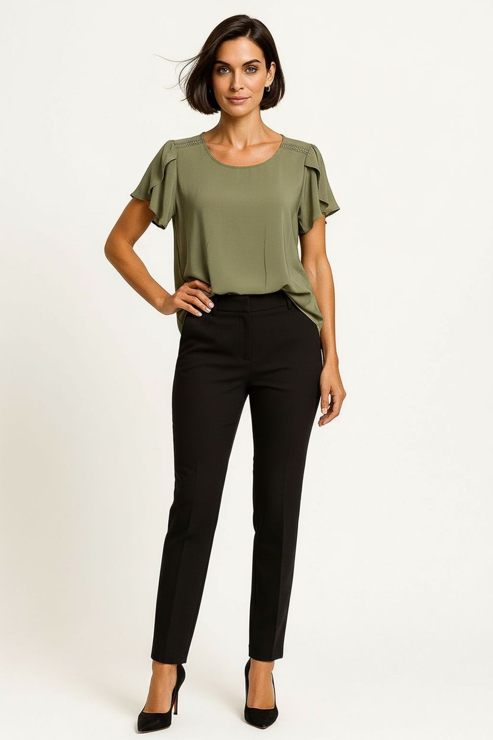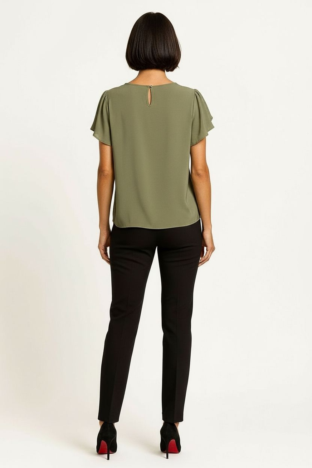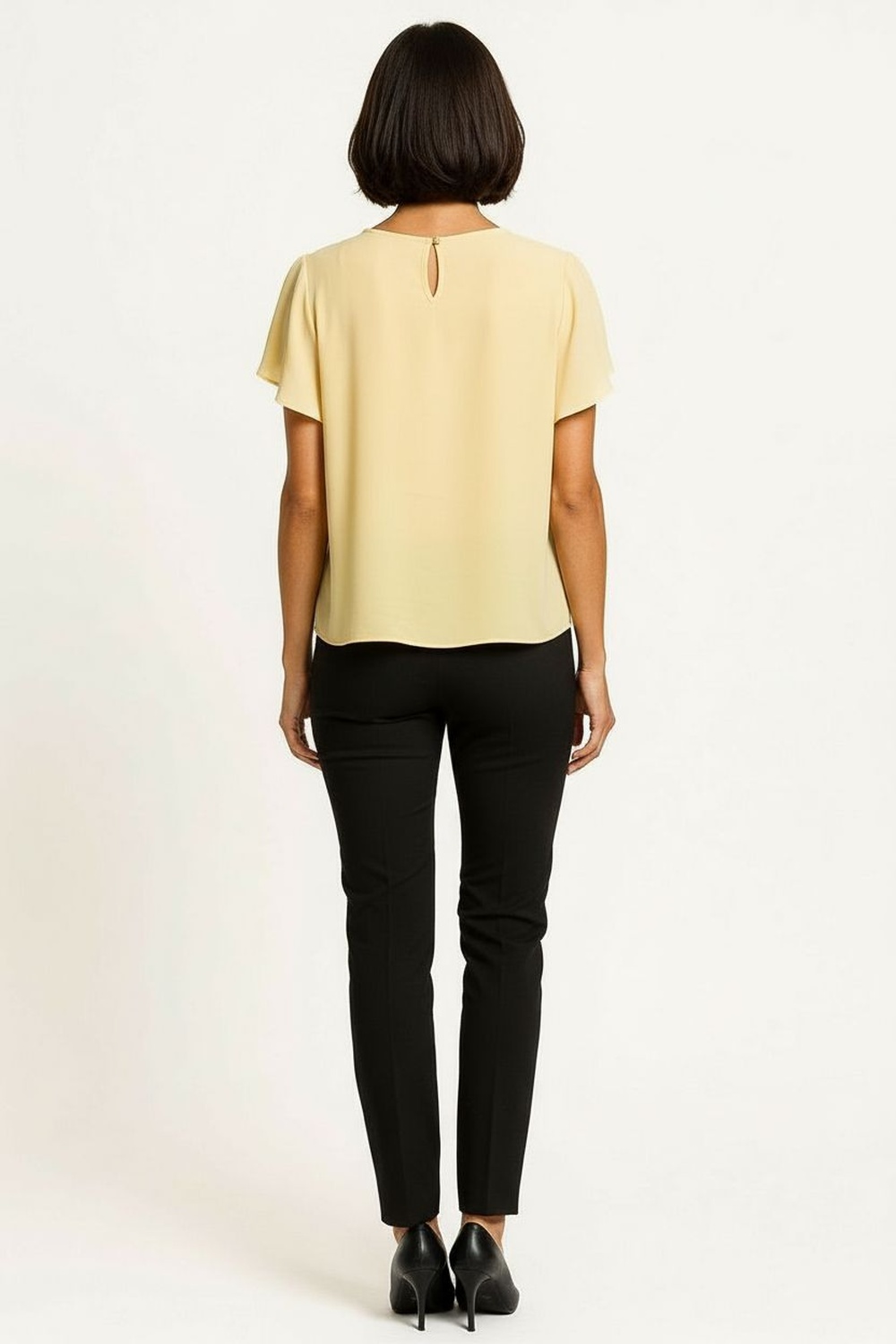 Blusa manga corta, escote redondo, aplicaciones decorativas en hombros, estructura ligera, terminación recta