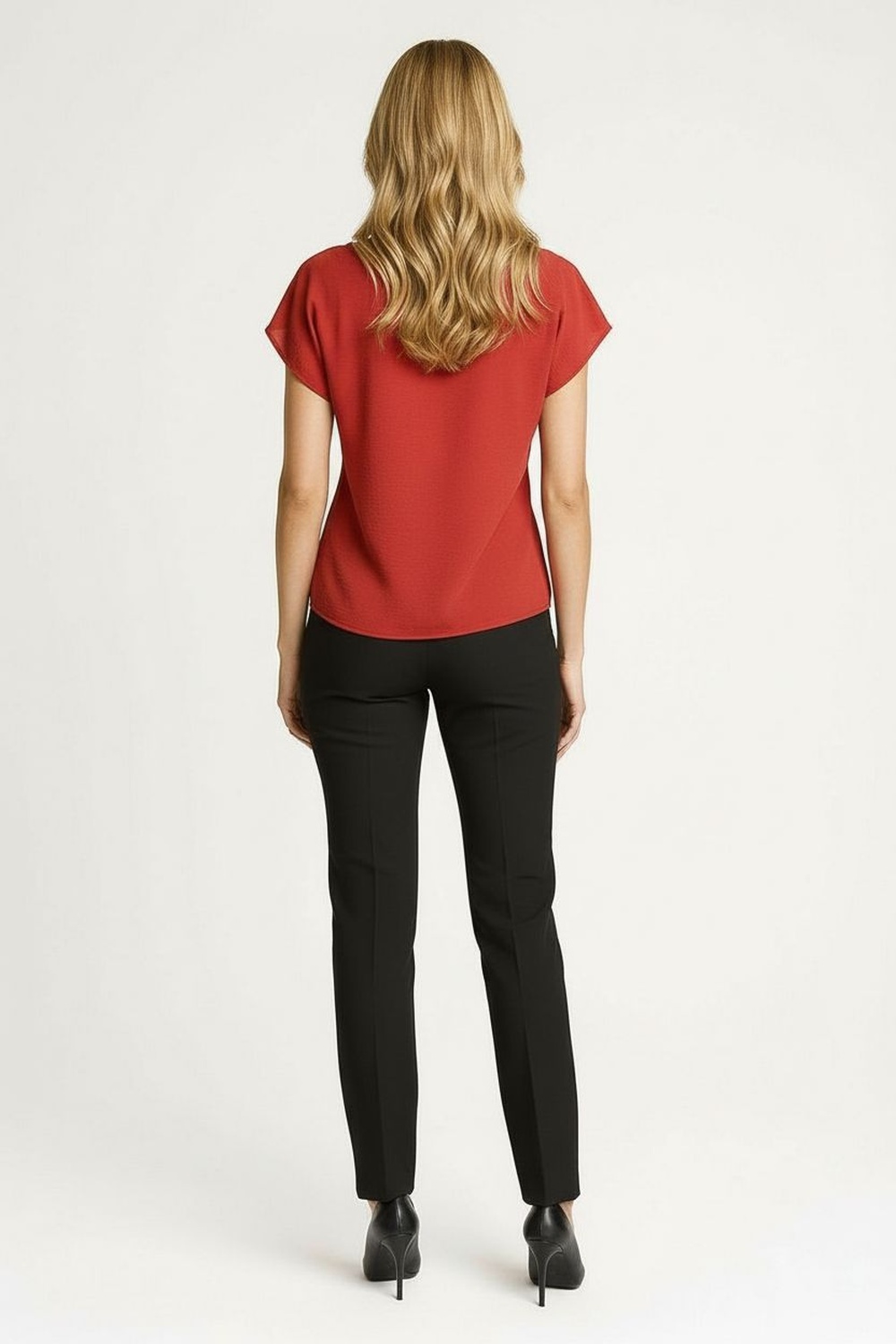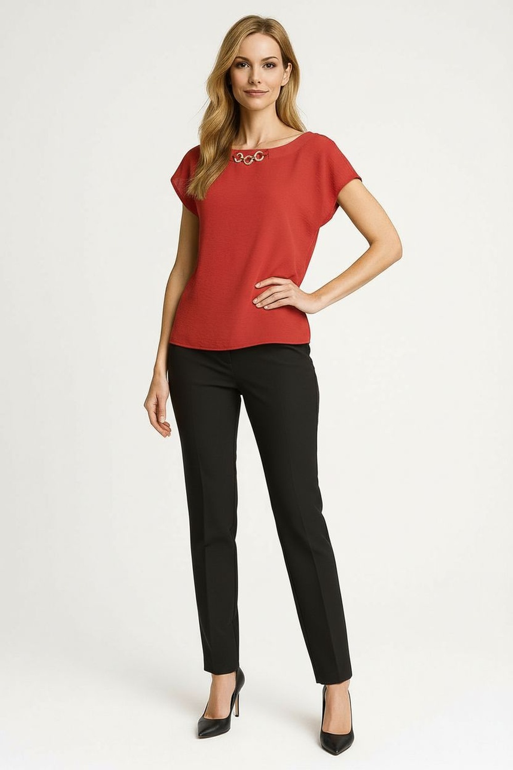 Blusa de cuello redondo con aplicación metálica decorativa al frente que aporta un punto focal, manga corta de corte limpio que permite movilidad, silueta recta con caída ligera que brinda confort, confección en tela suave al tacto con estructura flexible, acabado prolijo en cuello y mangas