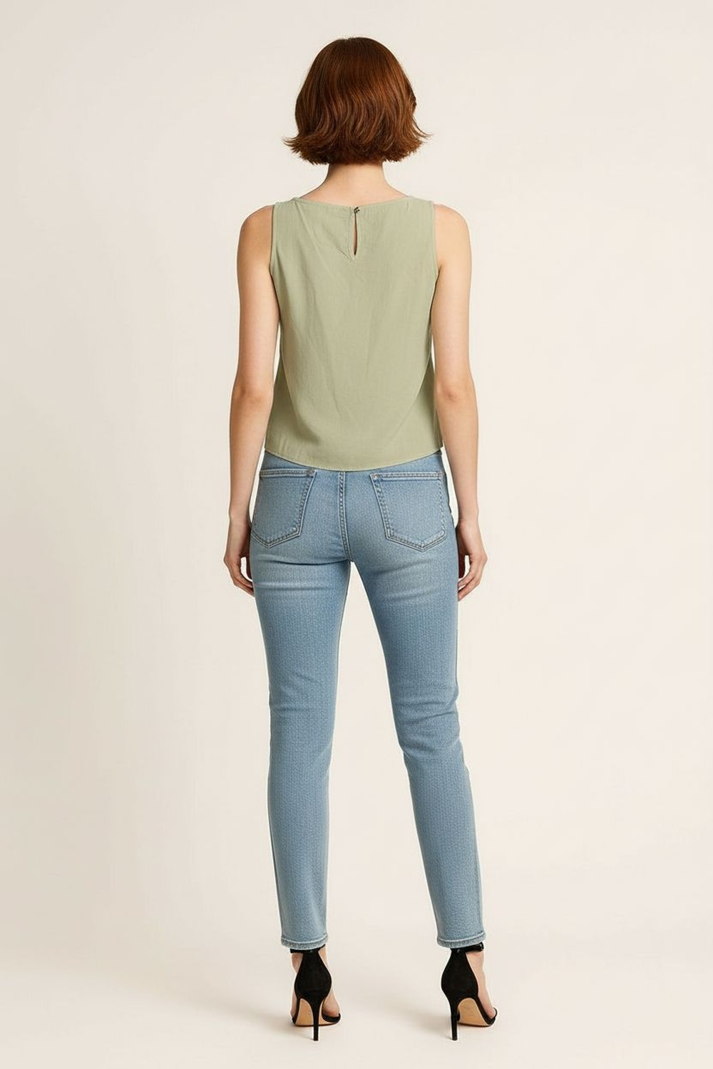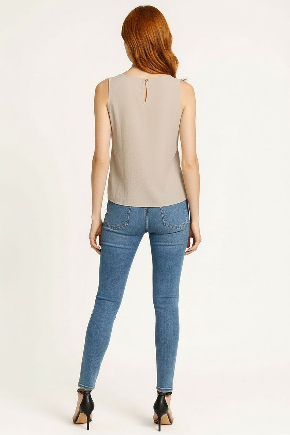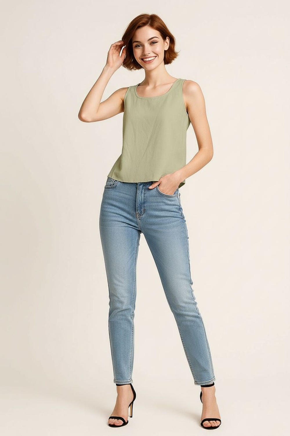 Blusa sin mangas con escote redondo, estructura recta con caída ligera, diseño limpio que permite libertad de movimiento, acabado suave al tacto