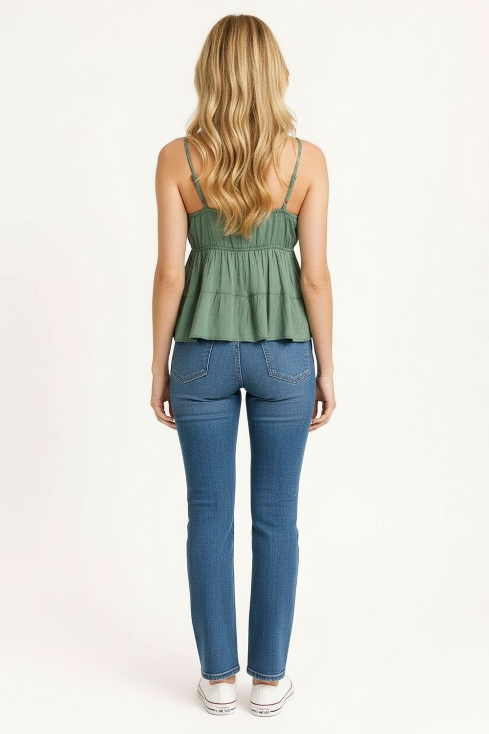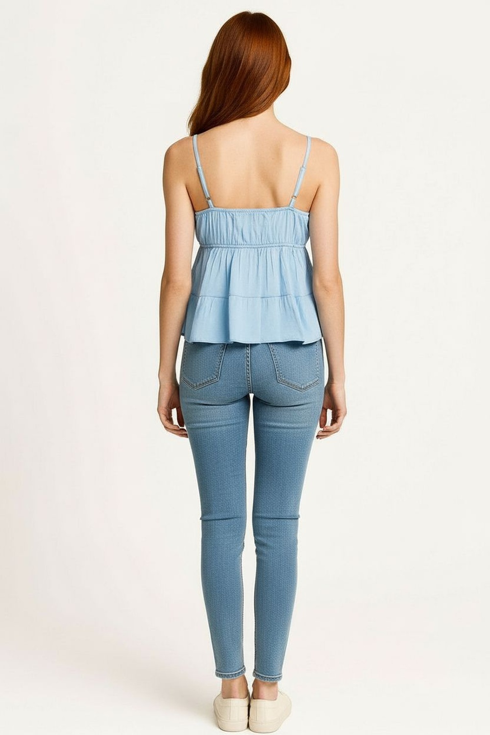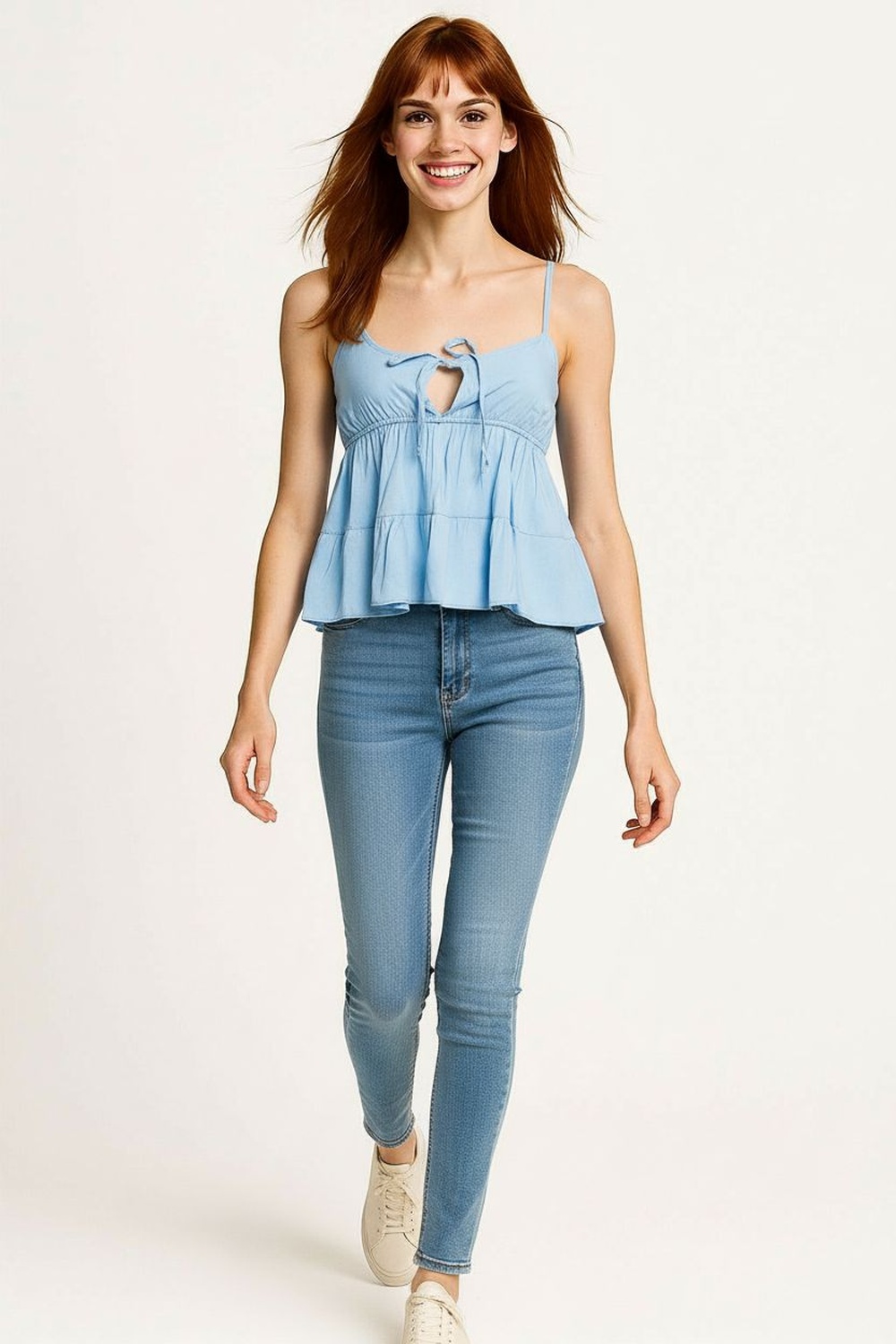 Blusa con tirantes delgados ajustables que permiten mejor adaptación, jareta frontal con amarre integrado que genera detalle distintivo, cuerpo con caída suave gracias a su confección fluida, doble vuelo inferior que aporta amplitud y movimiento, diseño cómodo para uso diario
