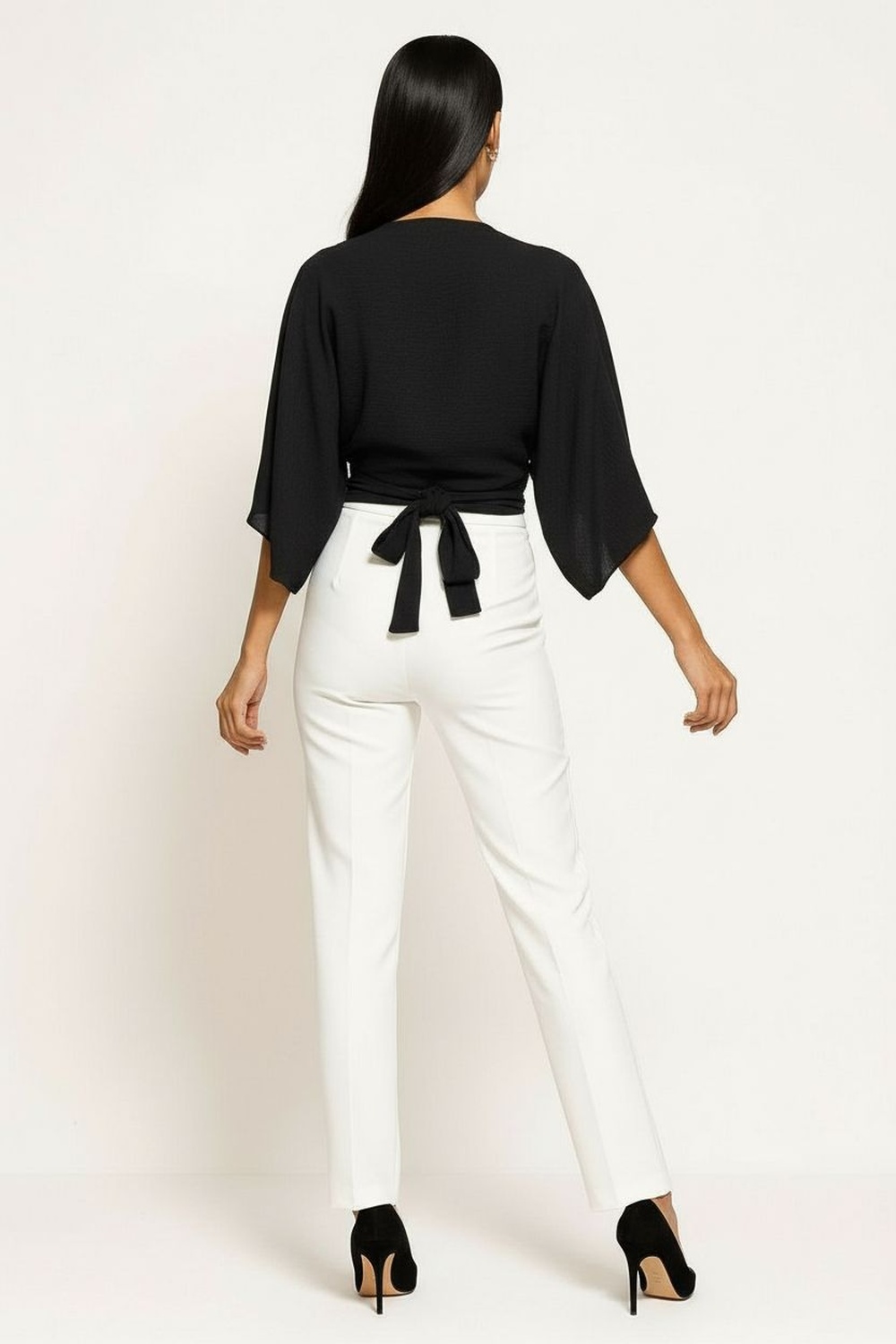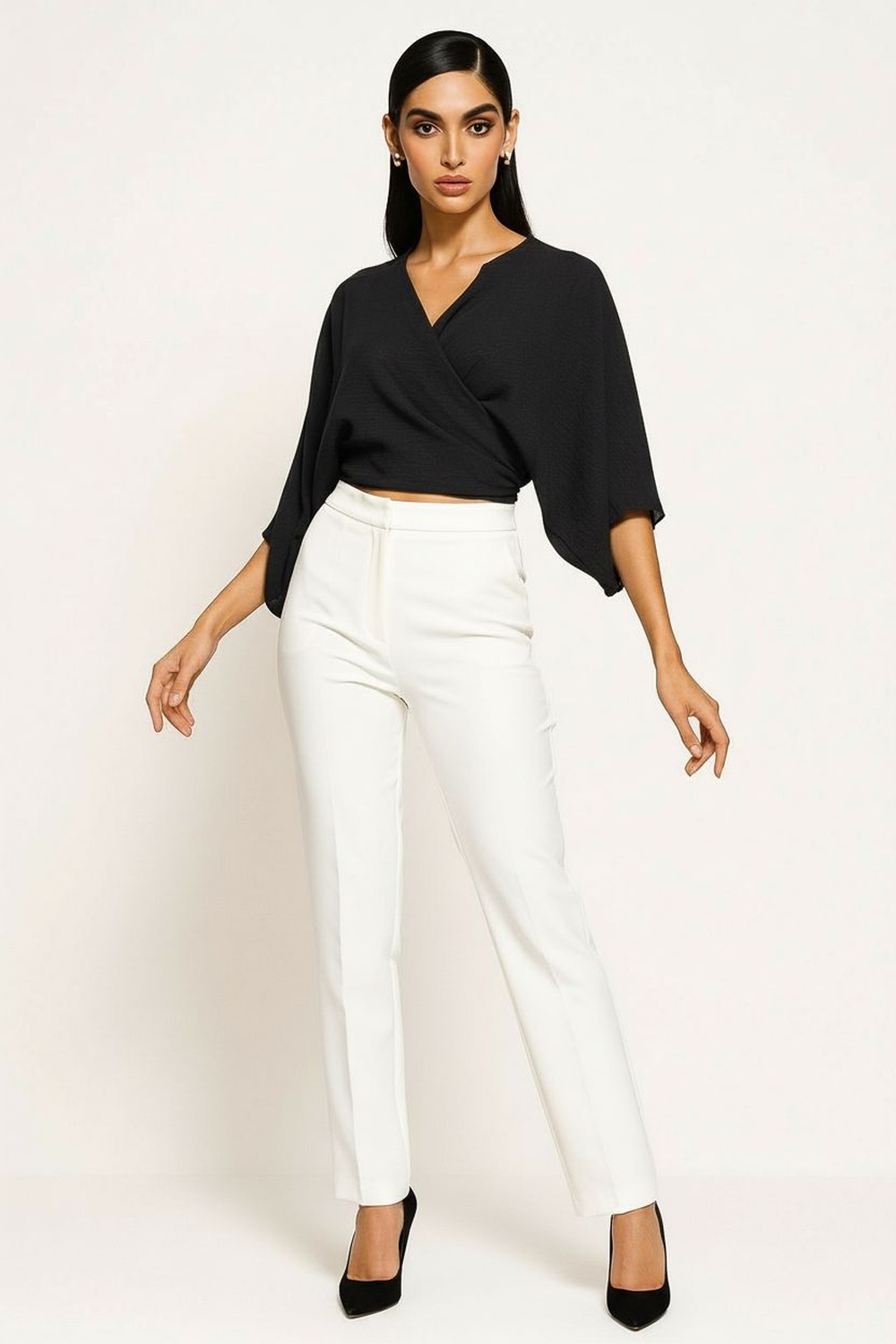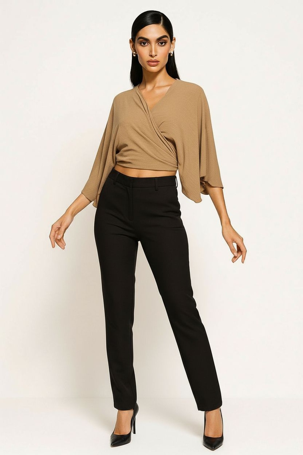 Blusa de corte corto con cruce frontal que aporta estructura y sujeción, mangas amplias que permiten movilidad cómoda, amarre posterior que brinda ajuste adaptable a la silueta, confección ligera que proporciona caída suave y sensación fresca