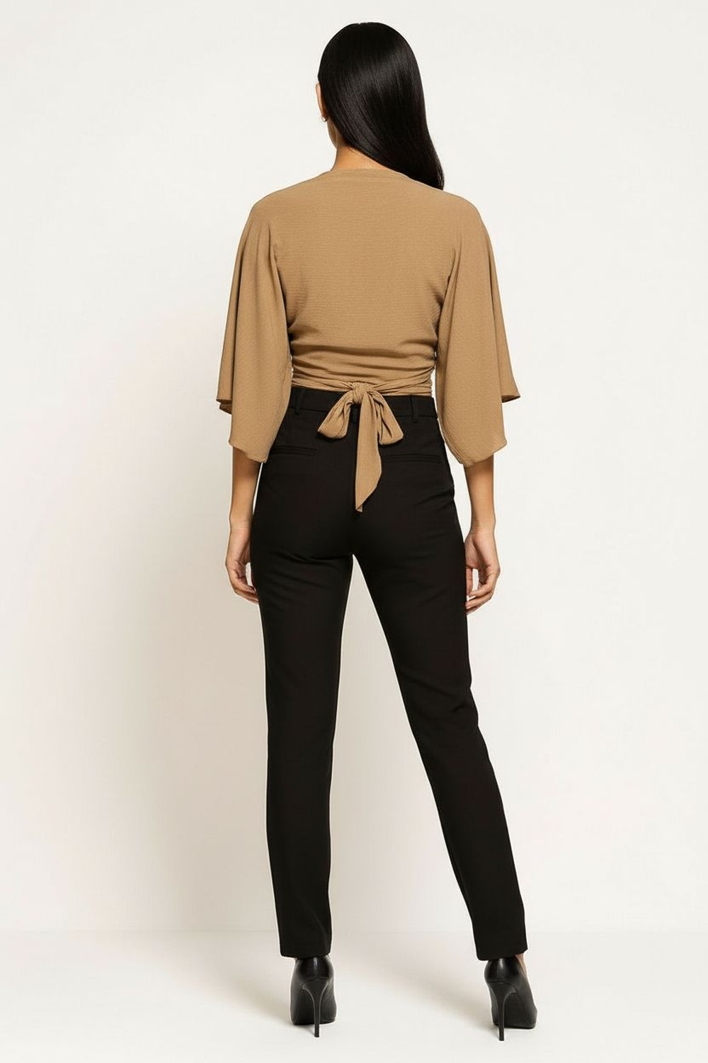 Pantalón de tiro alto con pretina amplia y ajuste firme en la cintura, diseño estructurado que define la silueta, cuerpo ceñido con tejido flexible que aporta comodidad en cada movimiento, acabado limpio que ofrece una apariencia pulida en cualquier ocasión