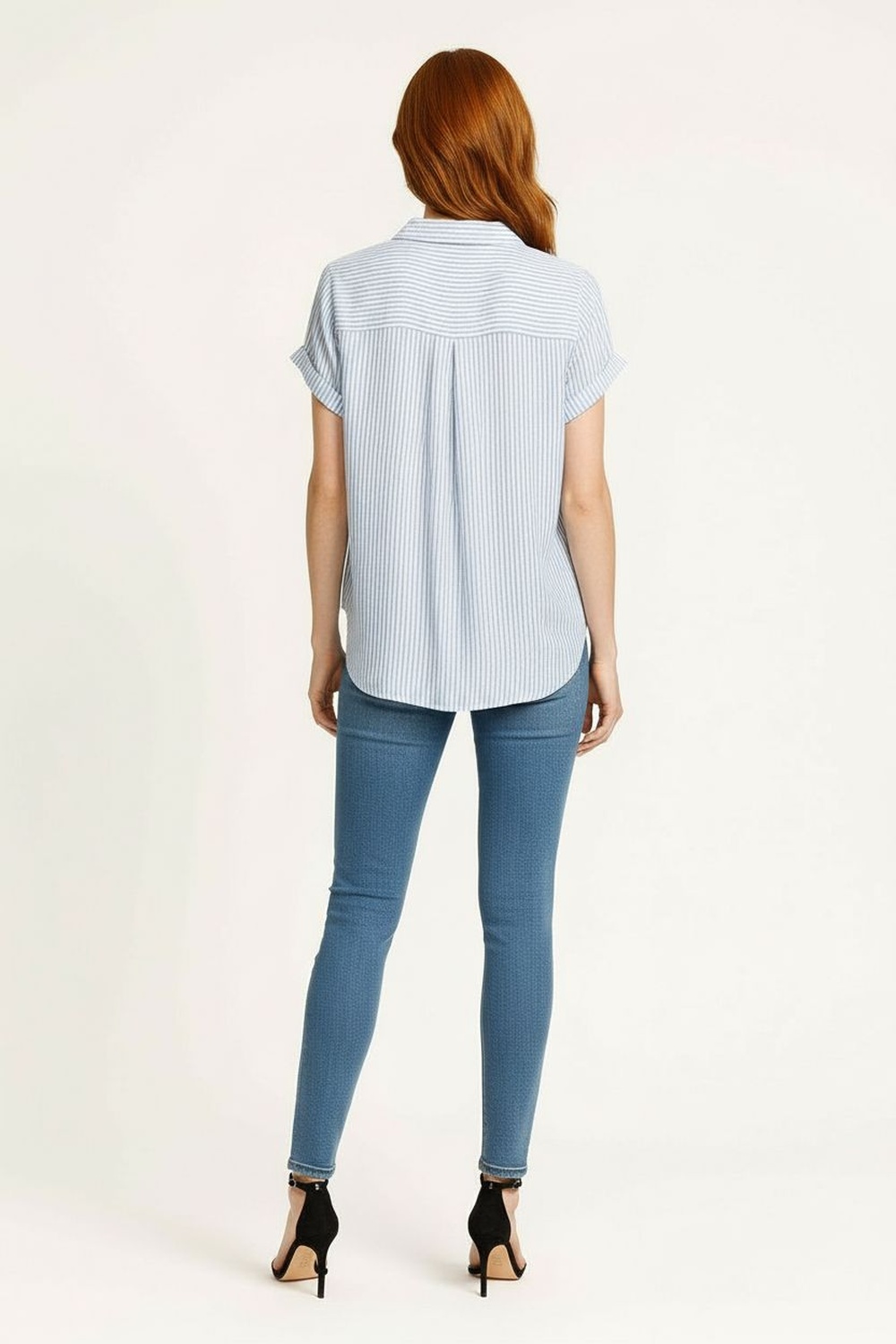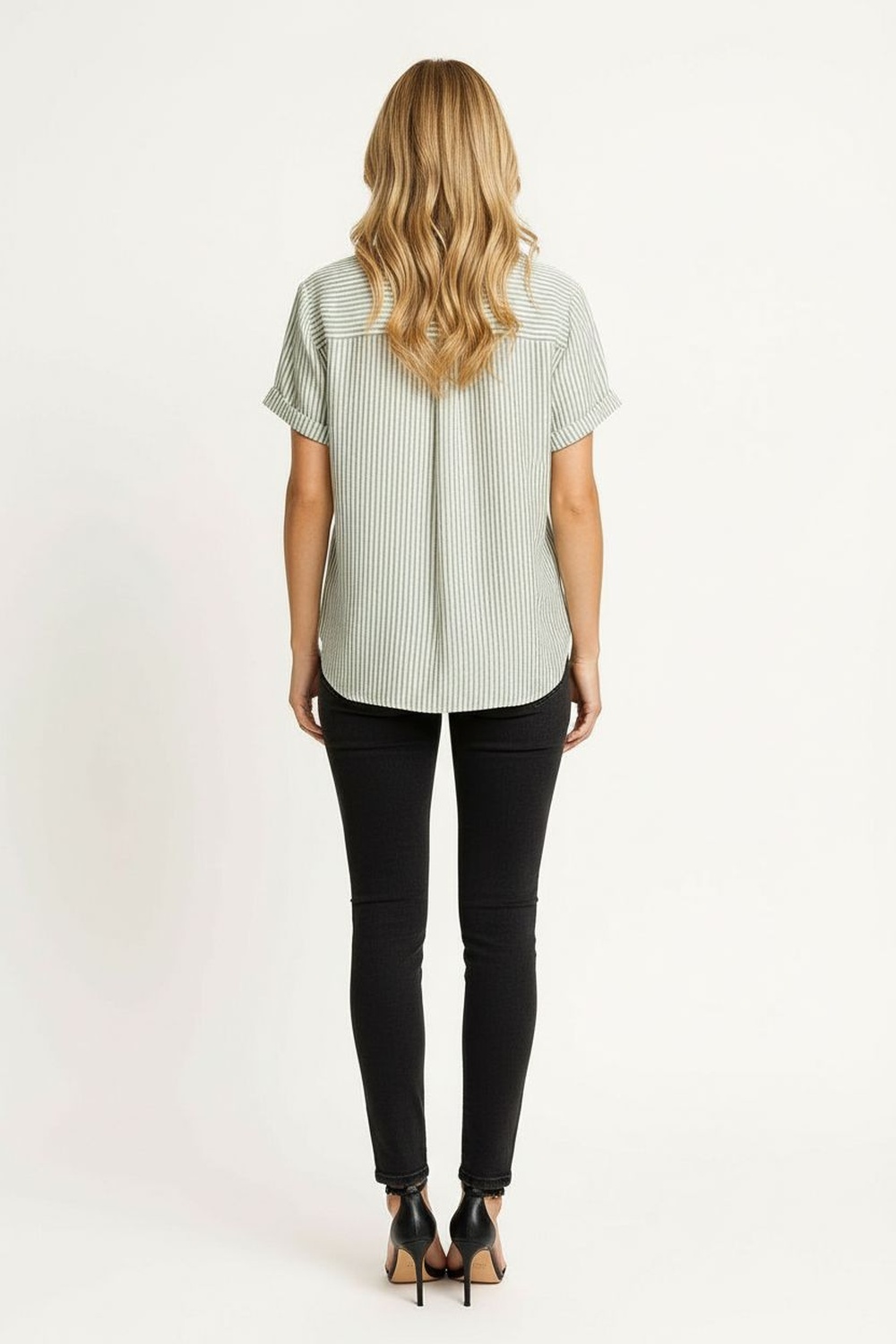 Blusa de cuello camisero con botonadura frontal y botones forrados que aportan acabado elegante, manga corta con corte estructurado que mantiene la forma, pinzas frontales que estilizan la silueta, confección en tela ligera de textura suave que brinda comodidad y ajuste equilibrado