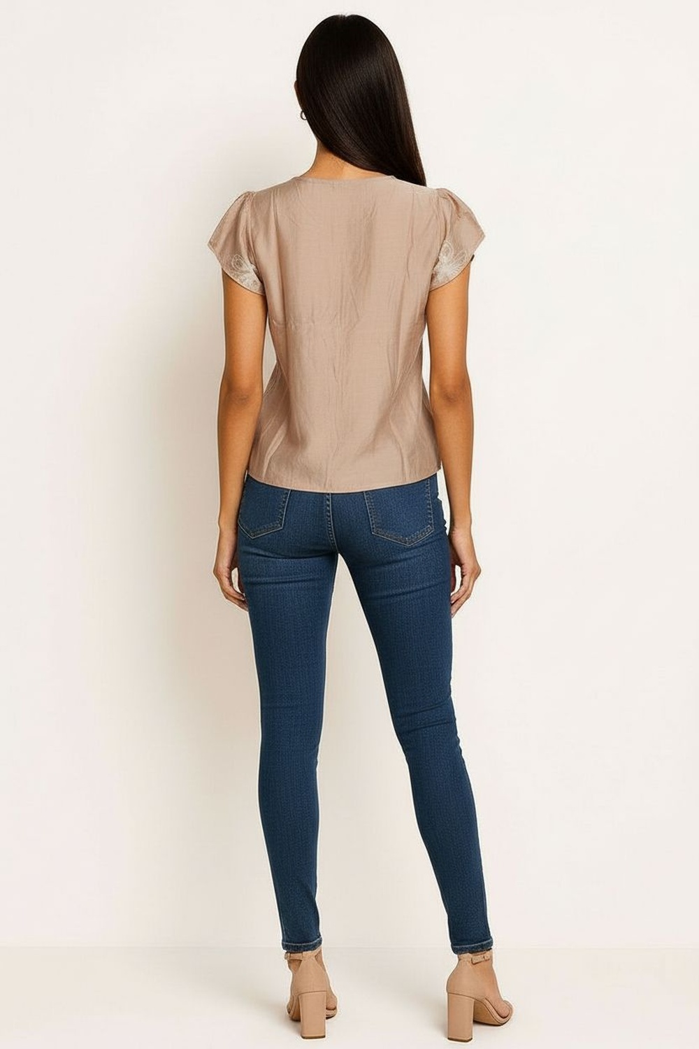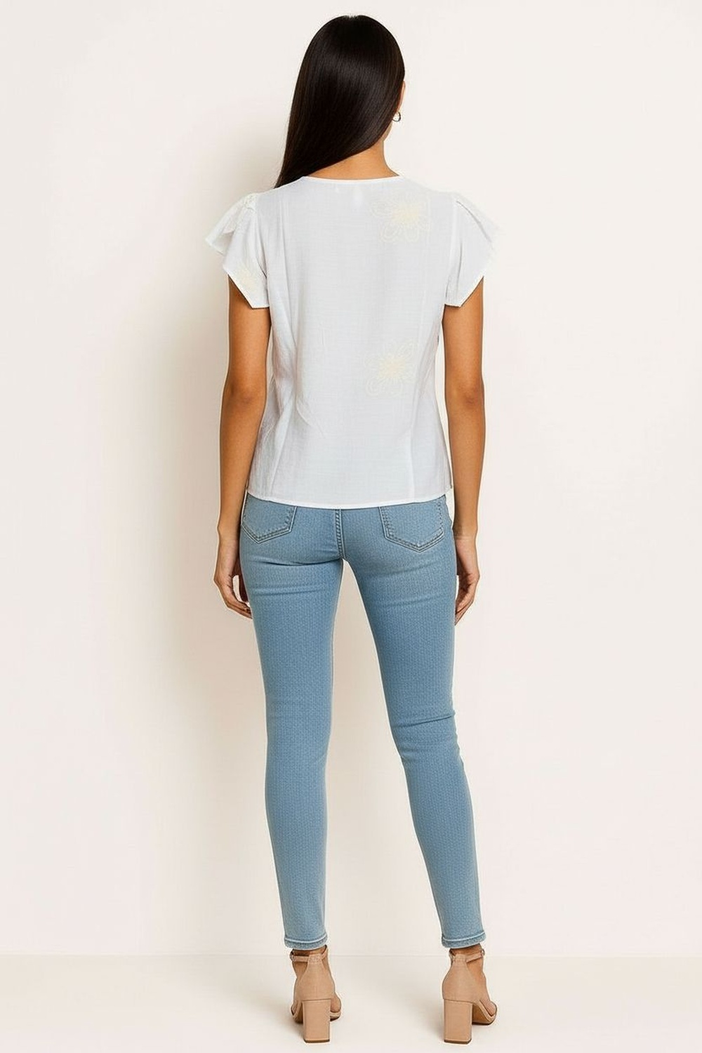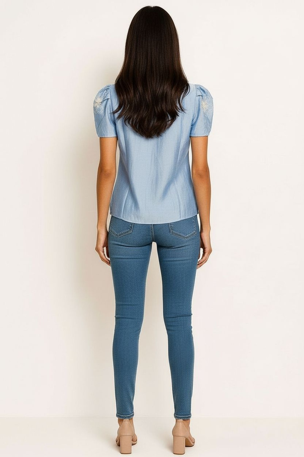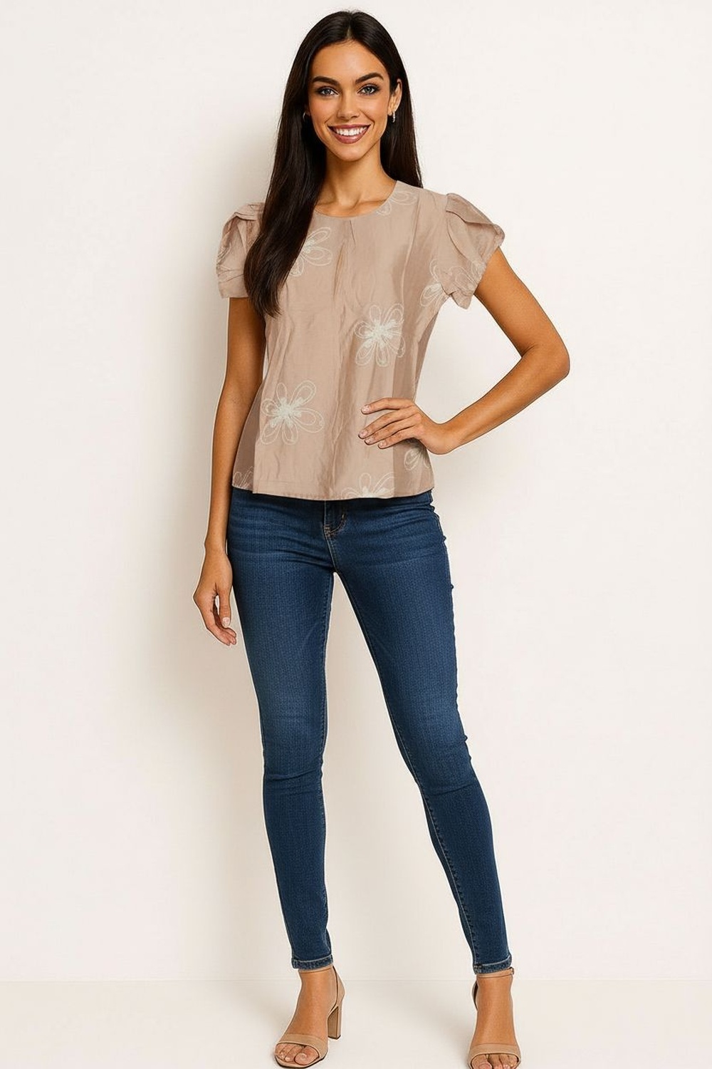 Blusa de manga corta con detalle de bordado decorativo integrado a la prenda, escote redondo con abertura frontal discreta, corte recto que brinda comodidad continua, confección ligera con tacto natural