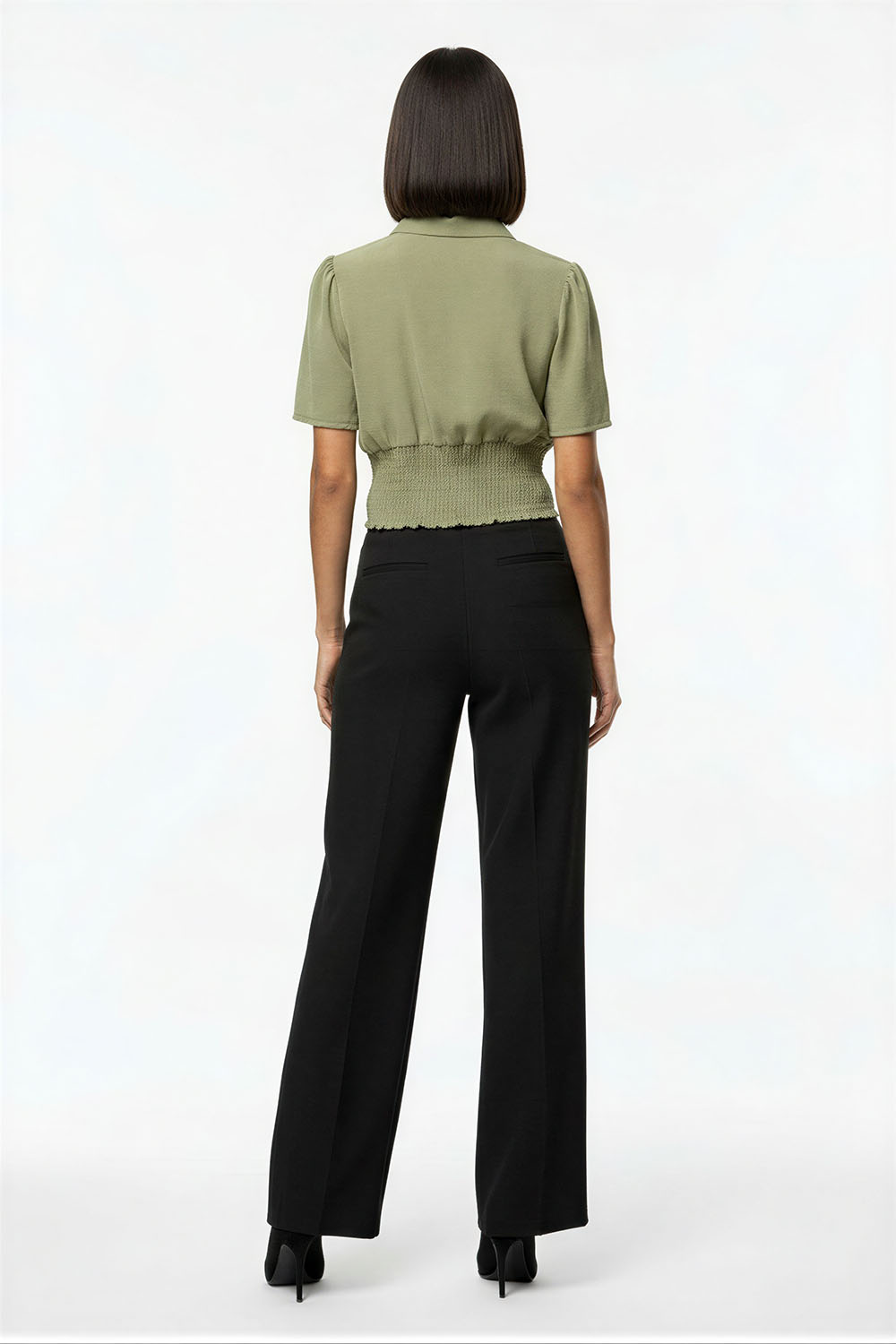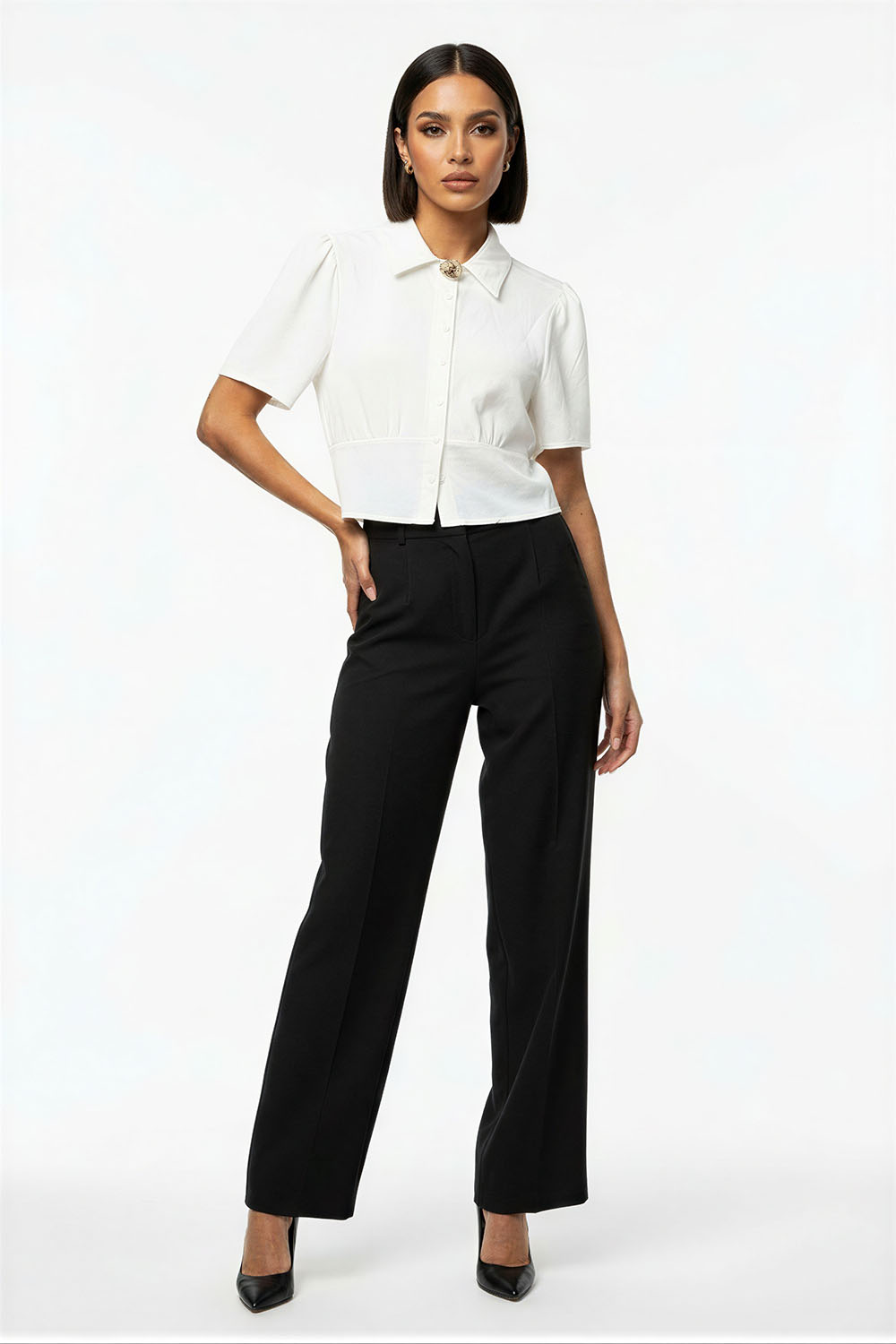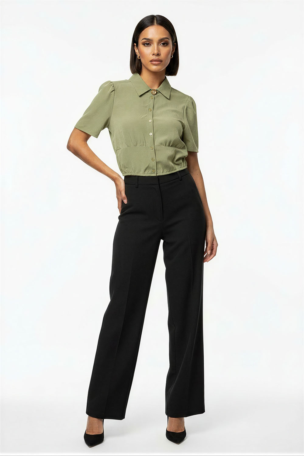 Blusa de corte recto con cuello camisero que aporta estructura, cierre frontal con botones funcionales que facilita su colocación, detalle de broche en parte superior que añade acabado distintivo, manga corta con ligero volumen que brinda comodidad, confección ligera que favorece el uso diario