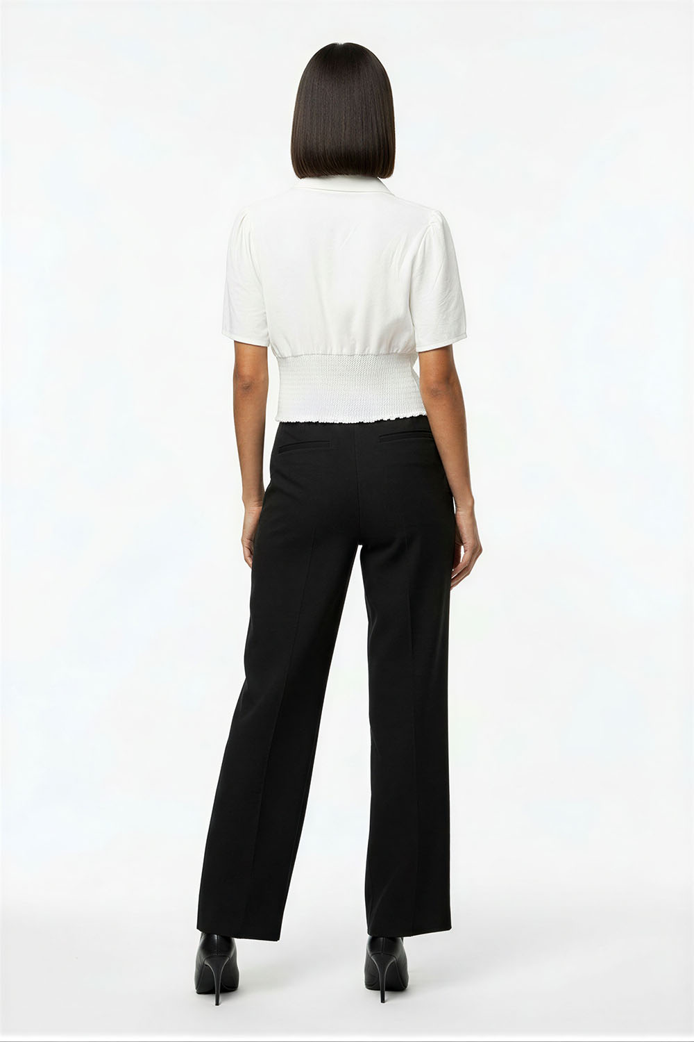 Blusa de manga corta con detalle de tablones al frente y cuello redondo cerrado, caída ligera que aporta movimiento natural, corte recto que brinda amplitud cómoda, hombros con ligero volumen que estructuran la silueta, confección fresca para uso continuo