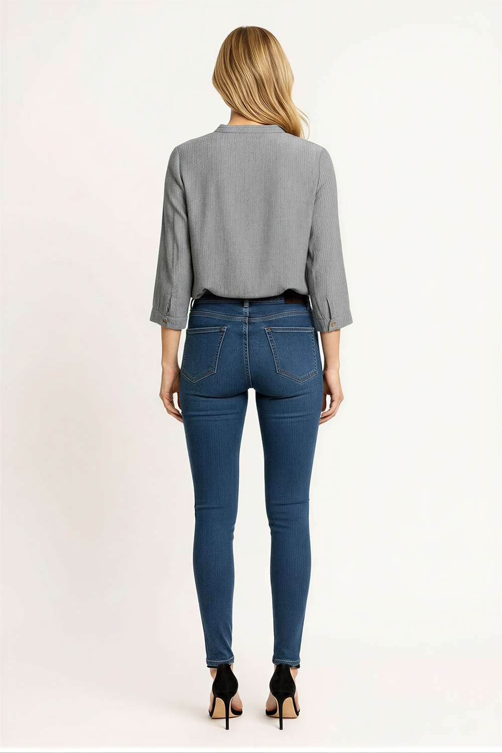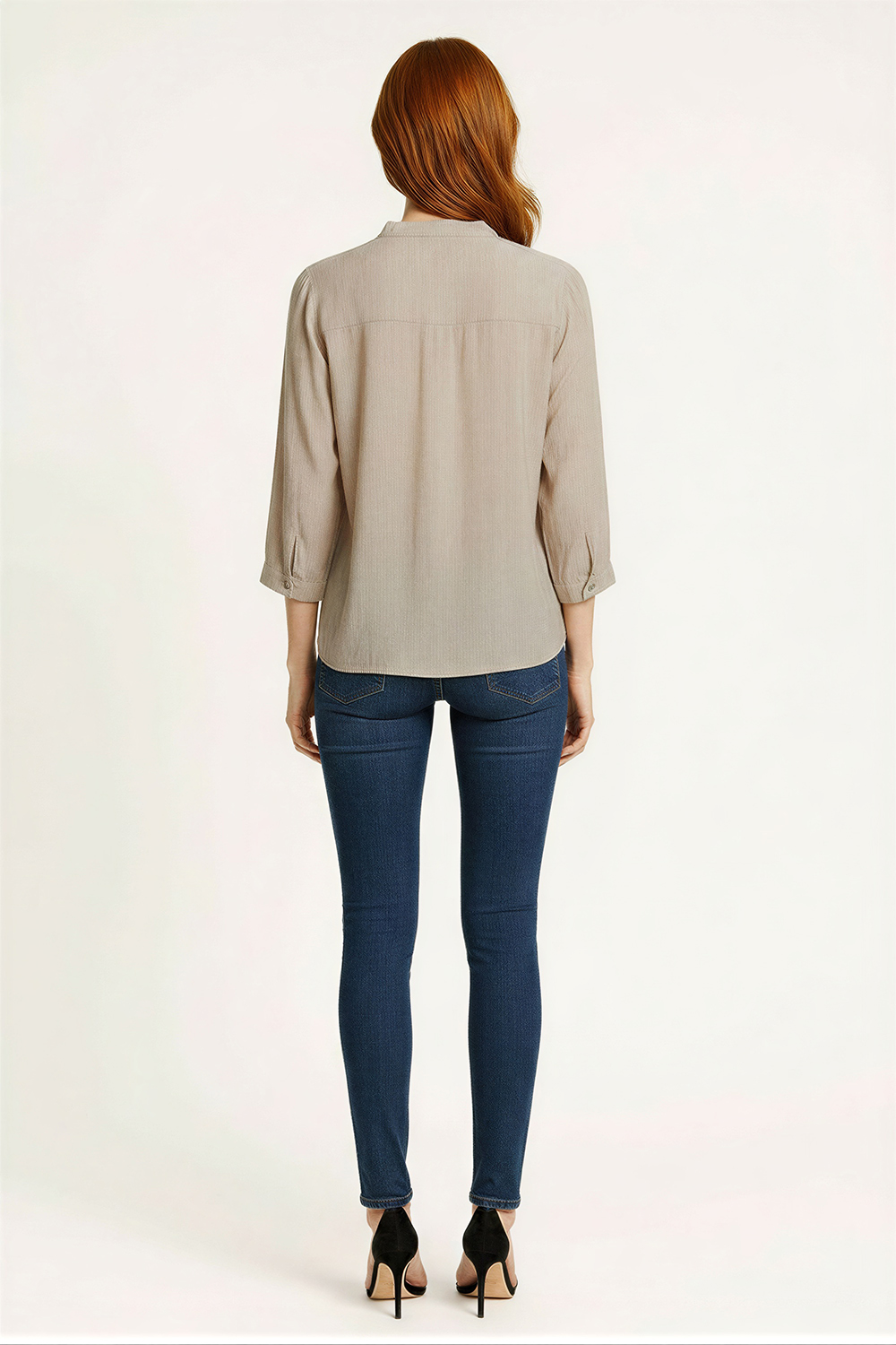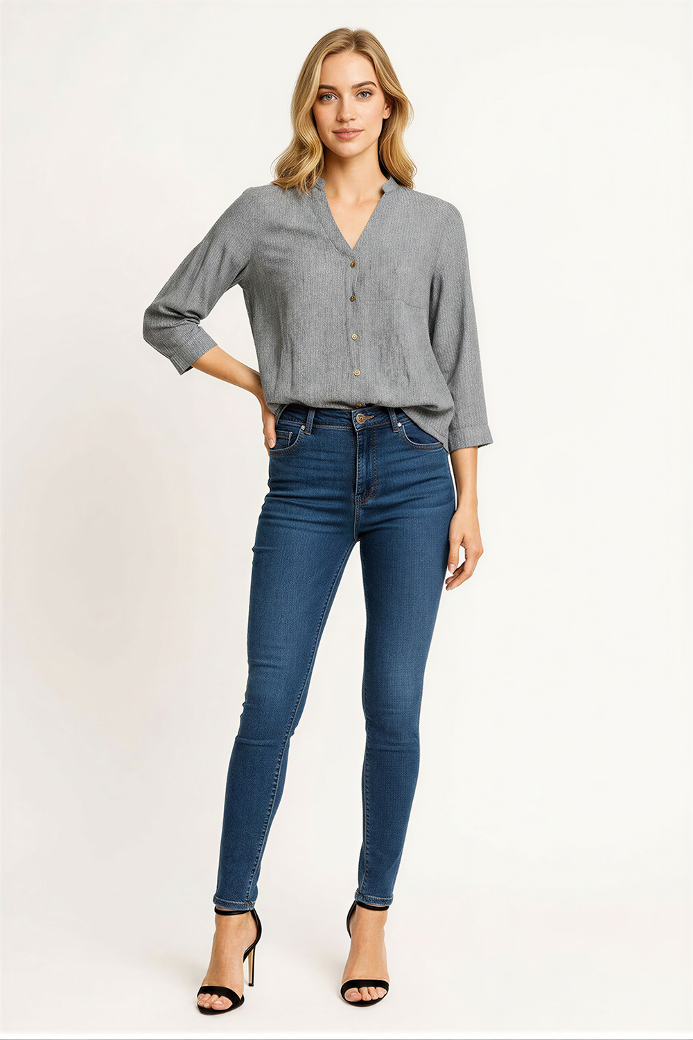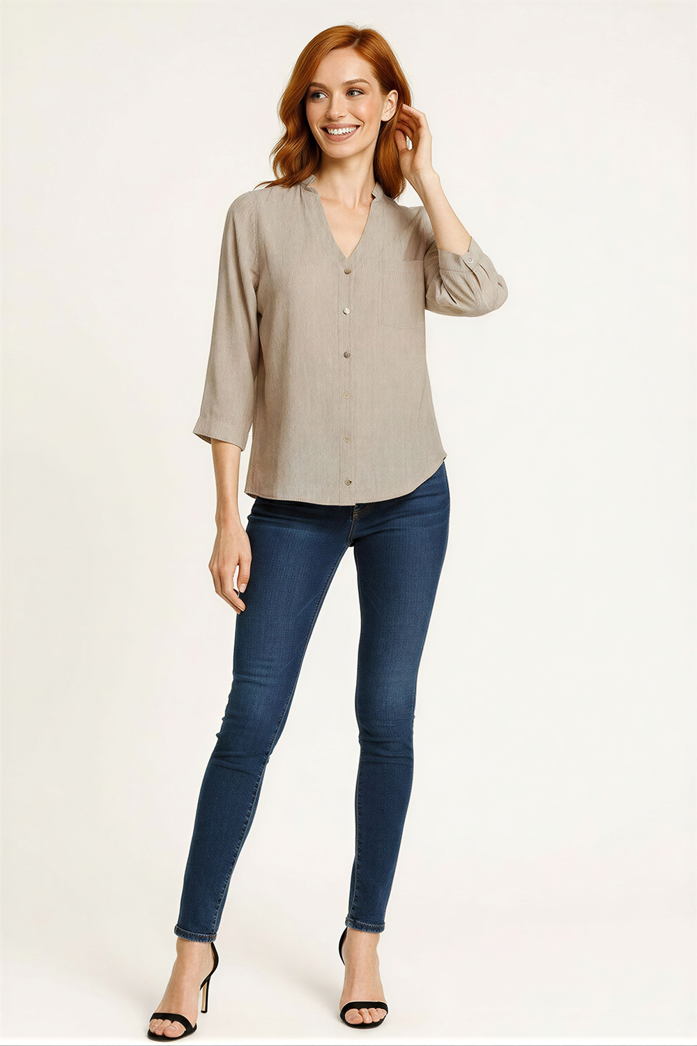 Blusa de manga larga con escote en V y botonadura frontal que facilita el ajuste, corte recto que brinda comodidad, cuello con ligera estructura que aporta definición, largo a la cadera que favorece su uso diario, confección ligera que permite libertad de movimiento