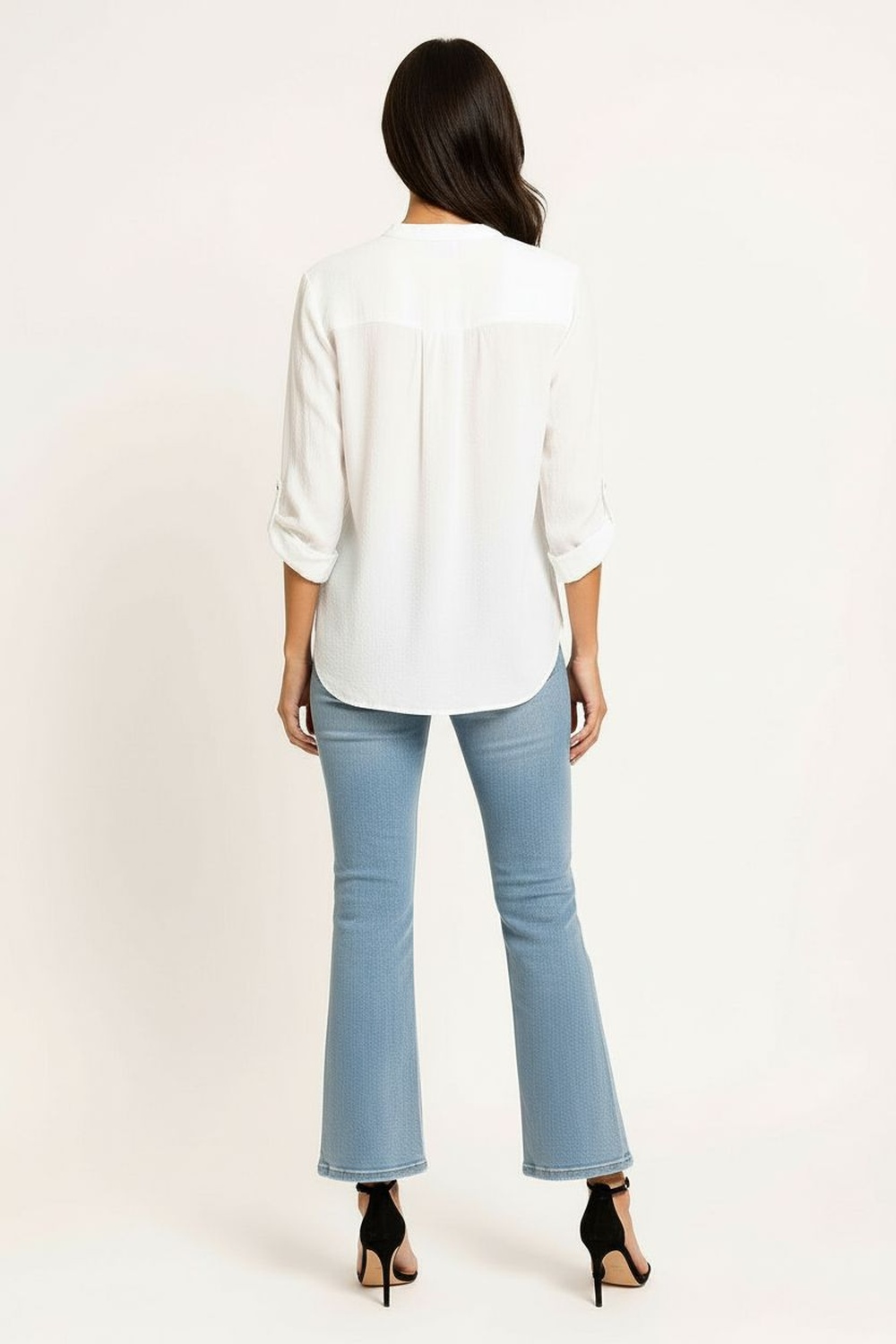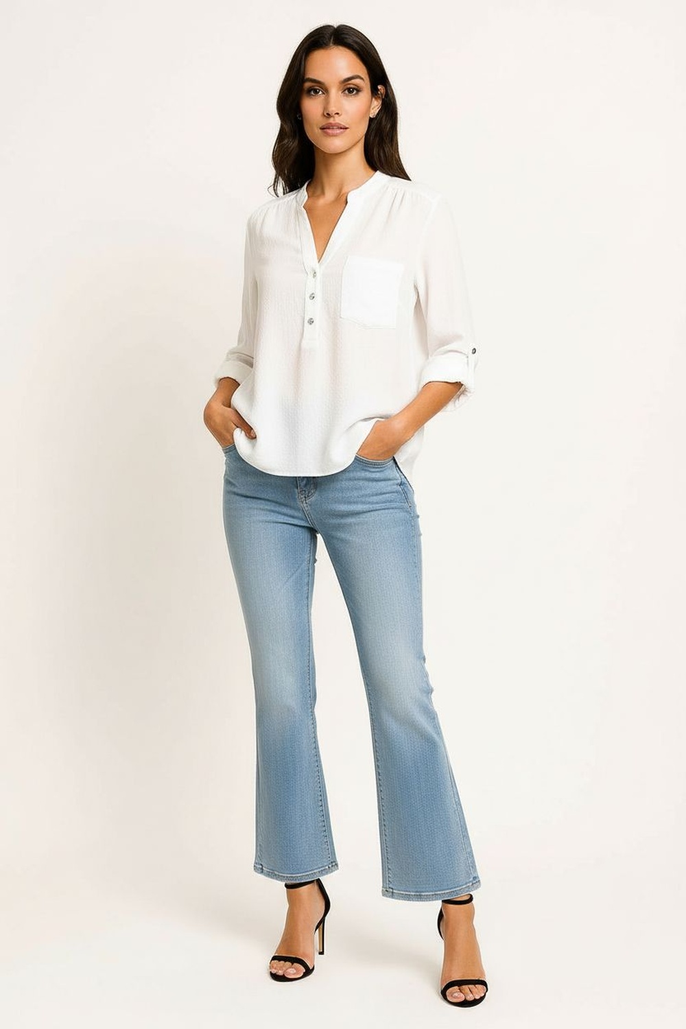 Blusa camisera con cuello clásico y botonadura al frente que aporta un toque refinado, manga corta doblada con terminación limpia, bolsillo delantero funcional, confección en tejido fluido con caída natural que asegura confort y frescura en cualquier ocasión