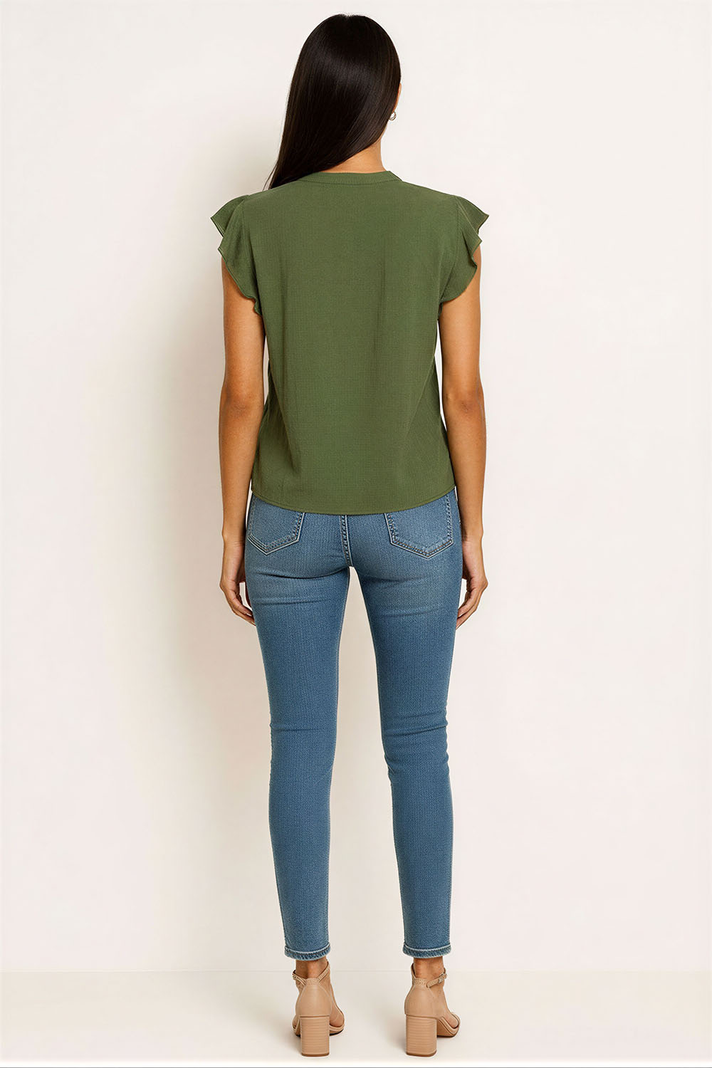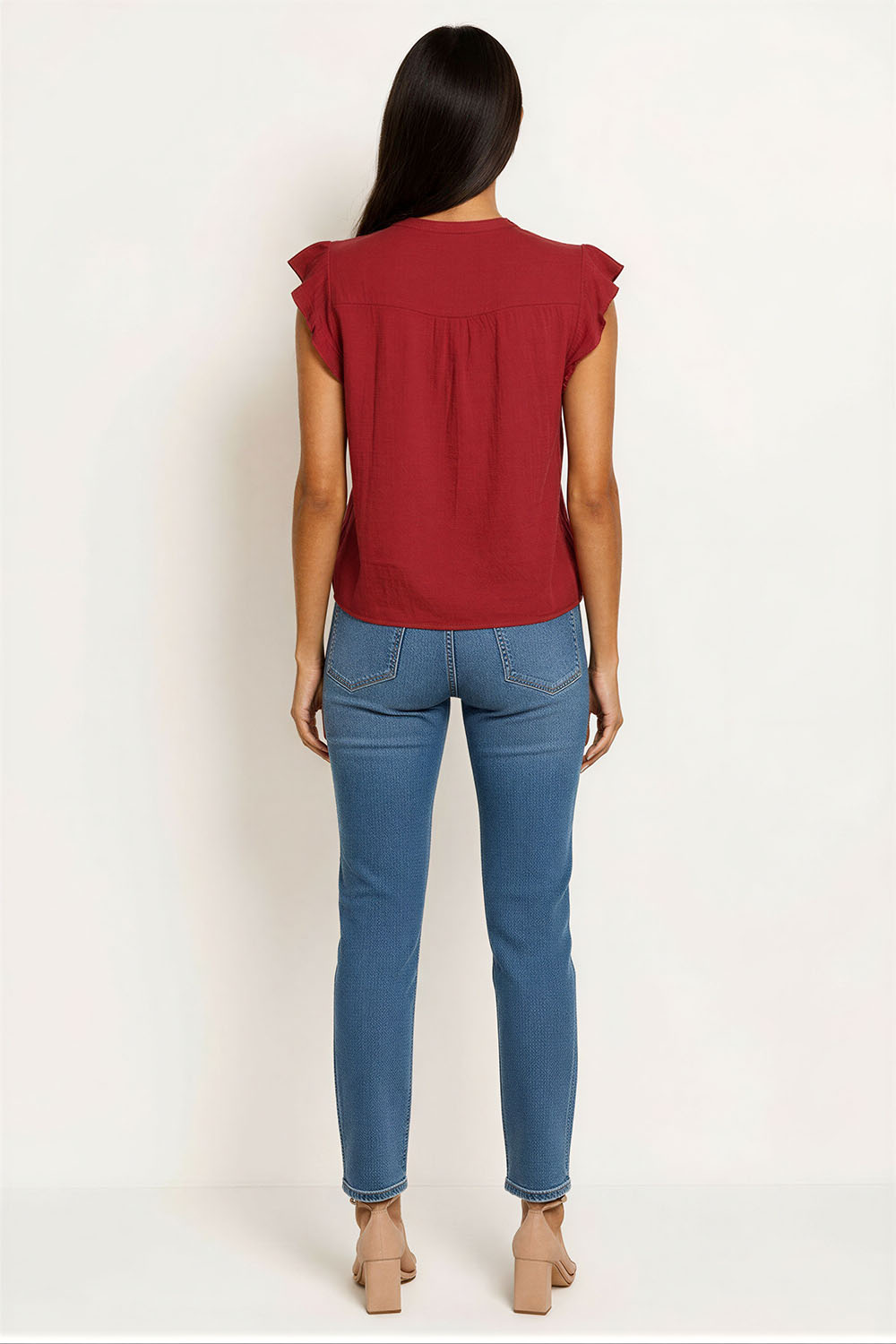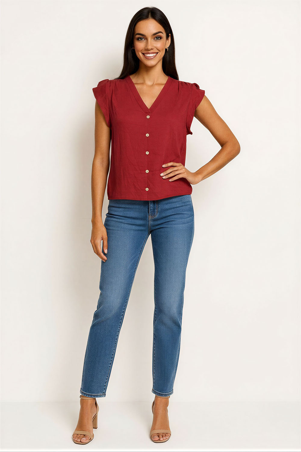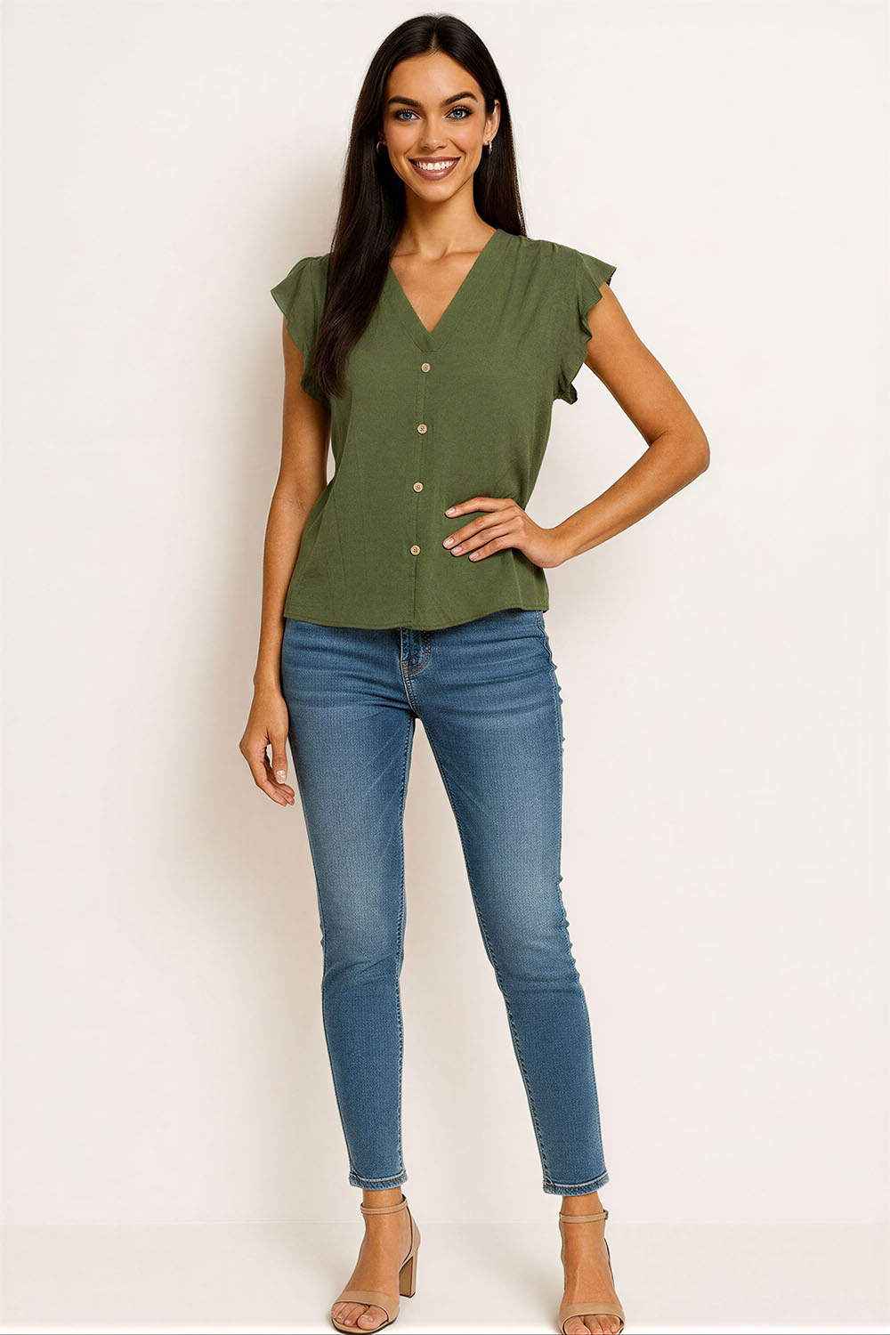 Blusa de corte relajado con escote en V que estiliza la parte superior, botonadura frontal funcional que facilita el uso, manga corta con ligero vuelo que aporta frescura y movimiento, confección en tela ligera de caída suave que brinda comodidad durante el día, diseño fluido que permite libertad de movimiento