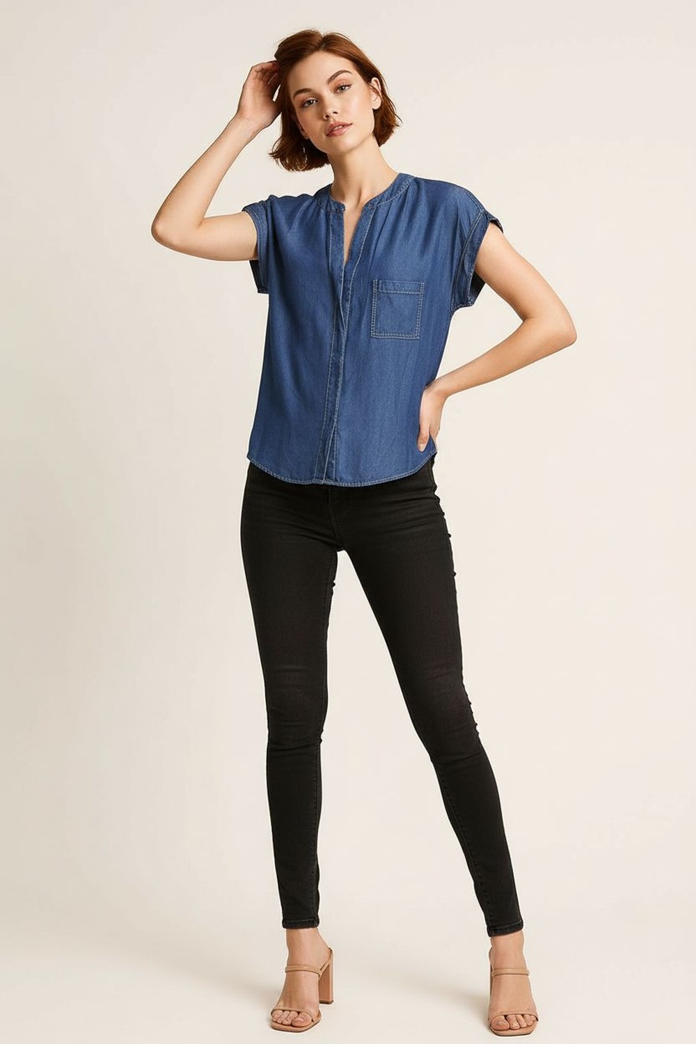 Blusa manga corta con escote en V y tapeta frontal decorativa, corte recto que brinda caída ligera y cómoda, bolsillo aplicado al frente que aporta funcionalidad, detalle de botones en espalda que añade diseño distintivo, confección en tela suave al tacto con acabado ligero y fresco para uso diario
