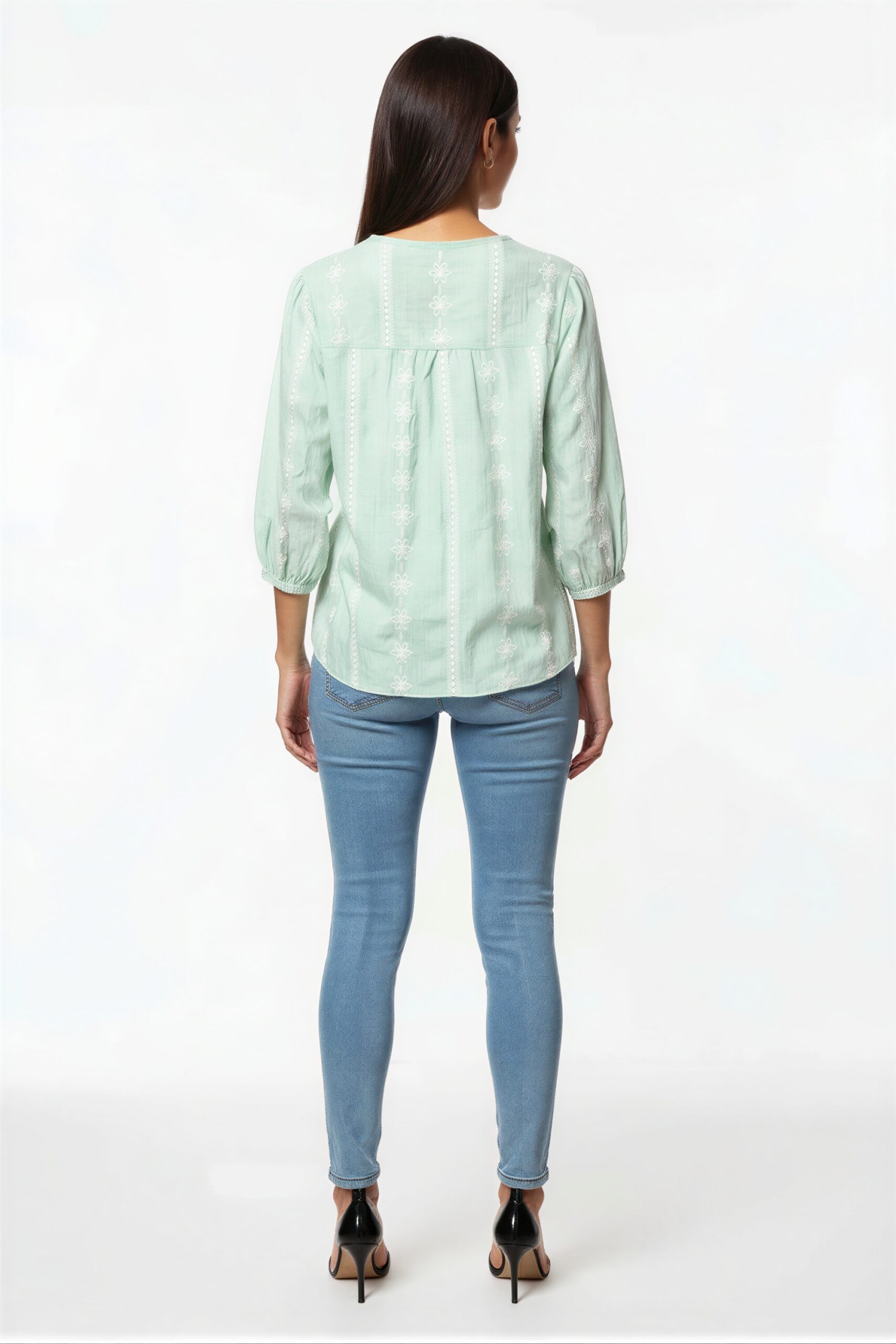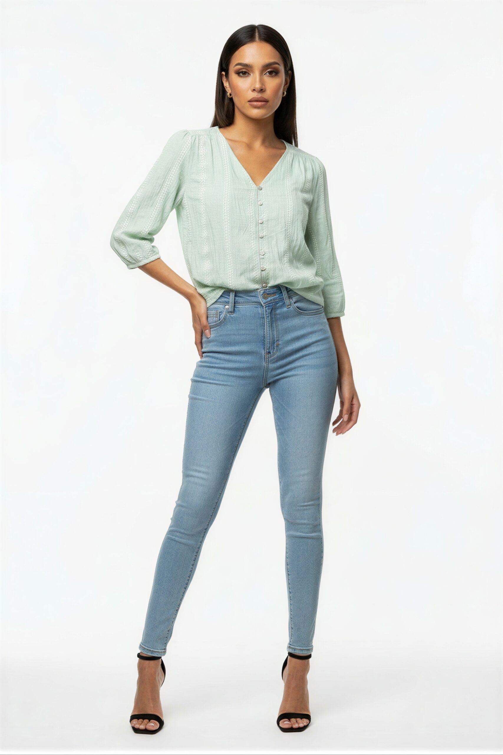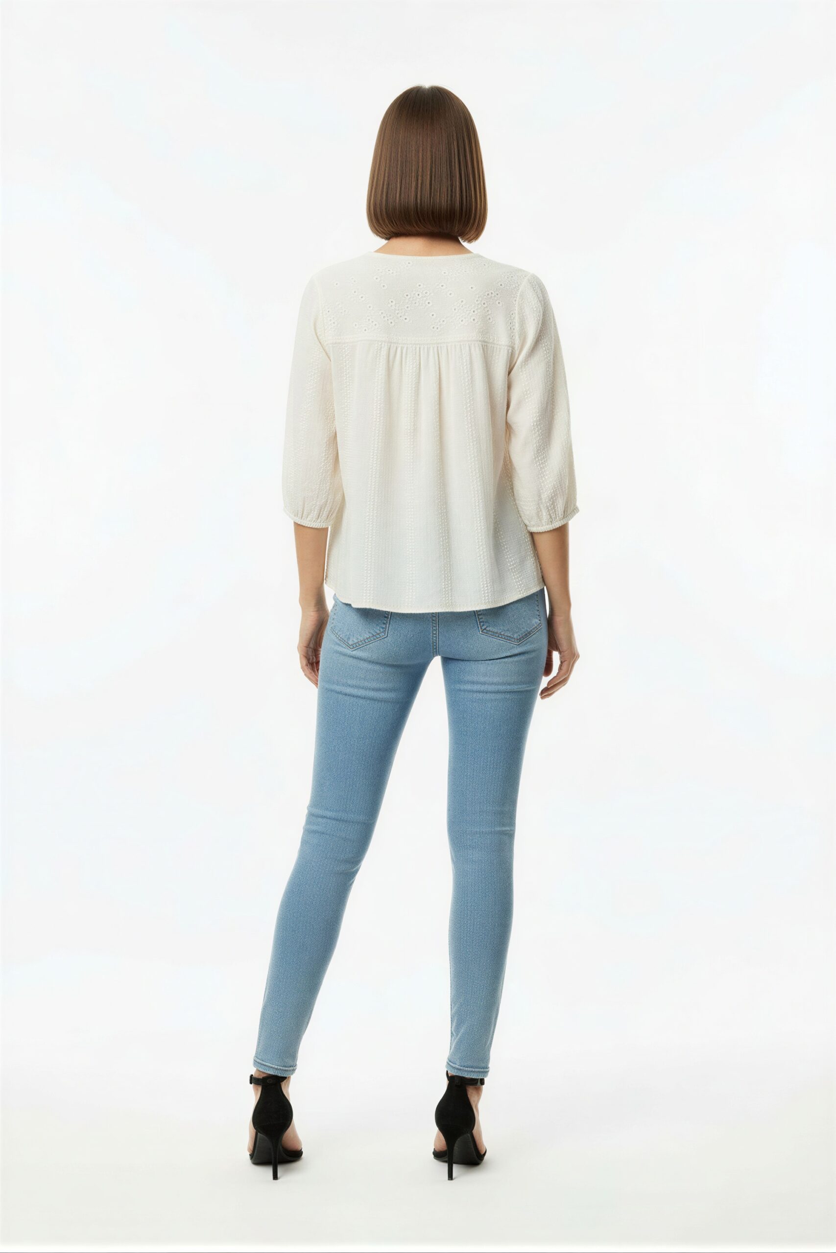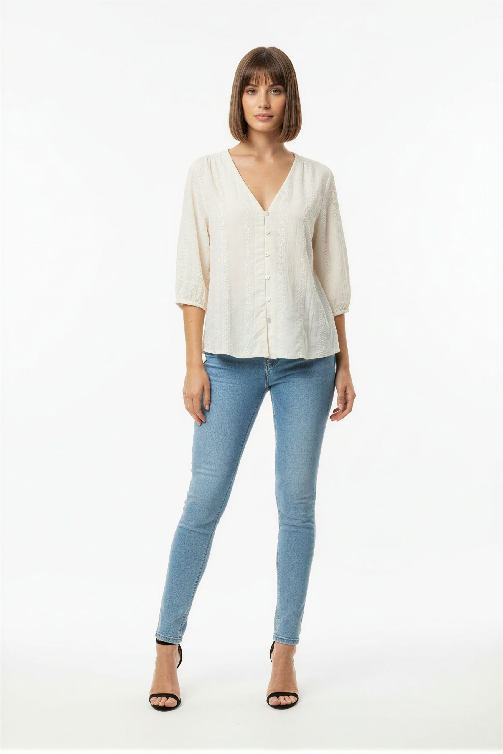 Blusa con escote en v, botonadura frontal y textura con aplicación decorativa en superficie