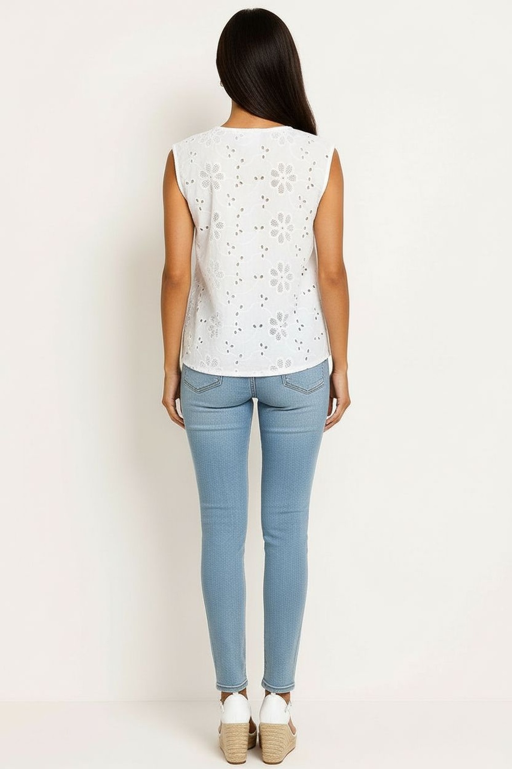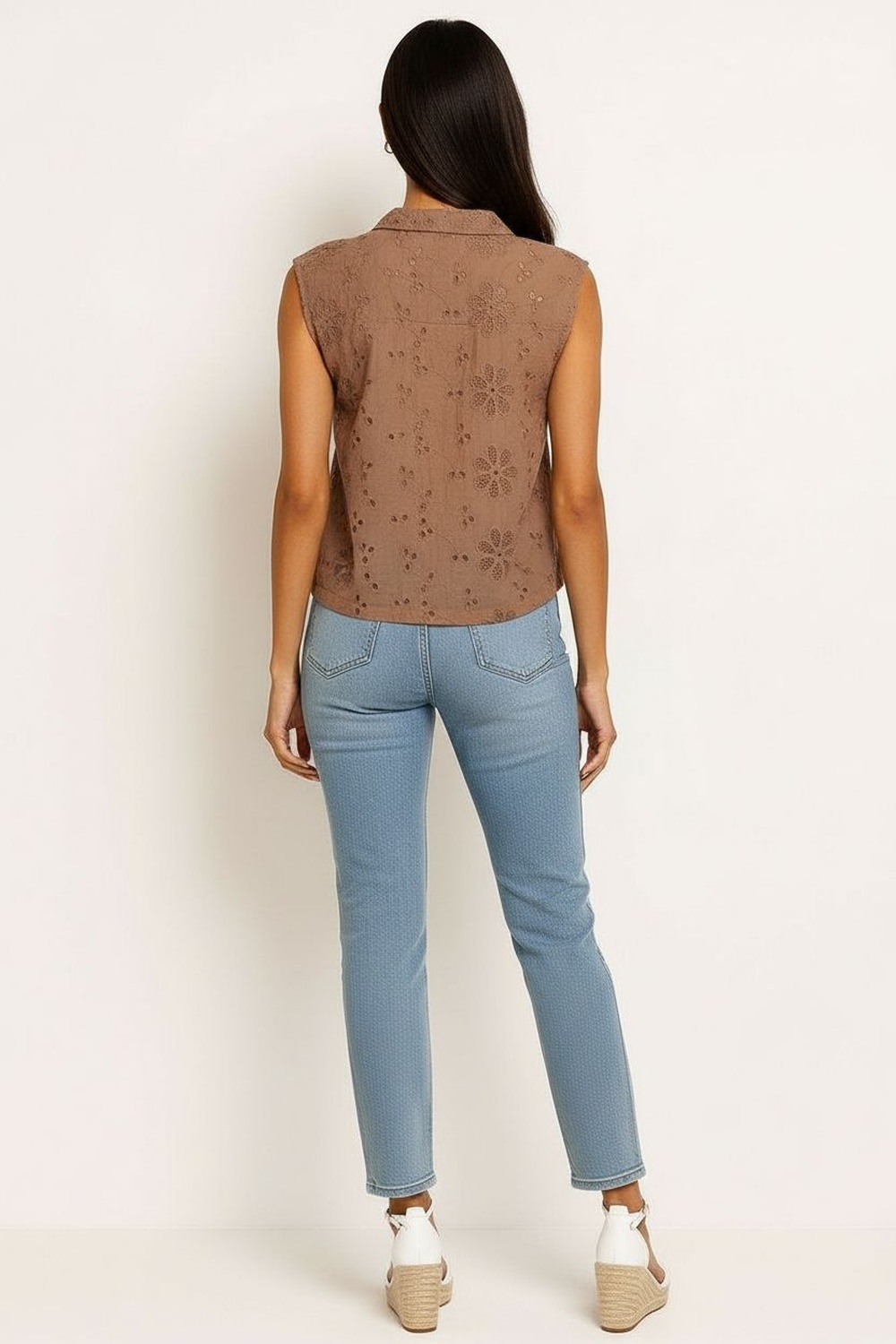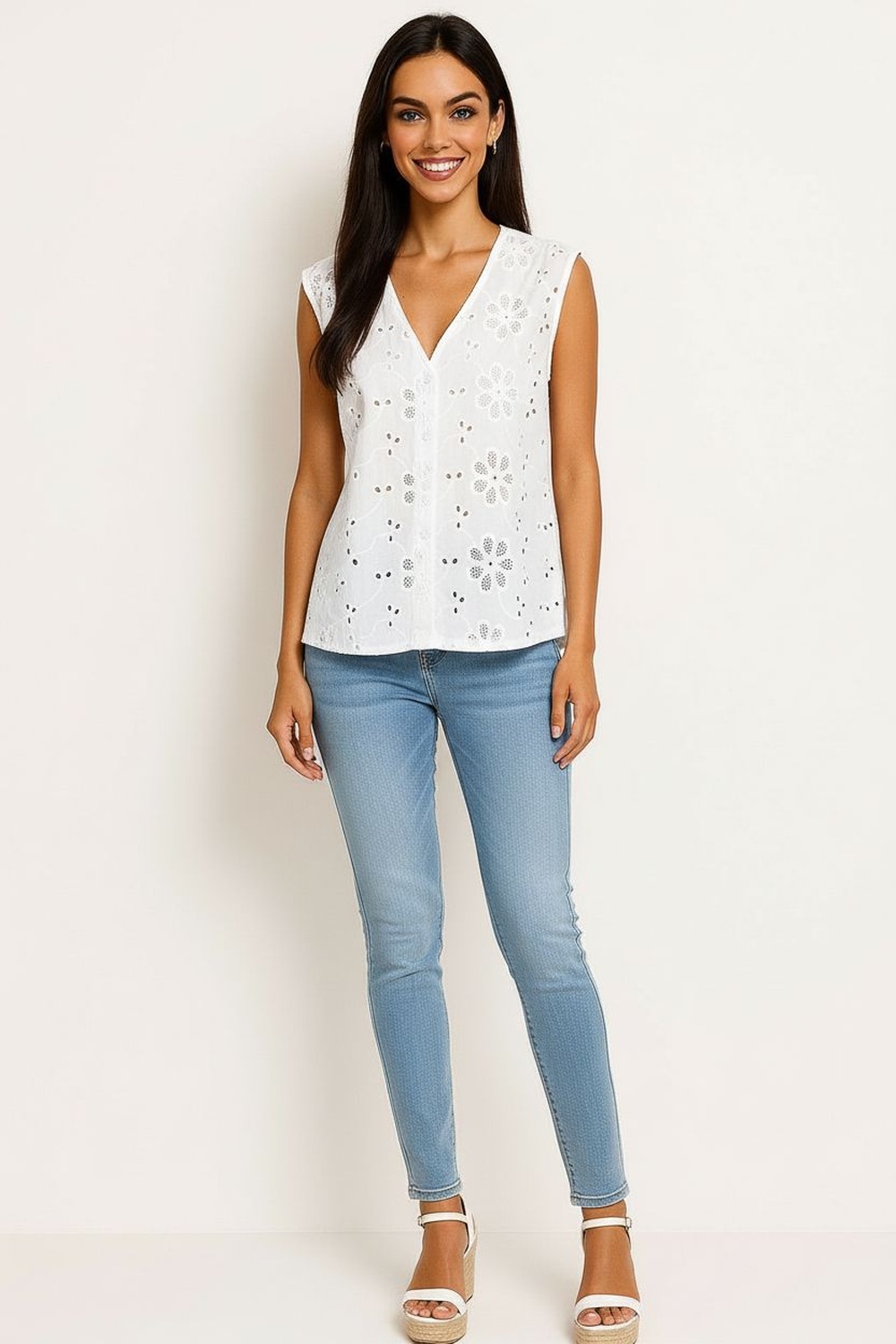Blusa sin mangas con escote en v y botones funcionales al frente, corte recto que se adapta con comodidad, largo a la cadera que facilita el movimiento, confección en tejido ligero con textura suave, acabados prolijos en escote y ruedo