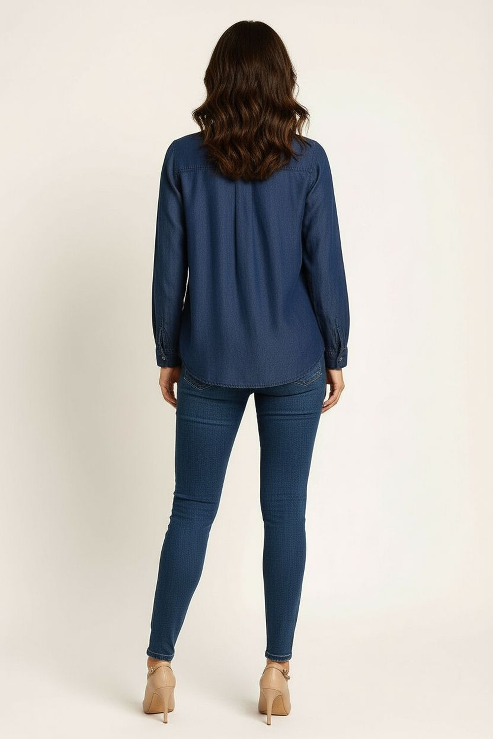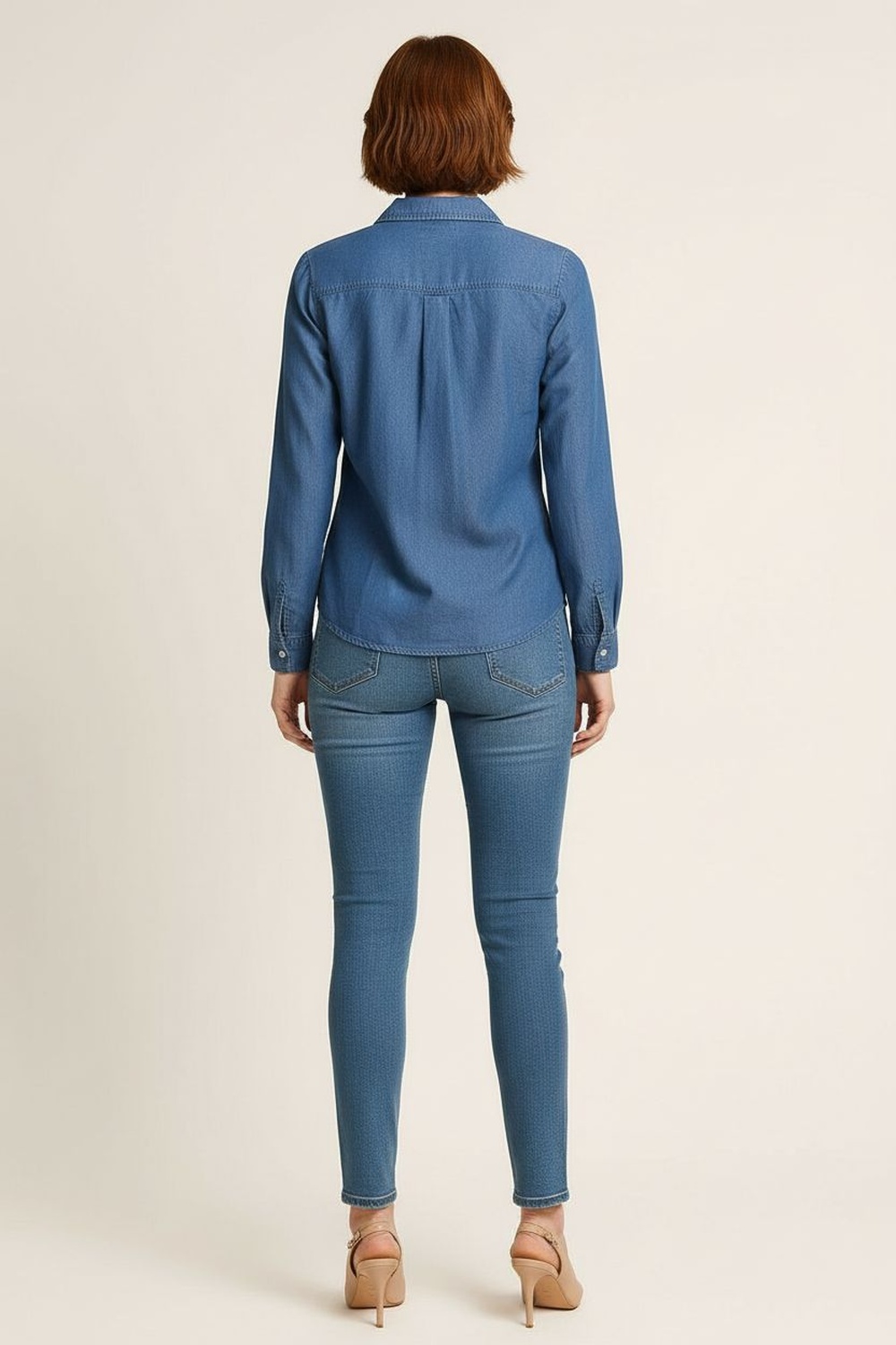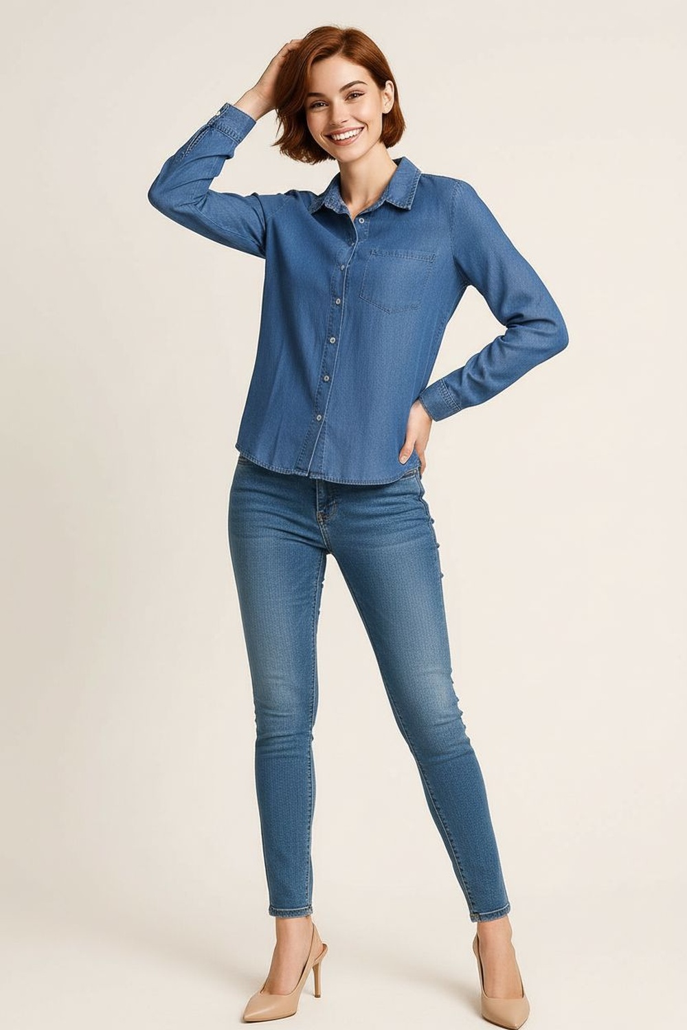 Blusa de manga larga con cuello clásico y botonadura completa, bolsillo frontal funcional, confección en mezclilla ligera que mejora la movilidad, corte recto que brinda comodidad todo el día