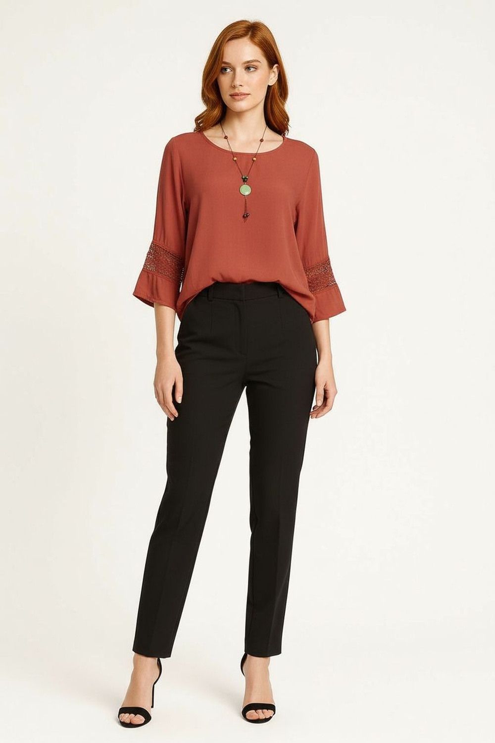 Blusa femenina de manga larga con detalles de encaje en las mangas, que aportan un toque romántico y elegante