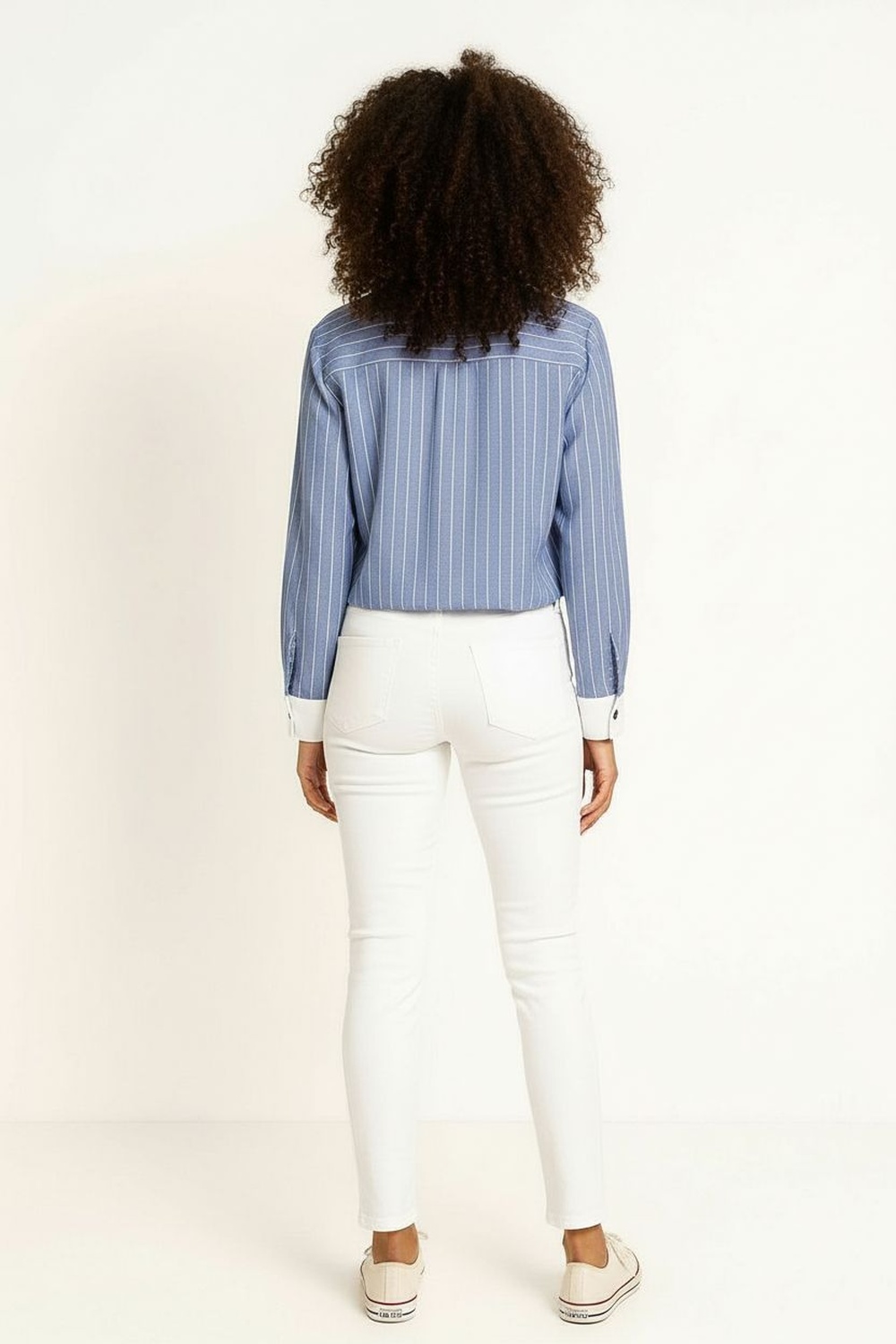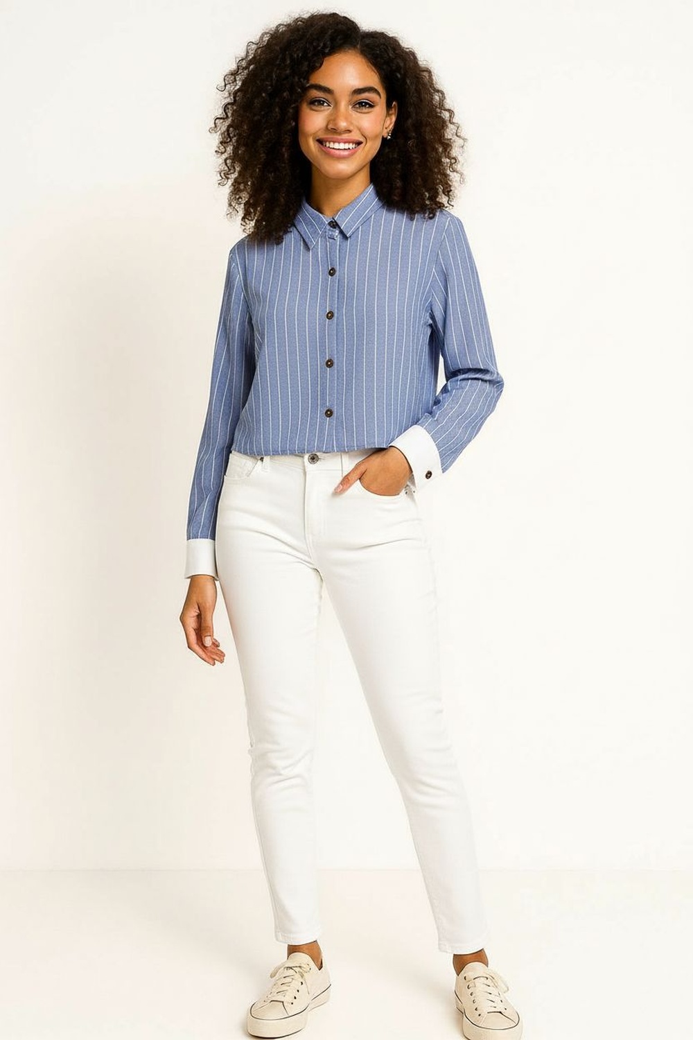 Blusa de manga larga con cuello camisero clásico que aporta un estilo elegante, diseño a rayas verticales que estilizan la silueta, puños en contraste que añaden un detalle moderno, botonadura frontal que facilita el ajuste, prenda versátil ideal para outfits casuales o de oficina