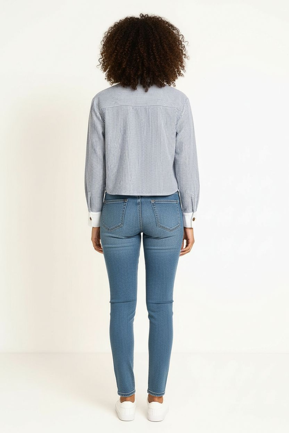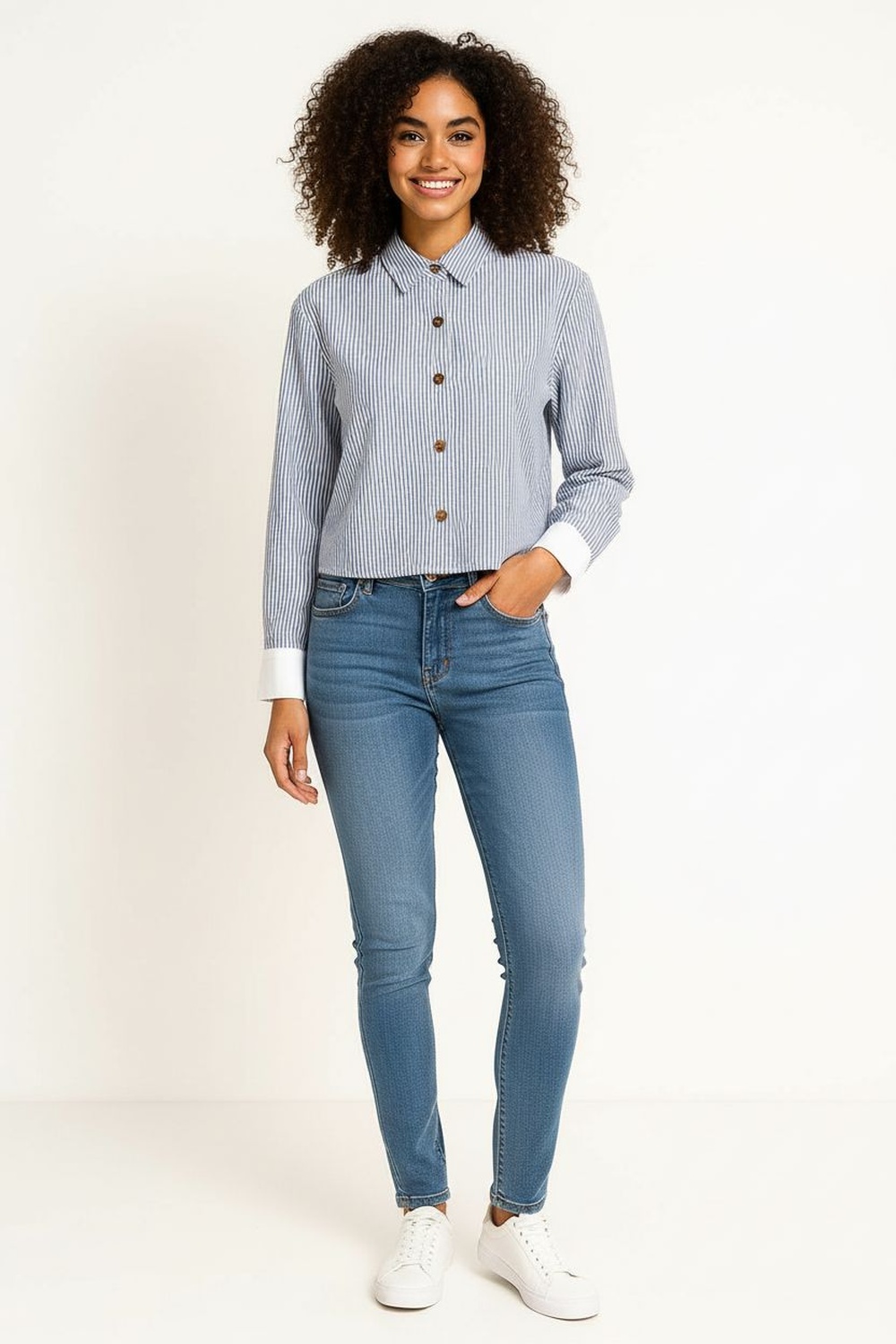 Blusa crop tipo camisera confeccionada en tela popelina de tacto ligero y fresco, cuello clásico que aporta un acabado formal, botones al frente que permiten cierre práctico y elegante, pinzas y cortes en cintura que definen la silueta y realzan la figura, mangas largas ajustadas con puño sencillo que añaden un toque versátil, ideal para combinar en outfits casuales y de oficina con un aire moderno