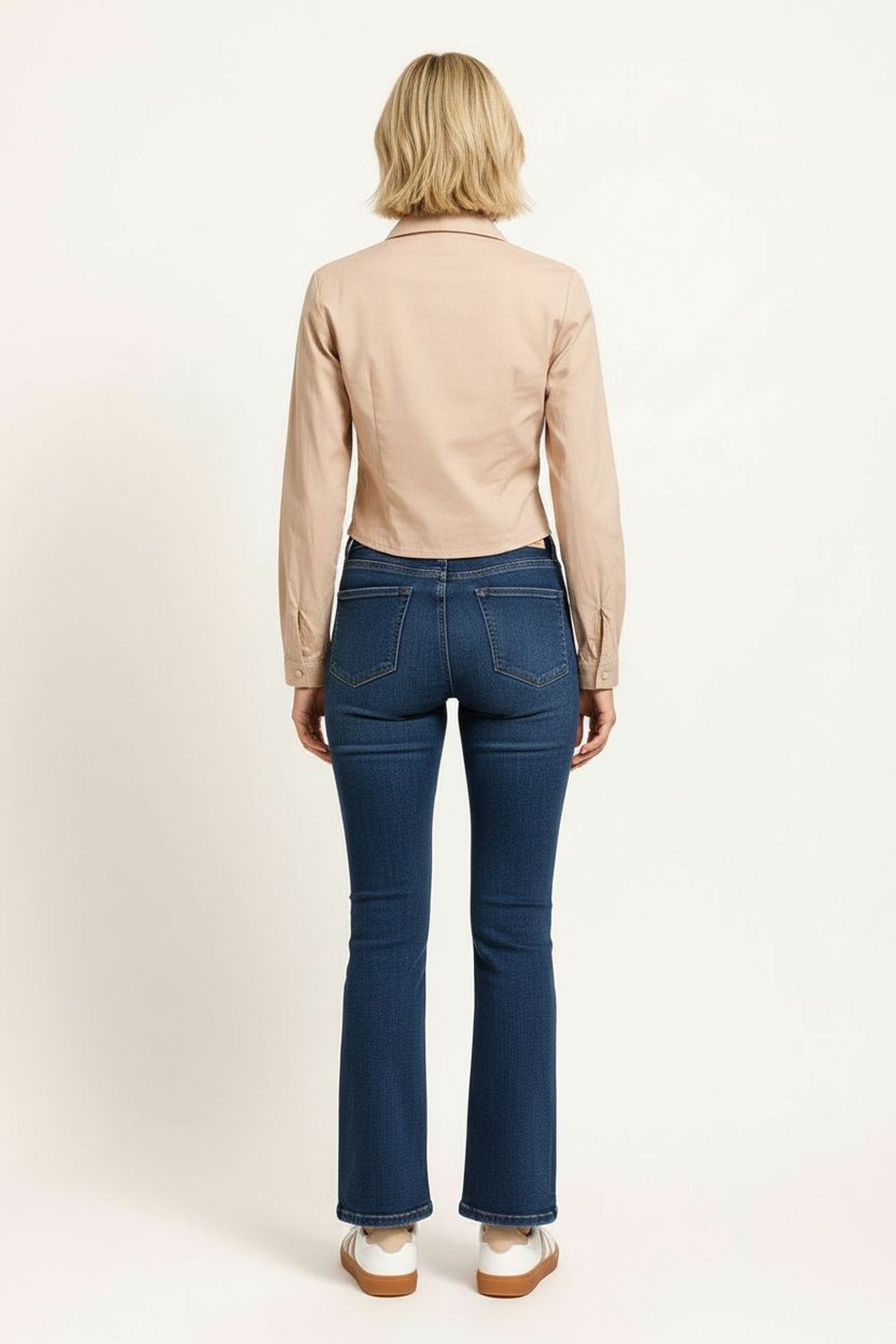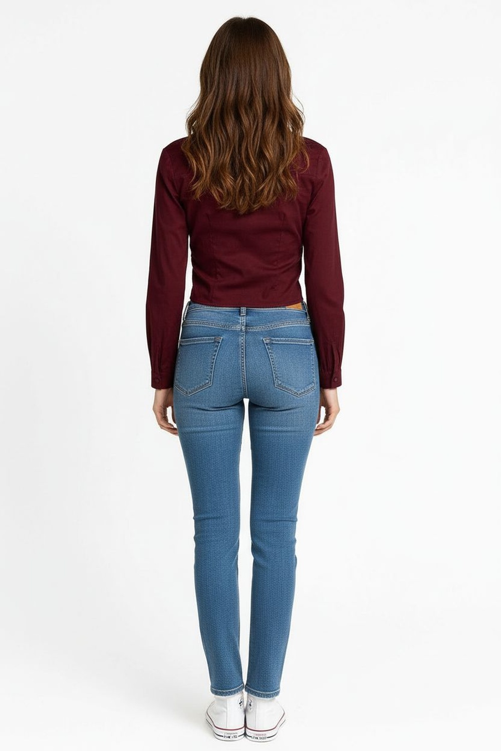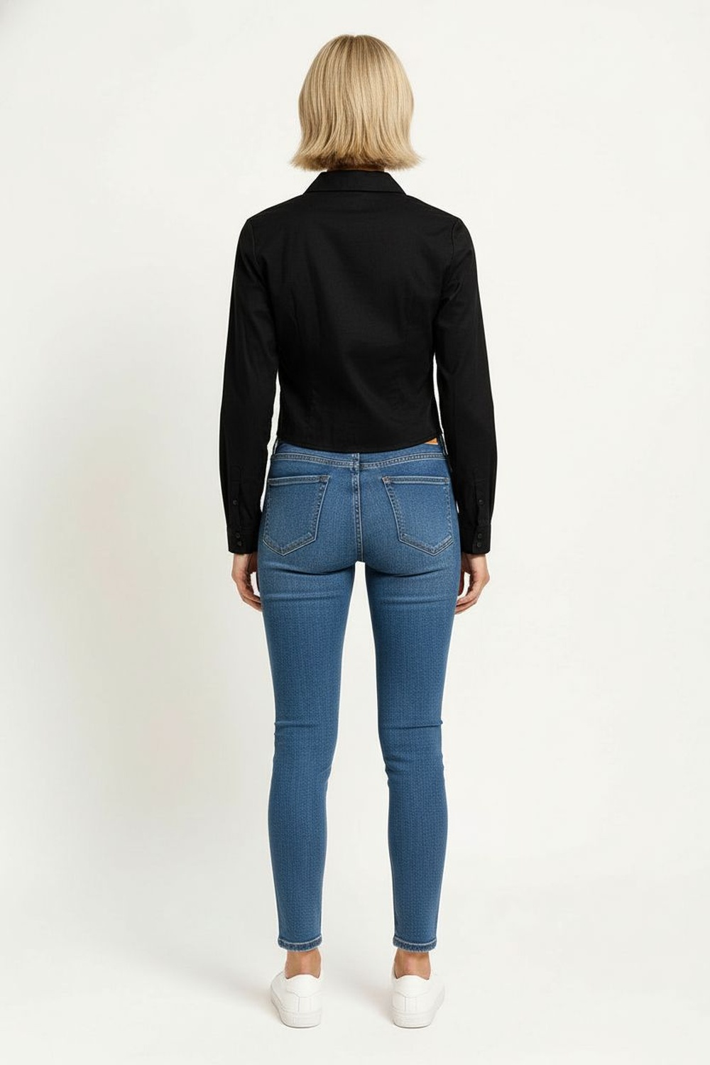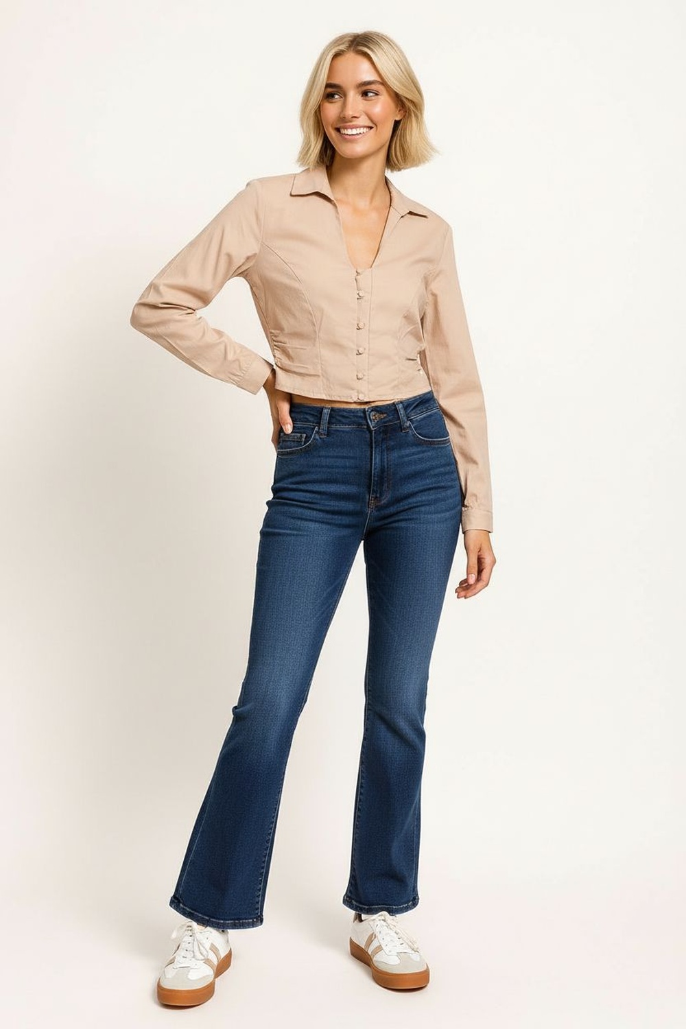 Blusa de manga larga con cuello camisero de líneas definidas, botonadura frontal completa que permite ajuste personalizado, confección ligera con caída natural, corte a la cintura con frunce sutil que aporta estructura y realce