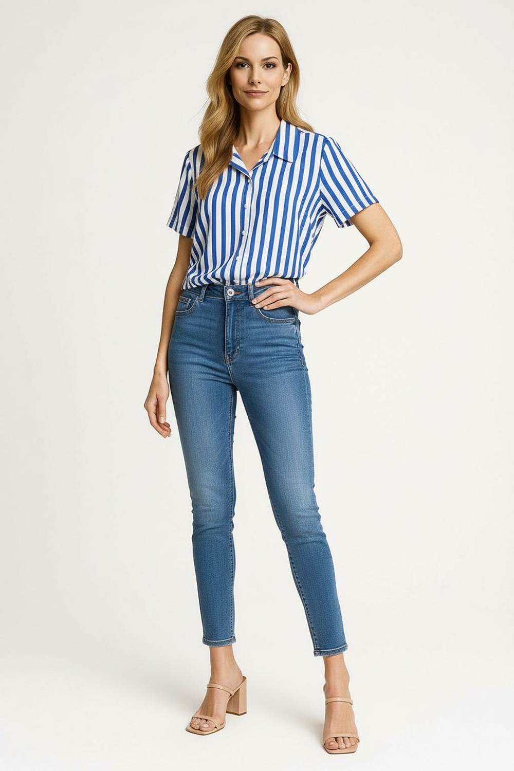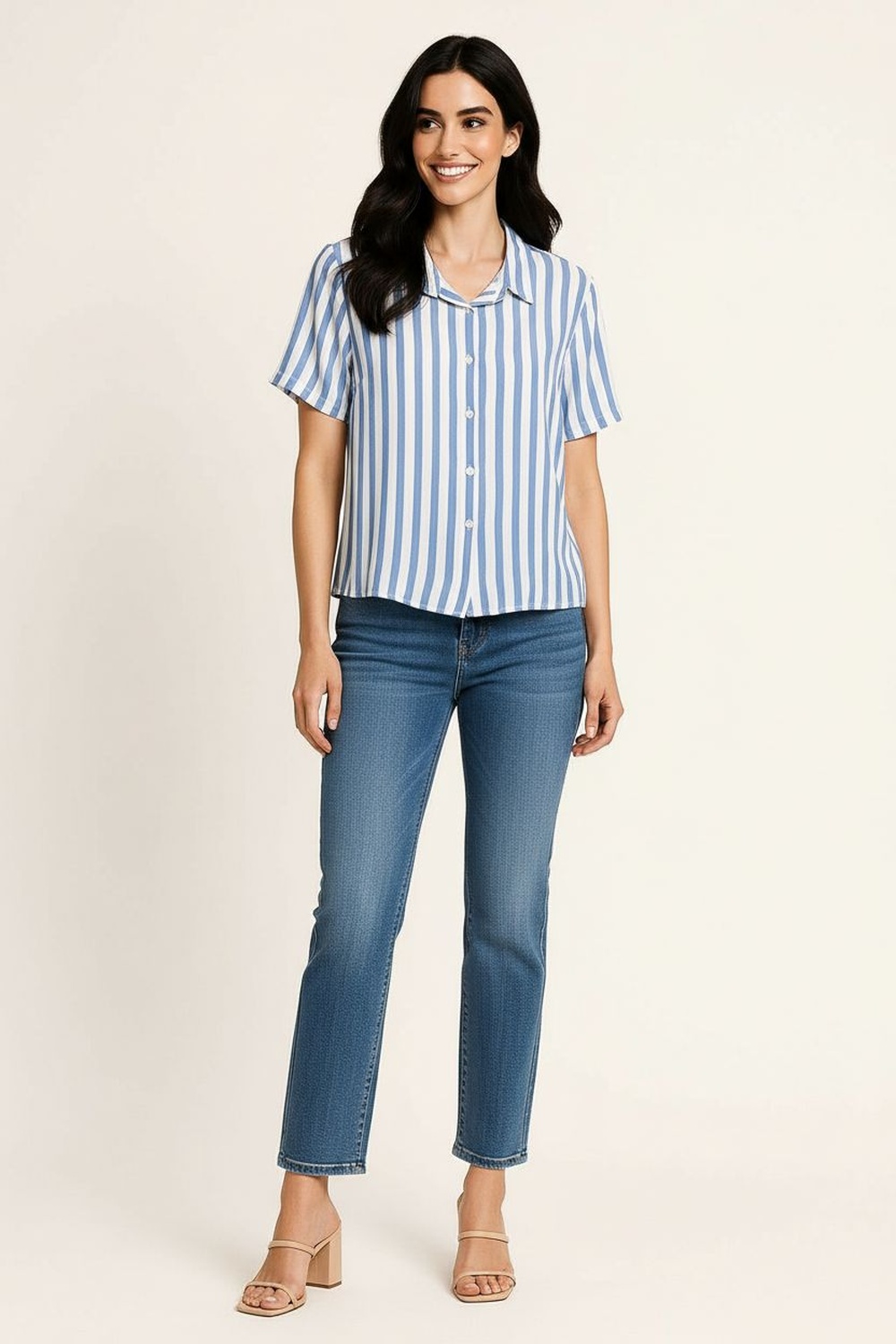Blusa camisera con botonadura al frente que aporta un toque clásico y práctico, cuello con solapa estructurada que realza el diseño, charreteras decorativas en hombros que añaden un detalle distintivo, mangas tres cuartos con ajuste mediante trabilla y botón que permiten adaptar el largo según la ocasión, confección ligera y fresca que proporciona comodidad durante todo el día, silueta recta que otorga un ajuste natural y caída fluida