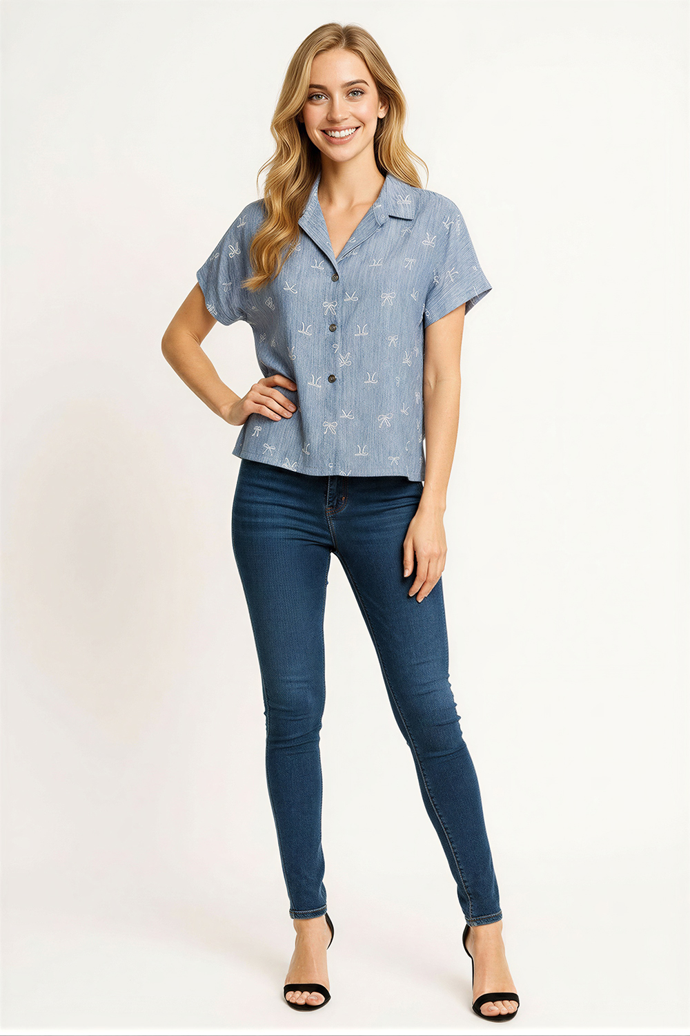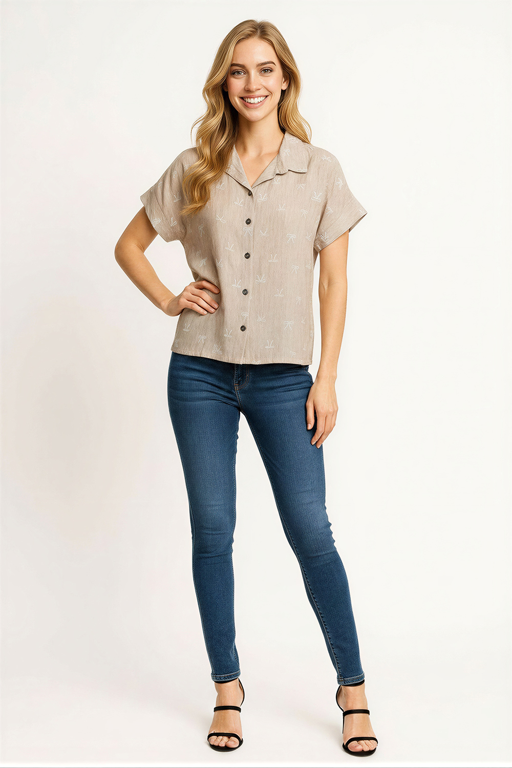 Blusa tipo camisera con cuello tradicional que aporta estructura, cierre frontal con botones que facilita su uso, manga corta que brinda frescura, corte recto que permite un ajuste cómodo, confección en tejido ligero con textura suave que favorece la transpiración y el uso diario