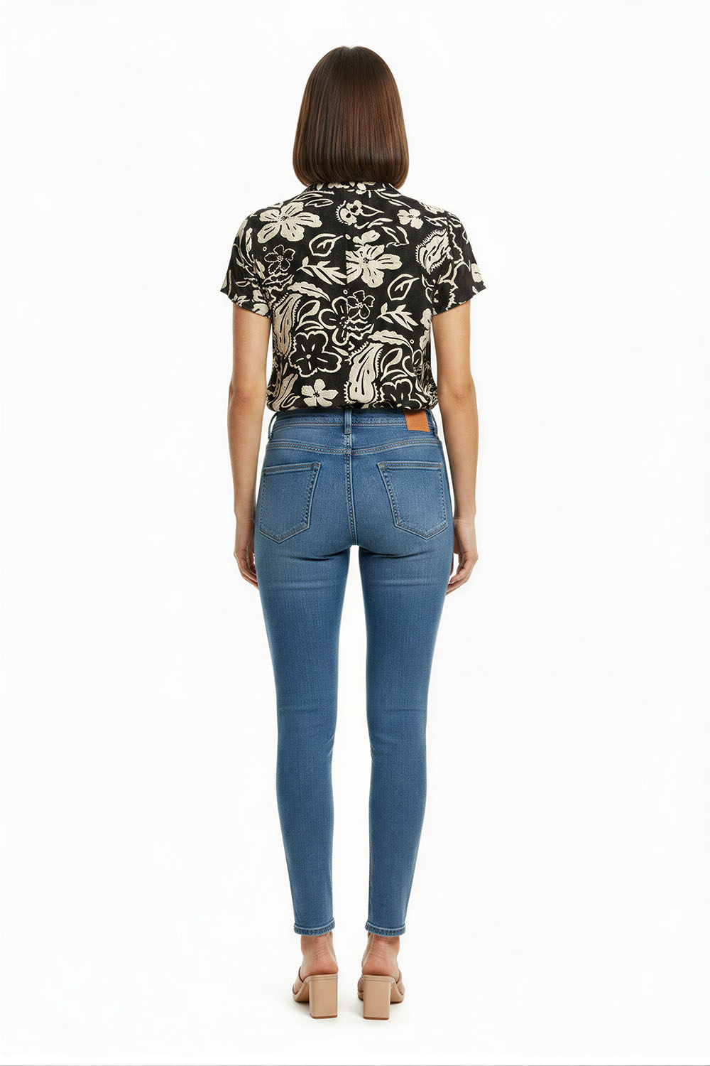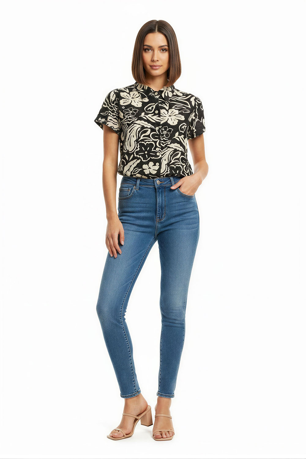Blusa tipo camisera con cuello clásico que aporta estructura, cierre frontal con botones que facilita el uso, mangas cortas que brindan frescura, corte recto que favorece la silueta, confección ligera con caída suave que permite comodidad durante el día