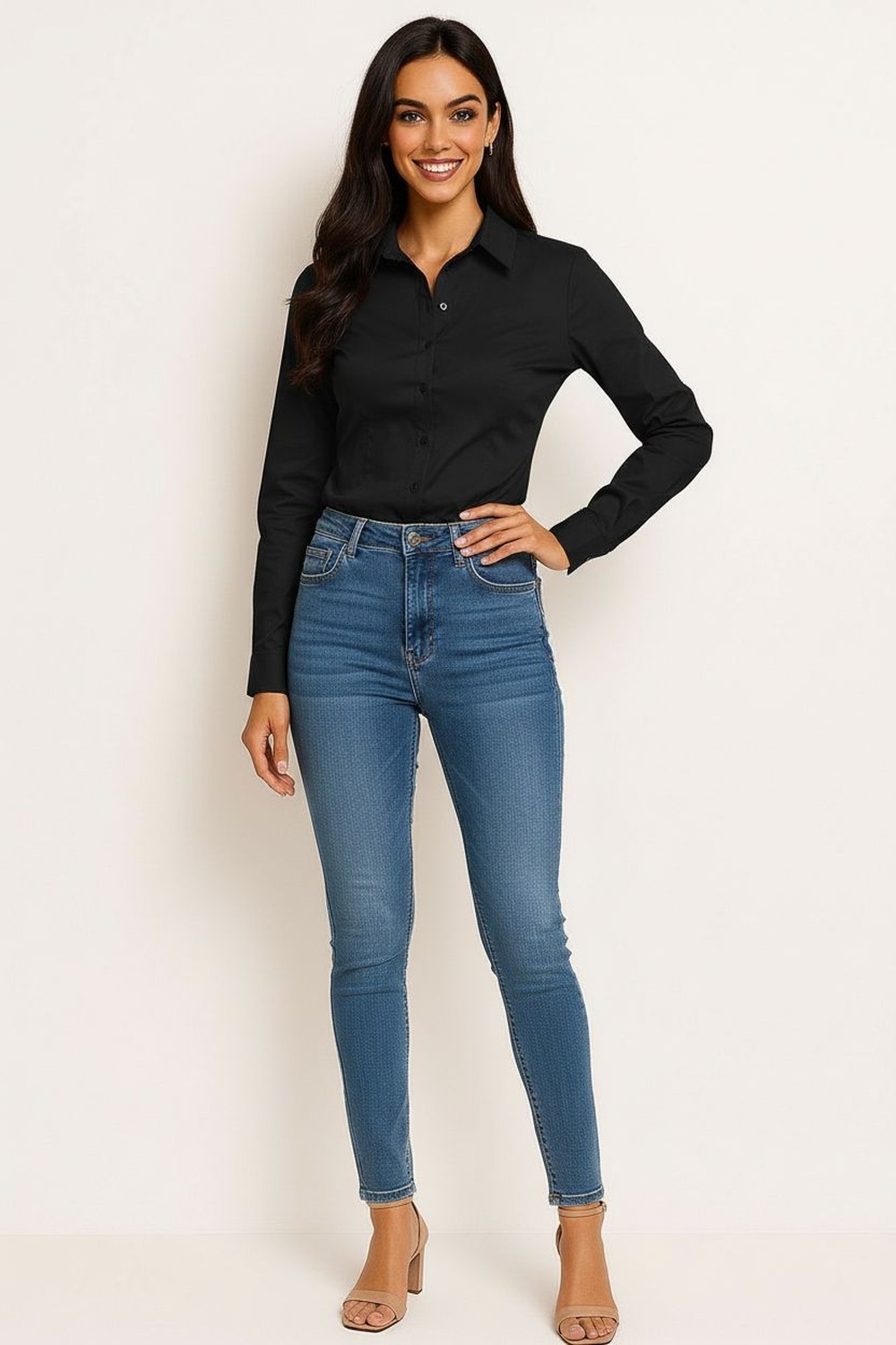 Blusa tipo camisera con cuello clásico y botonadura frontal funcional que permite ajuste personalizado, manga larga con puño estructurado que aporta definición, corte semi entallado que estiliza la silueta, confección en tela suave de acabado liso con largo a la cadera que brinda comodidad y presencia pulida