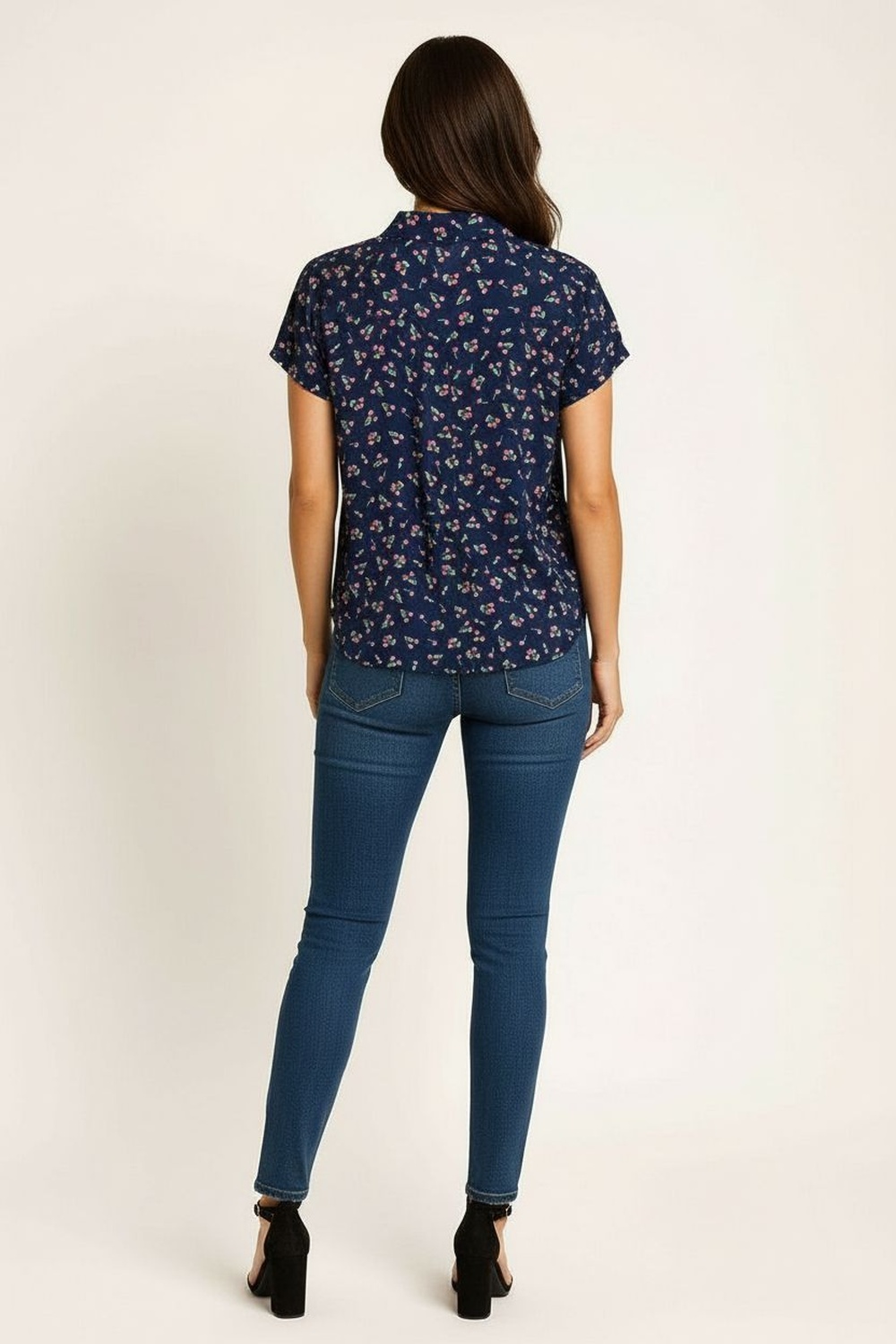 Blusa tipo camisera de corte recto con cuello estructurado y botonadura frontal funcional, mangas cortas con terminación doblada que aportan limpieza visual, confección en tejido ligero de tacto suave, largo a la cadera que permite caída natural, estructura cómoda para uso prolongado