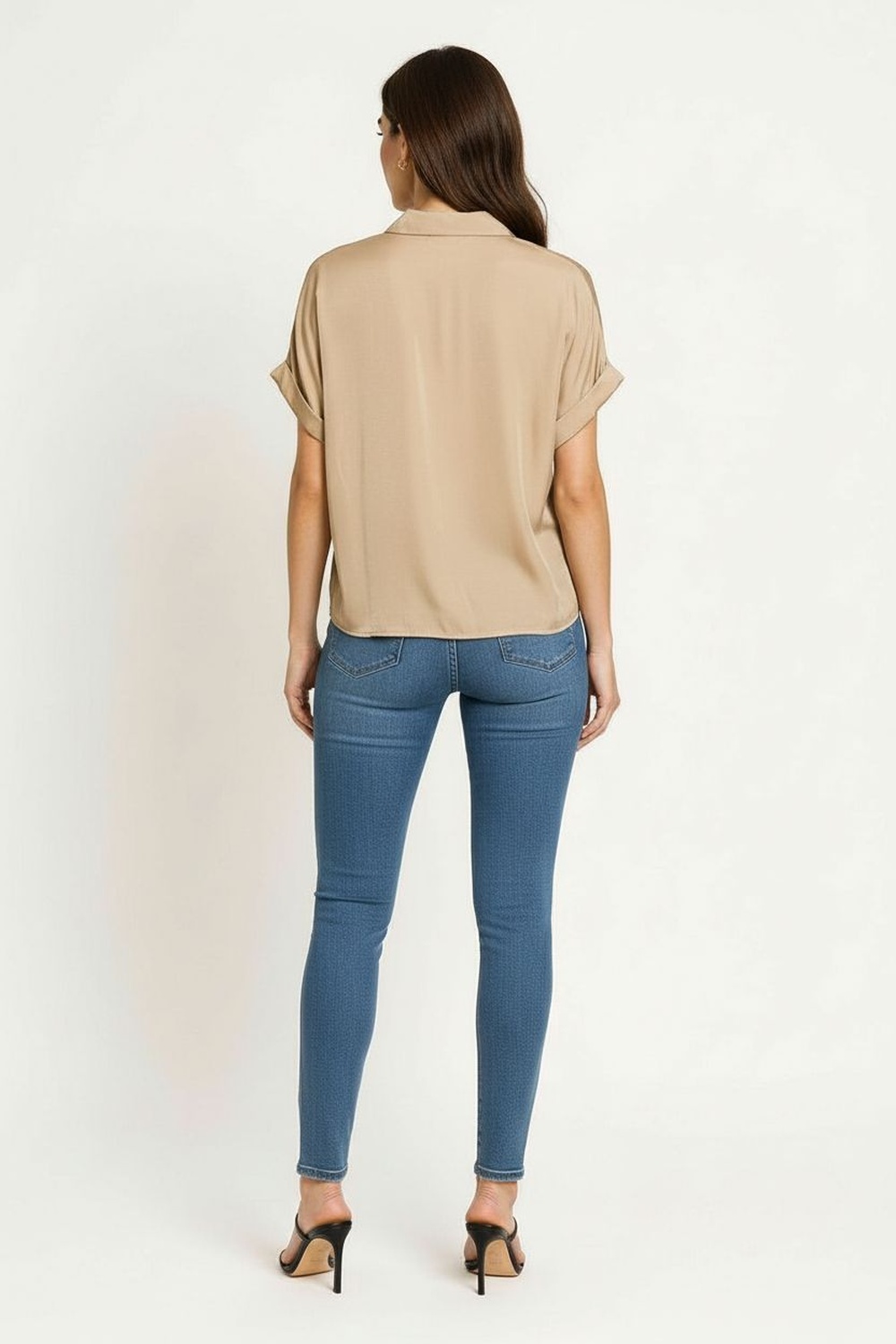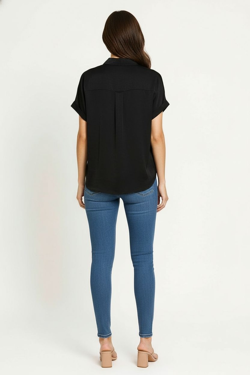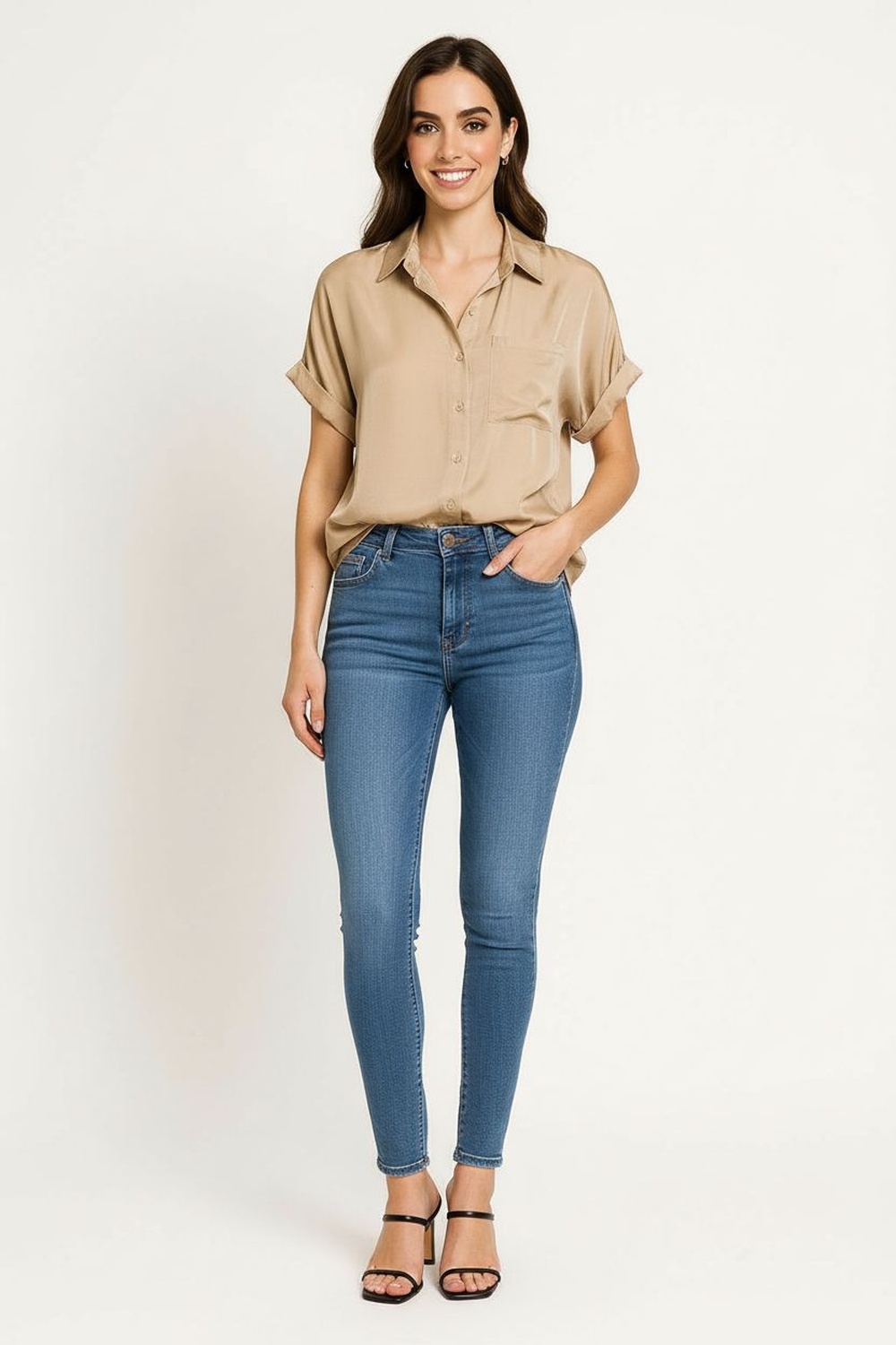 Blusa camisera con cuello clásico y botonadura al frente que aporta un toque refinado, manga corta doblada con terminación limpia, bolsillo delantero funcional, confección en tejido fluido con caída natural que asegura confort y frescura en cualquier ocasión