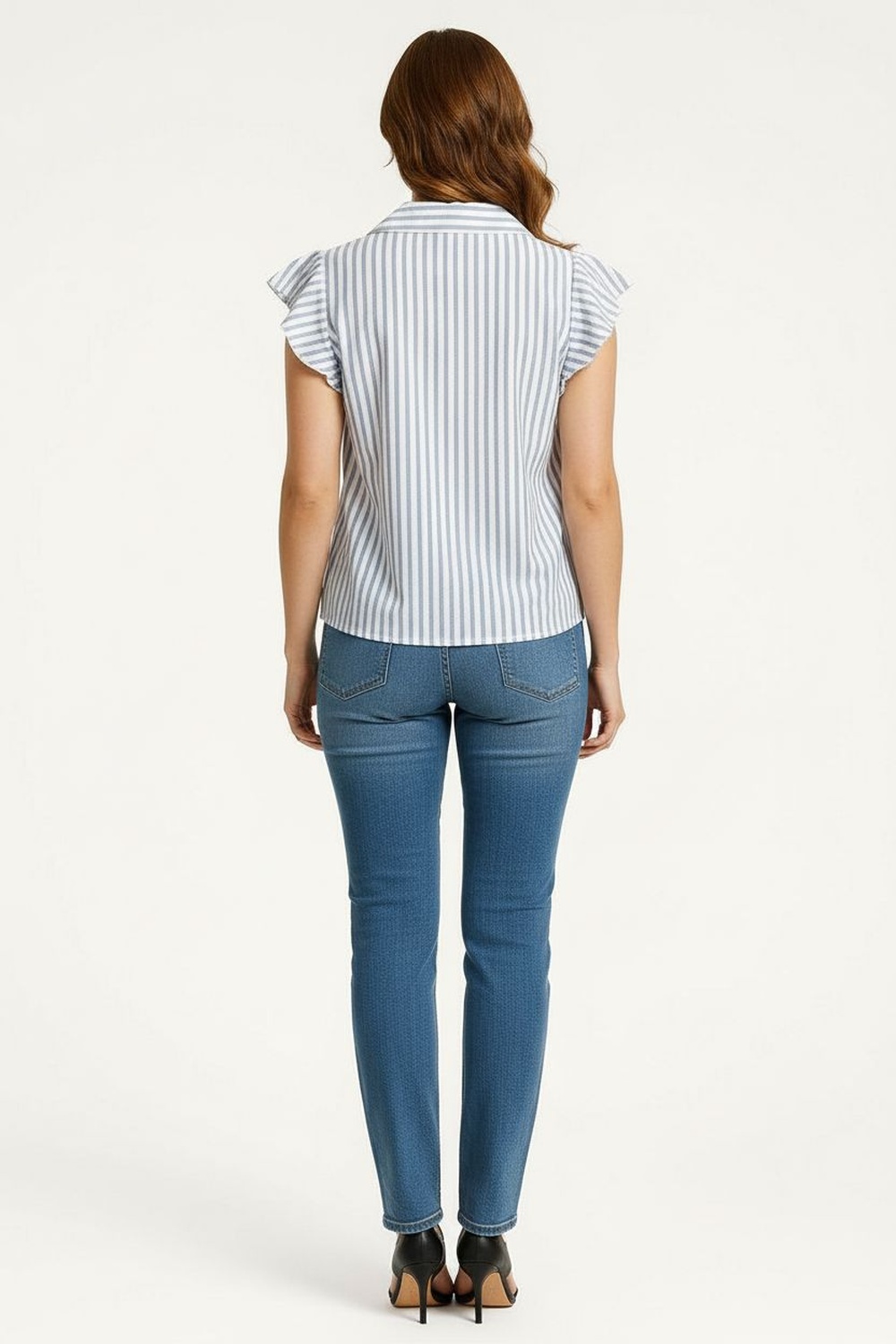 Blusa camisera de manga corta con botonadura frontal funcional, cuello clásico estructurado que aporta presencia, aplicación de bordado integrado en el tejido que añade detalle fino, olanes ligeros en hombros que brindan volumen discreto, corte recto que permite caída natural y comodidad al movimiento