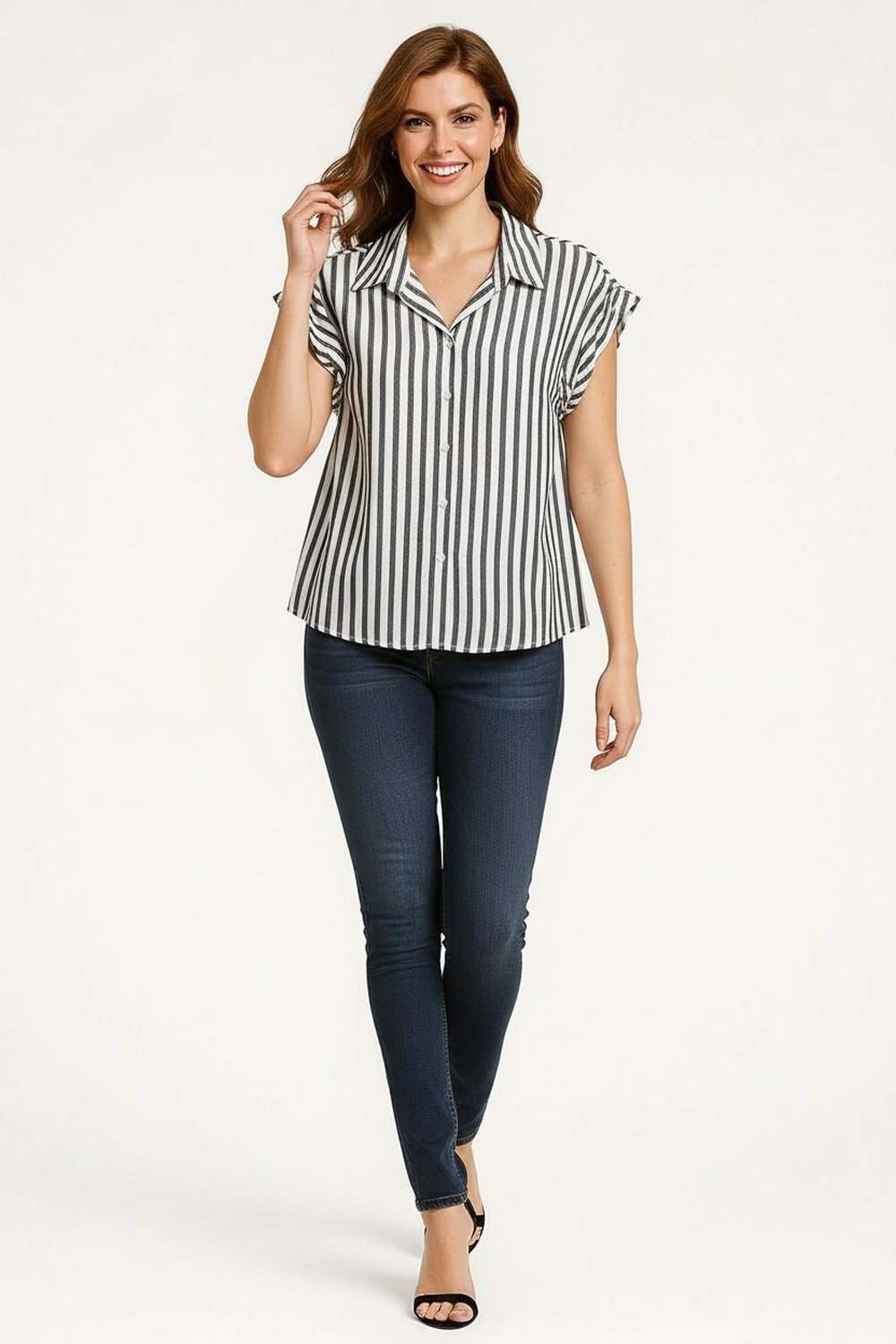 Blusa tipo camisera con cuello clásico, botonadura frontal, manga corta, corte recto, confección ligera, caída natural