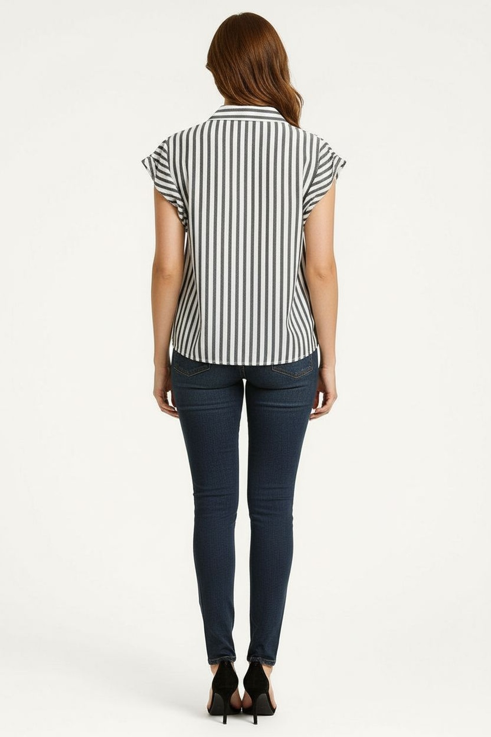 Blusa de manga corta con escote en V y botonadura frontal que permite ajuste práctico, corte amplio que brinda comodidad en el torso, confección en tela ligera de caída suave que aporta frescura, terminados delicados en cuello y mangas que mantienen estructura definida