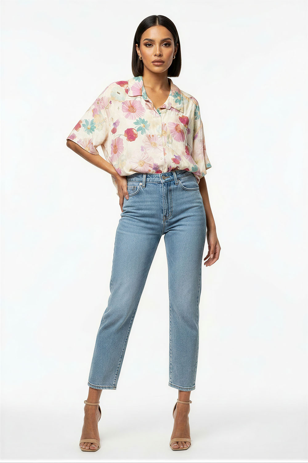 Blusa tipo camisera con cierre frontal de botones que facilita el uso, cuello clásico que aporta estructura, manga corta que brinda frescura, corte recto que permite libertad de movimiento, confección ligera con acabado suave al tacto, diseño funcional para uso diario