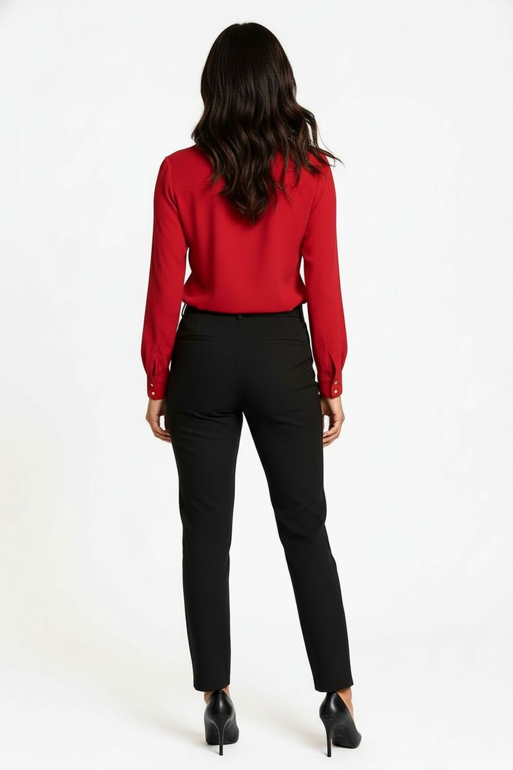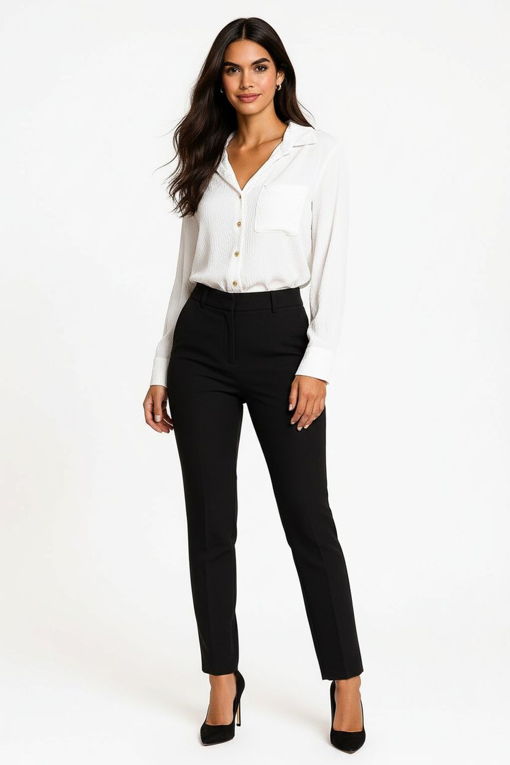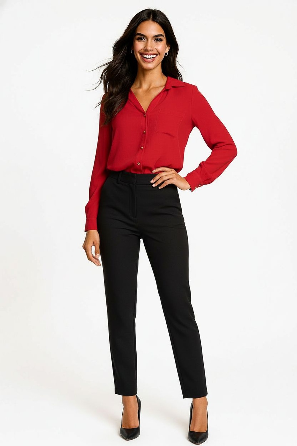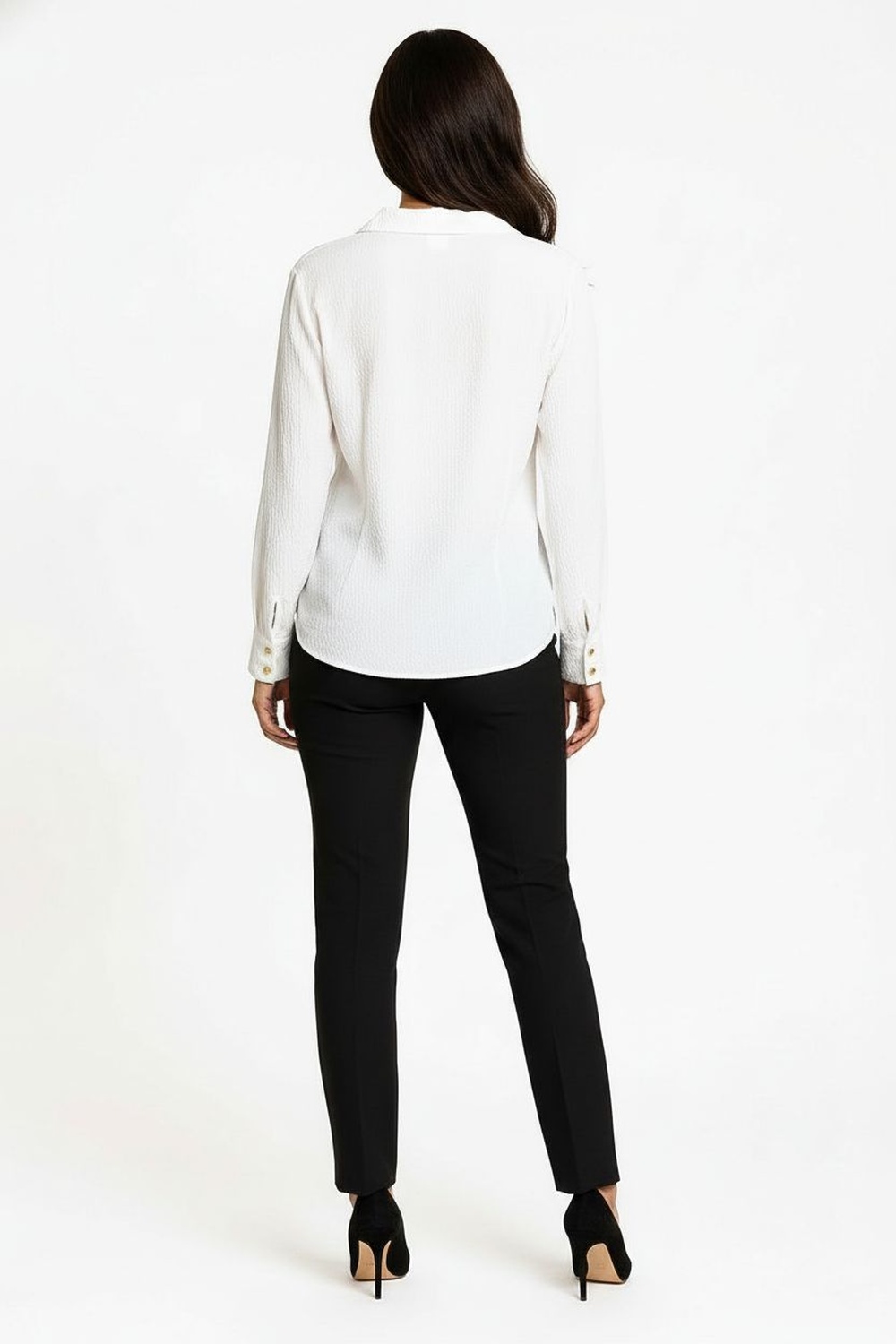 Blusa de manga larga con cuello clásico y cierre frontal de botones metálicos, corte relajado que permite libertad de movimiento, pinzas sutiles que aportan estructura, puños con abotonado que mejoran el ajuste, tejido ligero de textura suave ideal para uso diario