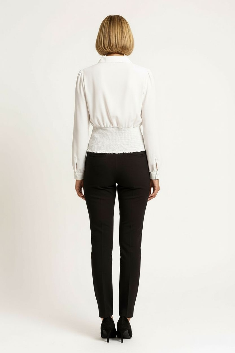 Blusa tipo camisera con cuello estructurado, manga larga con puño, botonadura frontal, ajuste en cintura y detalle de broche decorativo en cuello, silueta definida