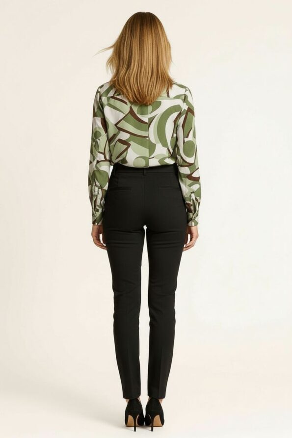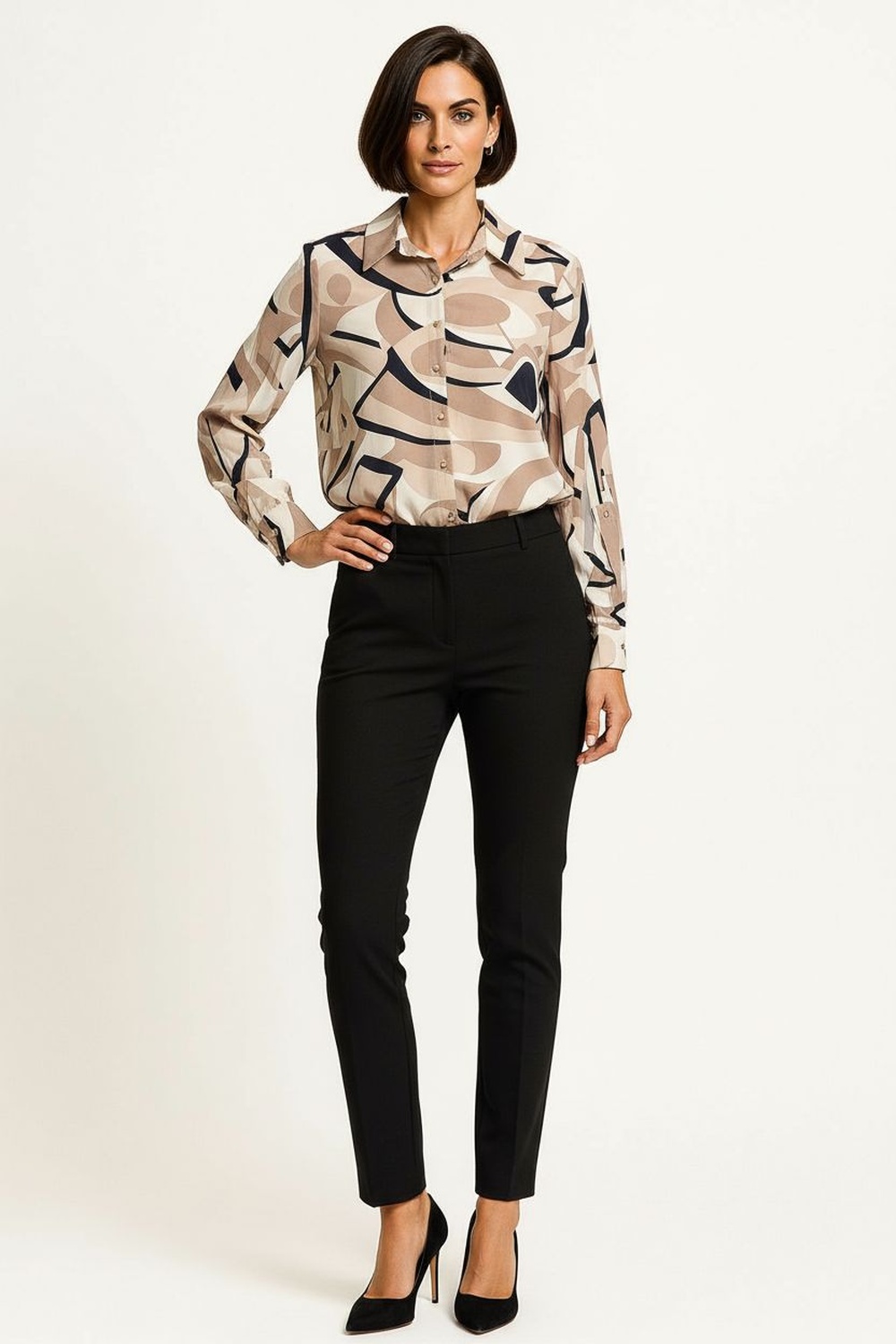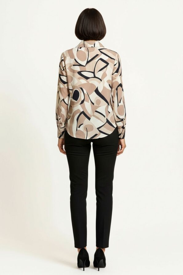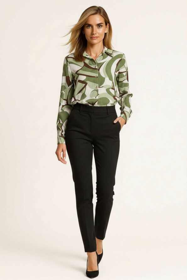 Blusa de manga larga con cuello camisero que aporta un estilo formal y versátil, charreteras en los hombros que realzan el diseño y brindan un detalle distintivo, botonadura frontal que permite un ajuste práctico y elegante, confección en tela ligera de caída suave que favorece la movilidad y comodidad en cada uso