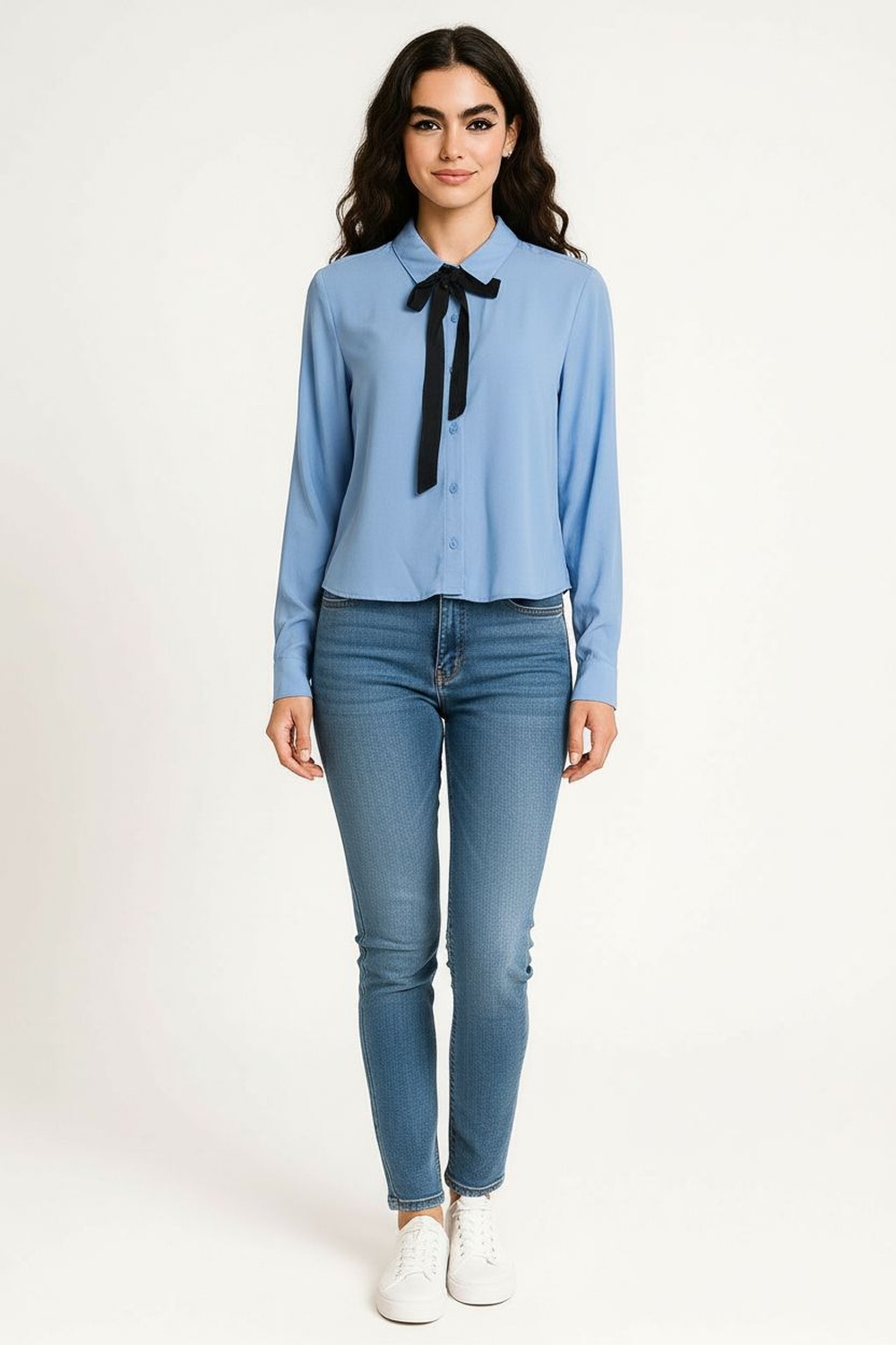 Blusa de manga larga con cuello camisero estructurado, detalle de corbata integrada al frente que aporta presencia y sofisticación, botonadura frontal funcional para ajuste práctico, corte recto que brinda comodidad durante el uso, confección en tejido ligero de tacto suave con caída natural, terminaciones limpias que elevan la apariencia de la prenda