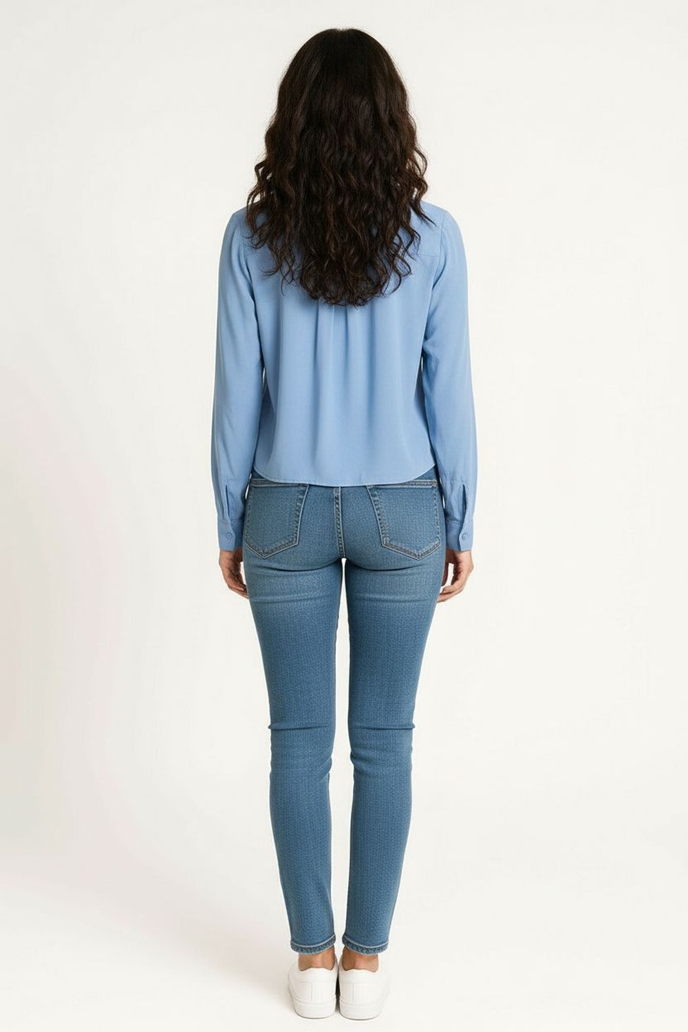 Blusa camisera corta con solapa clásica y botonadura frontal, bolsillo aplicado que agrega detalle funcional, manga larga con puño estructurado, confección en tejido suave con caída ligera que mantiene buena estructura, dobladillo recto que aporta acabado limpio